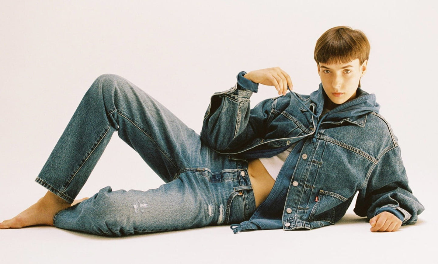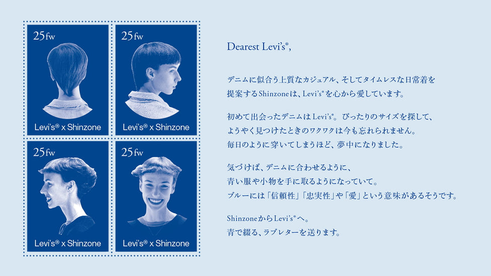 ジャケットの後ろ身頃には、“Thank you for being the one and only. With love, always.xxx” パンツの後ろ身頃のウエストベルトには、“Can’t get enough of you. xx” ブラックデニムに黒い糸で刺繍を入れることで、最初は目立たず、何度も着用して洗いをかけていくことで少しずつ存在感が増していく。ともに過ごす時間の中で、真の愛が少しずつ姿を現す ――そんな想いを込めています。ベースとなったのは、1930 年代に生まれた、 通称“ファーストモデル” で知られる名 作「1936 Type I Tracker Jacket」と、マリリン・モンローも愛した女性初の5ポケットジーンズ「701」。