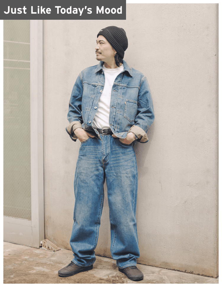 トレンドを意識したルーズなセットアップスタイル。上下ともにウォッシュ加工が施されたヴィンテージライクな風合いで、雰囲気たっぷり。