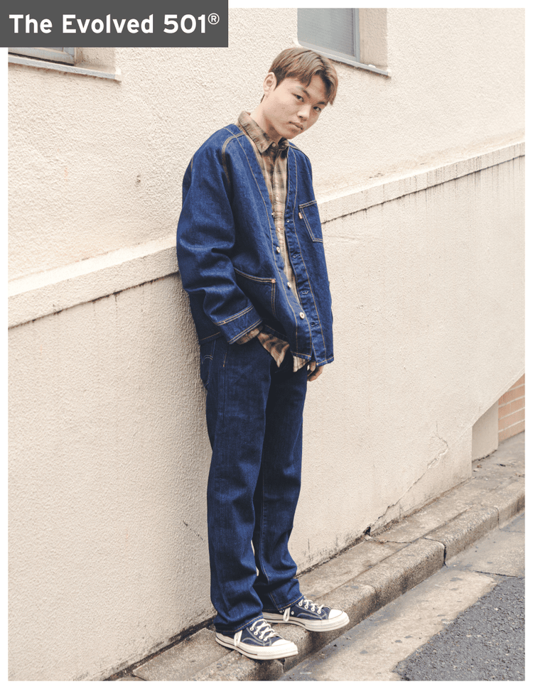 軽やかな着心地とミニマルなデザインが魅力のSCOUTジャケットに、ヴィンテージライクな501®を合わせたスタイル。