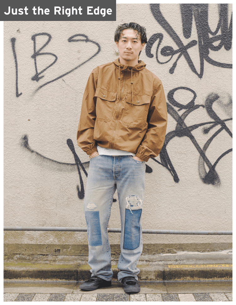 ストリート感溢れるナイロンジャケットに、ウォッシュ&ダメージ加工の効いた501®を合わせた王道カジュアル。