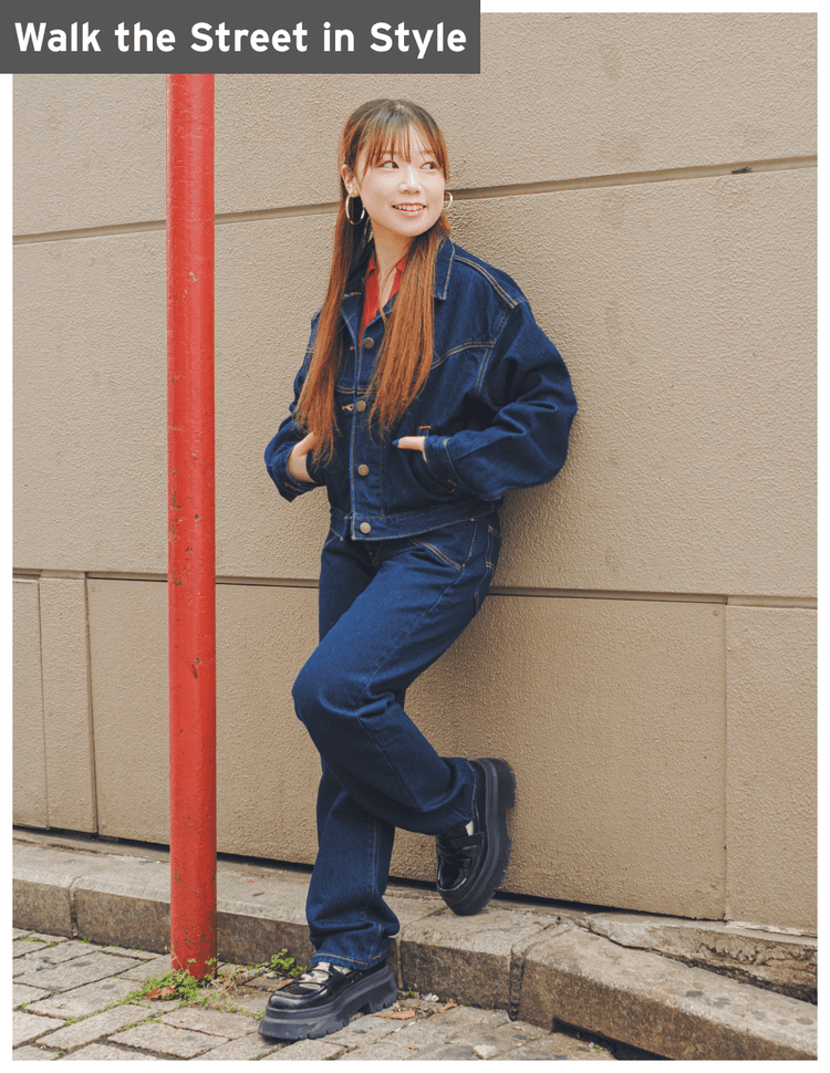 メンズライクなエッジを融合させたデニムセットアップ。ウエストが程よくルーズなジャケットと、バギーシルエットのボトムスでスタイルアップ効果も抜群。