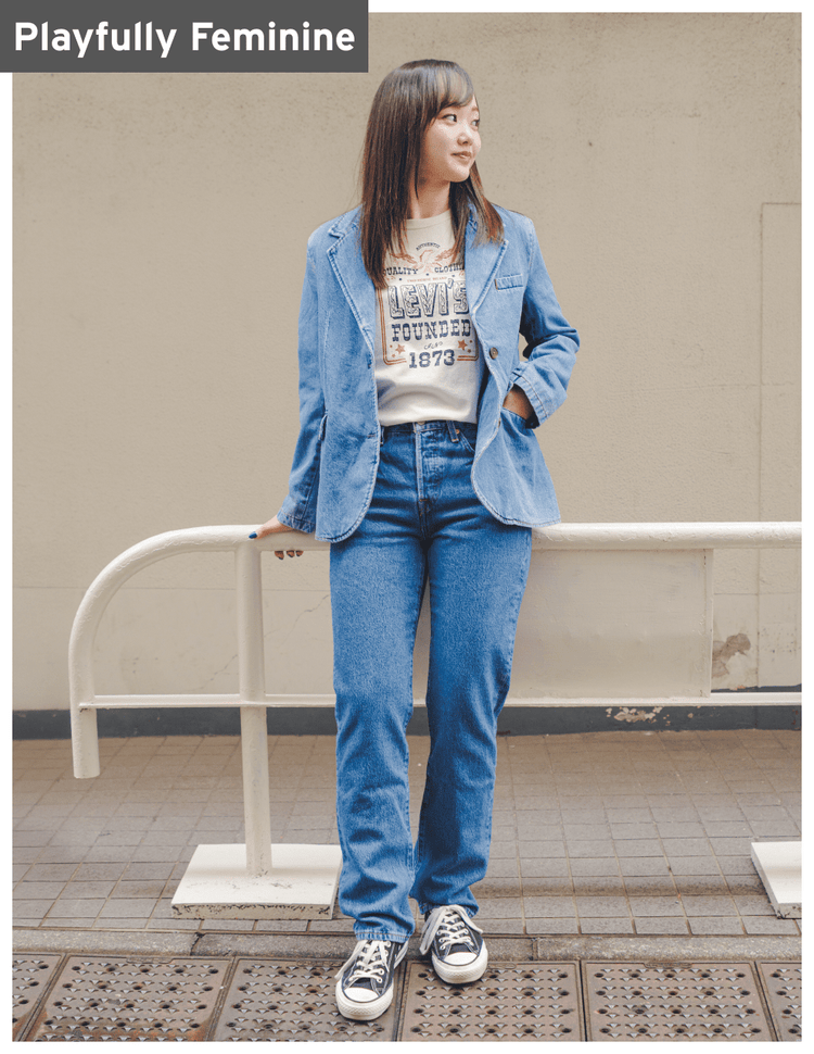 きちんと感のあるデニムのテーラードジャケットに、ポップなグラフィックTを合わせたミックススタイル。