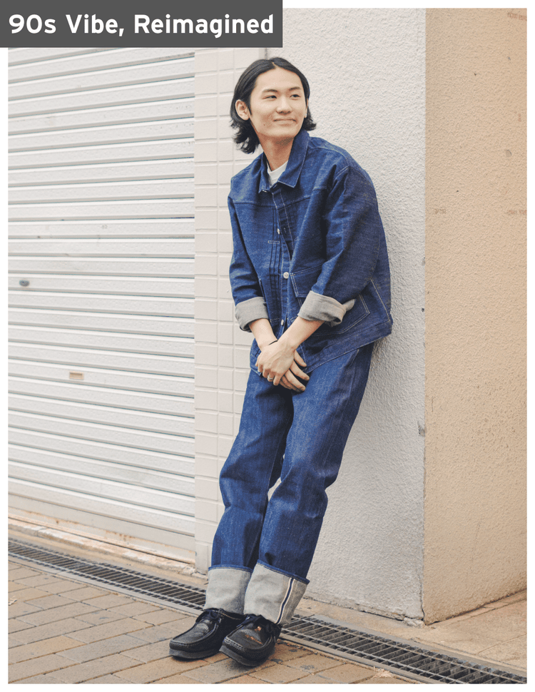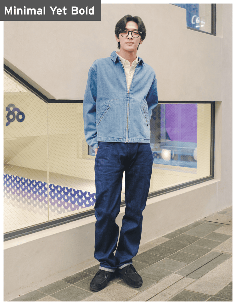 端正なデニムジャケットと同素材のボトムスを合わせたセットアップスタイル。シルエットはややオーバーサイズ気味に仕上げ、インナーにはミニマルな白Tシャツを差し込むことで、抜け感のある着こなしに。
