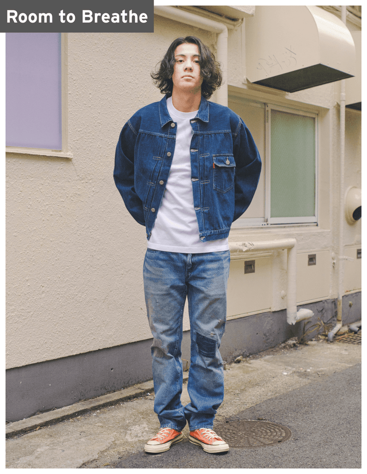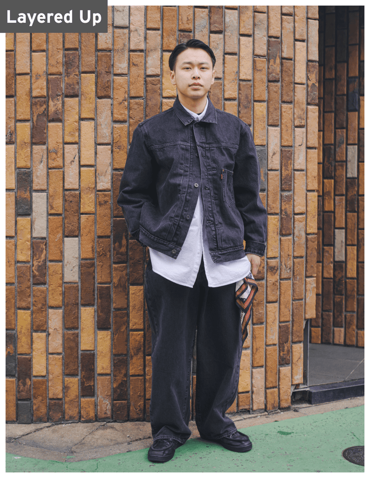 クラシックなボタンダウンシャツに、ウォッシュの効いたTYPE I ブラックトラッカージャケットを羽織り、ルーズな578™ バギージーンズでボリュームを出した王道ストリートスタイル。