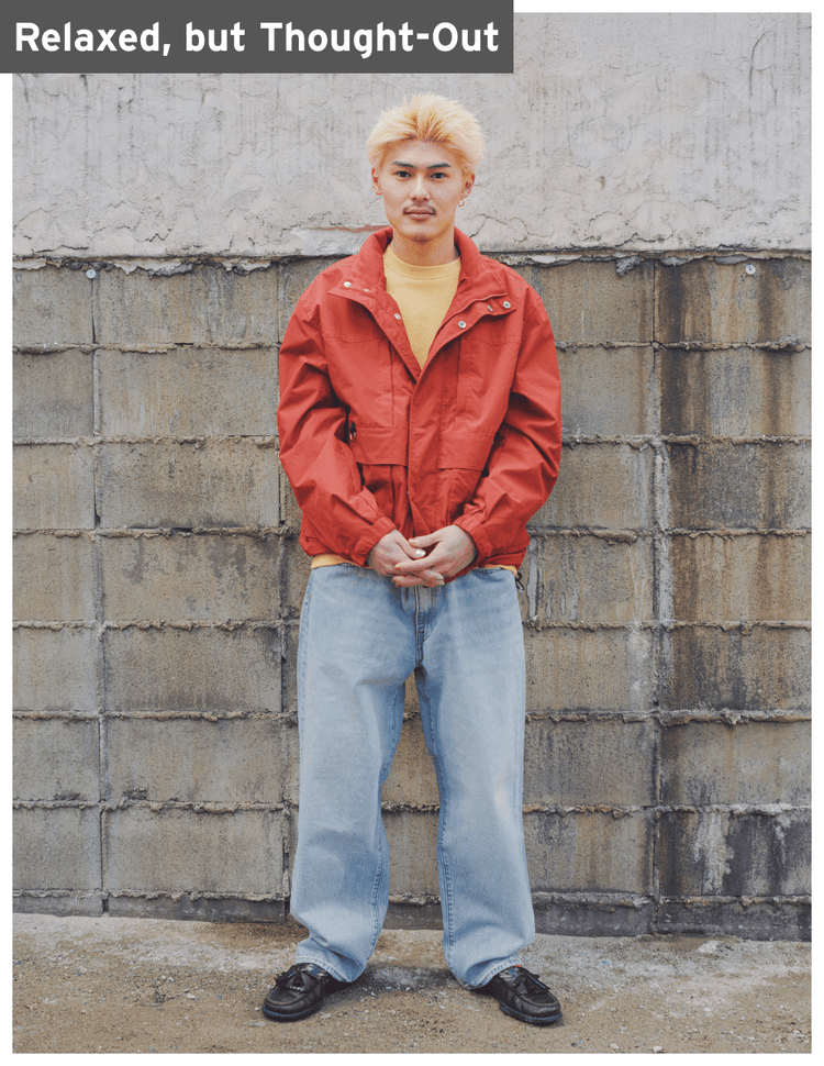 カラーリングが映えるように、セットアップであえて全体をミニマルにまとめた、大阪ストリート×ワークの最適解。