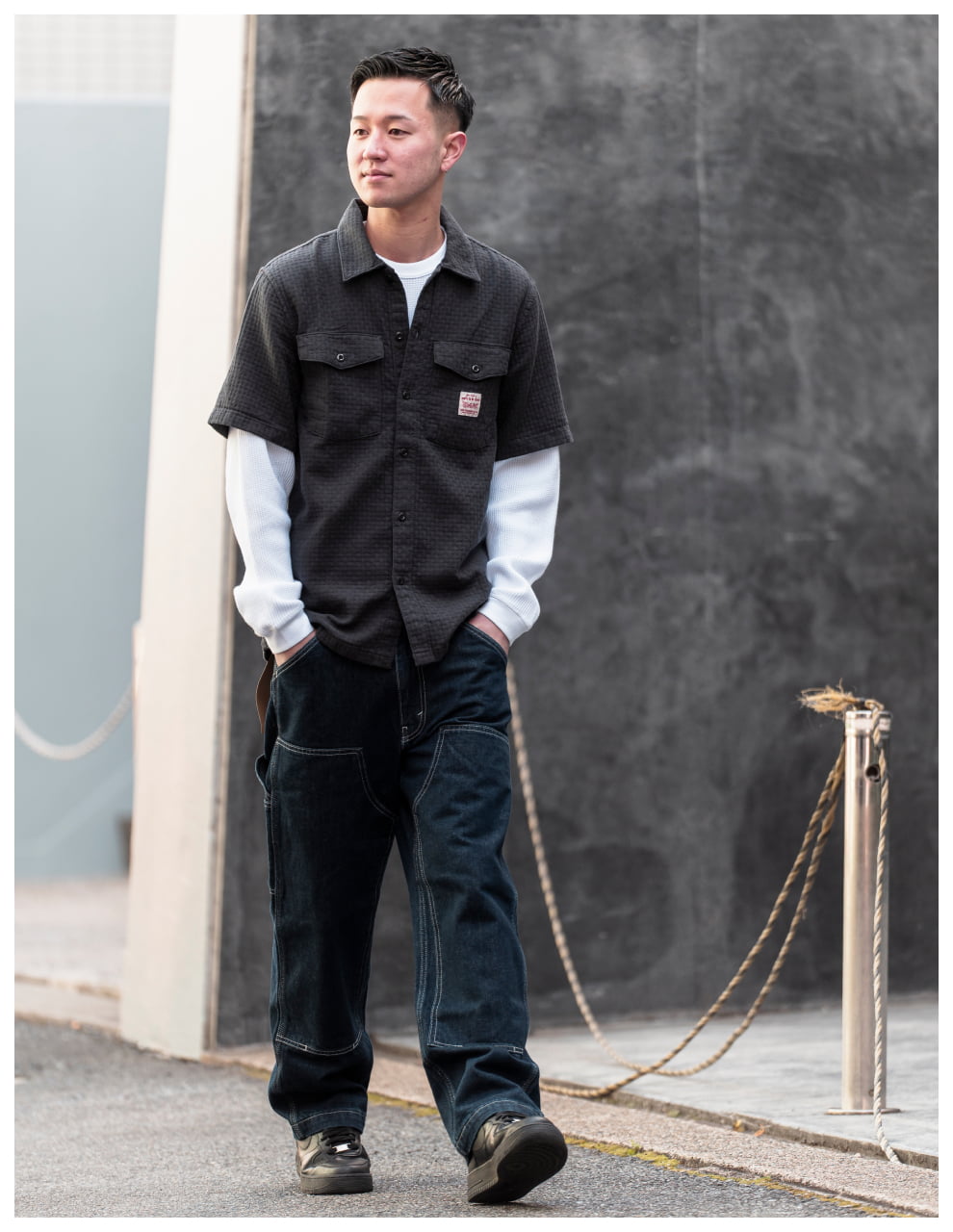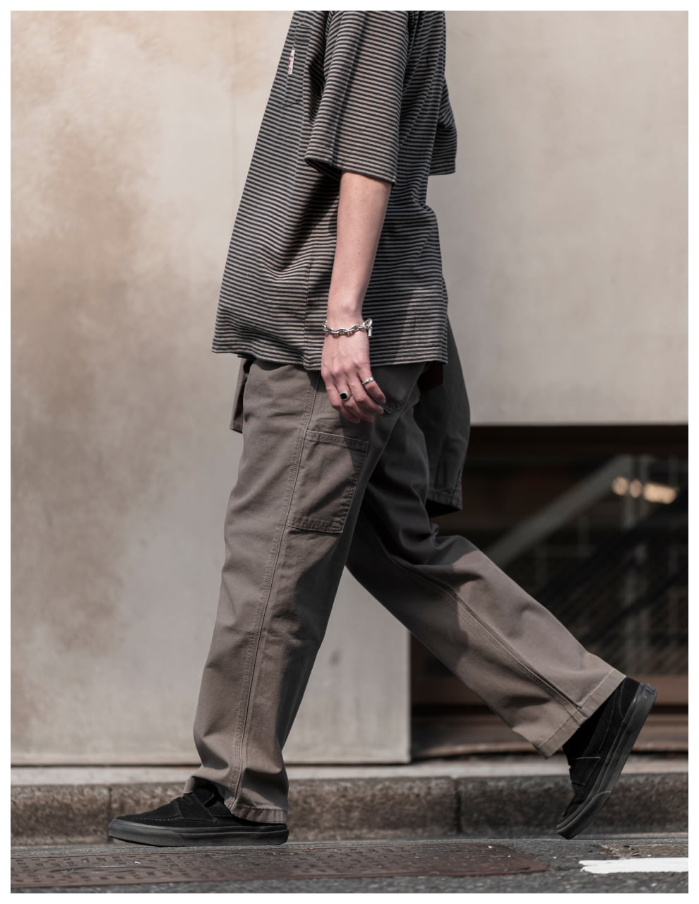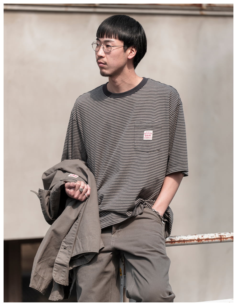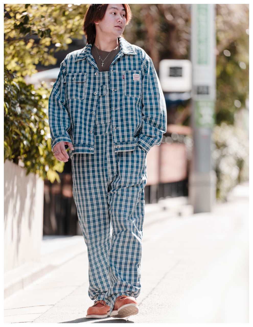 ライトトーンのWORKWEARのセットアップが、無骨な街並みの中で柔らかく存在感を放つスタイル。素材のニュアンスが表情をつくり、都会的な余裕を感じる一着に。