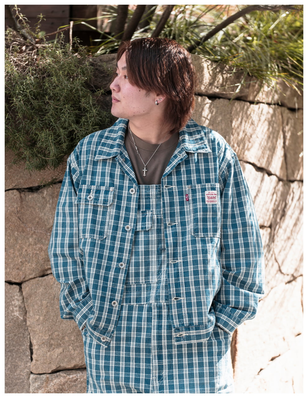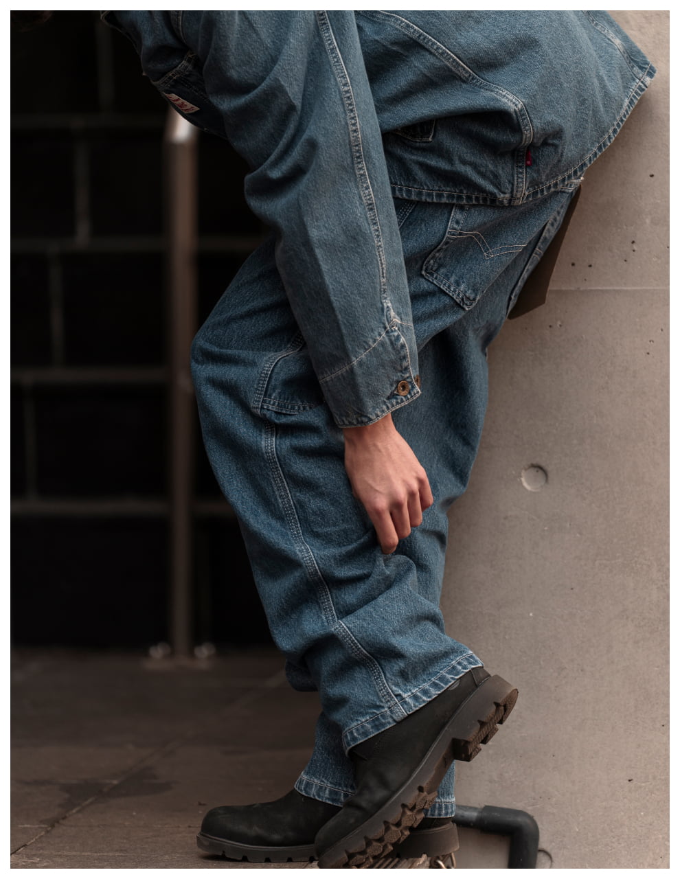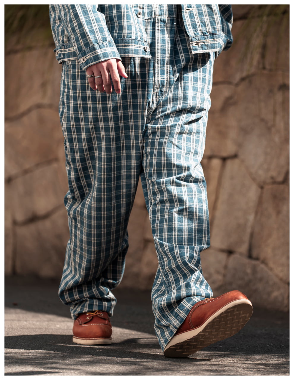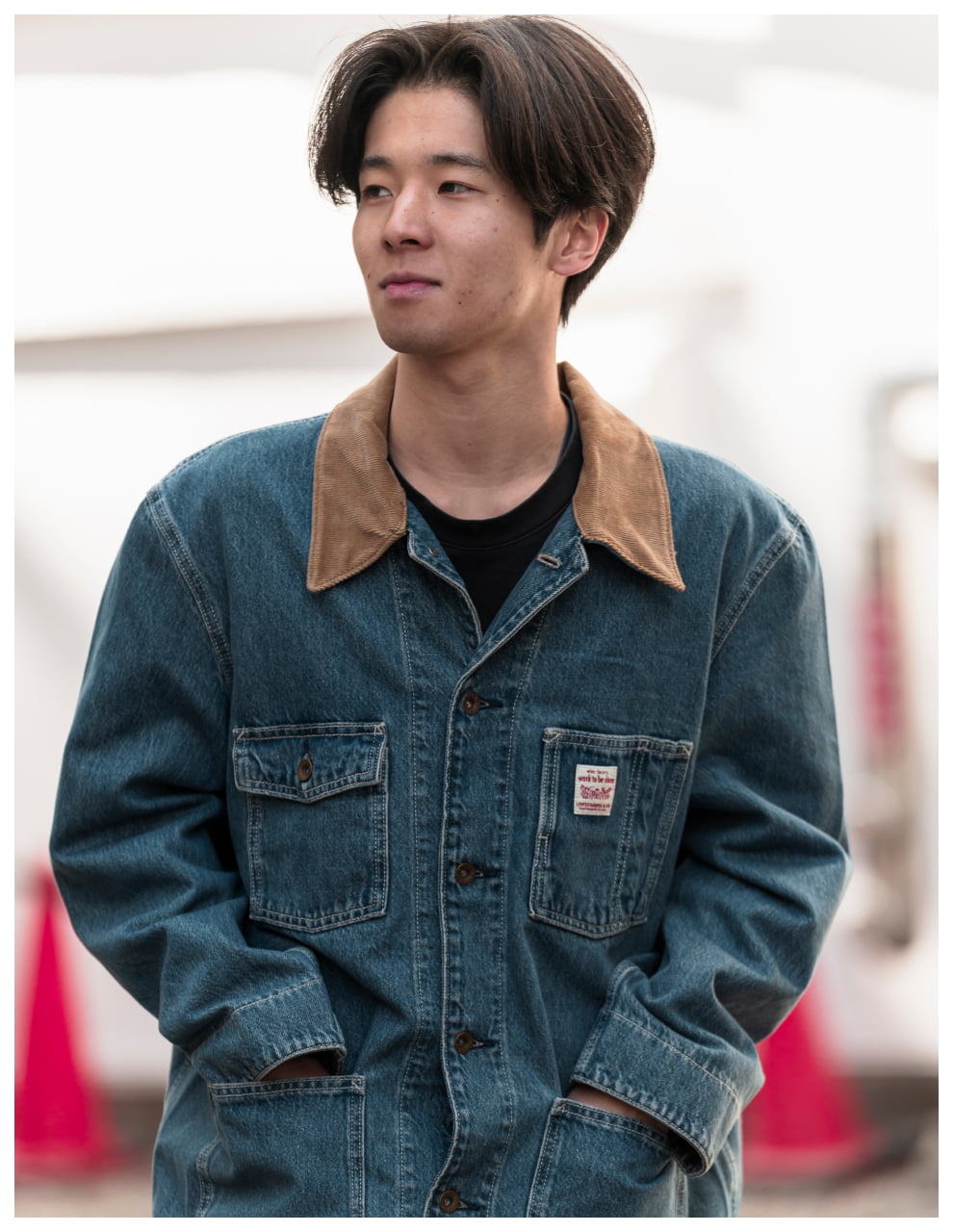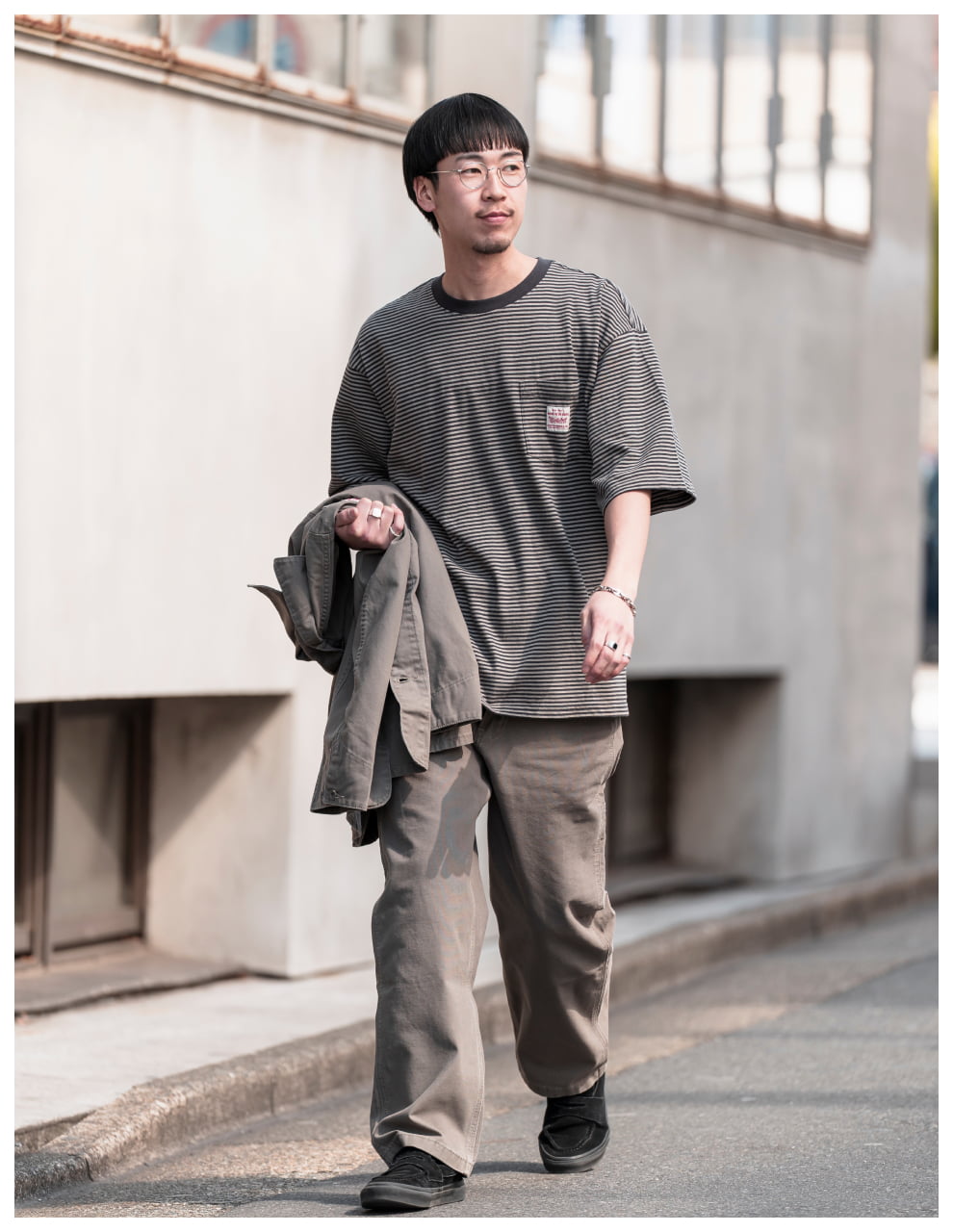 ライトトーンのWORKWEARのセットアップが、無骨な街並みの中で柔らかく存在感を放つスタイル。素材のニュアンスが表情をつくり、都会的な余裕を感じる一着に。