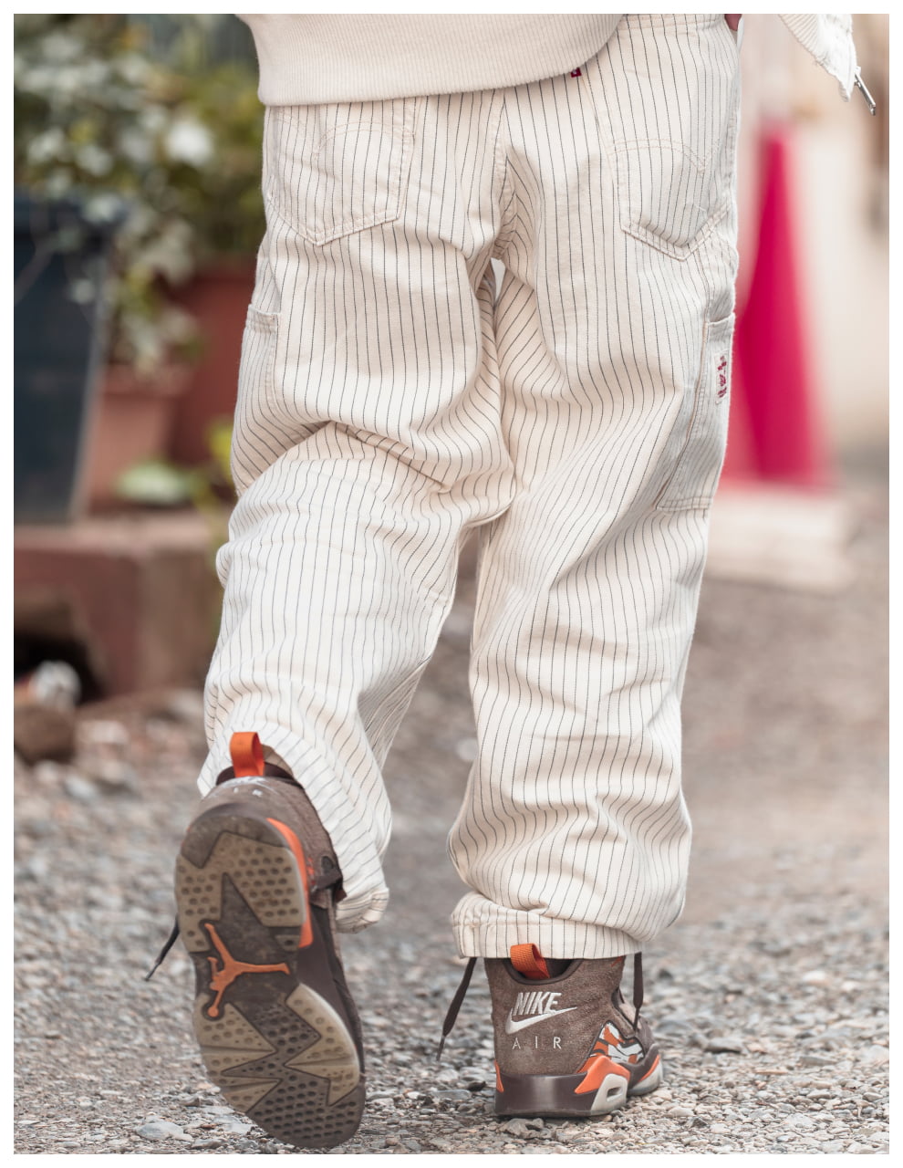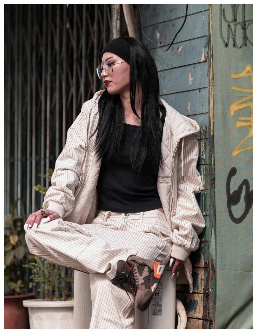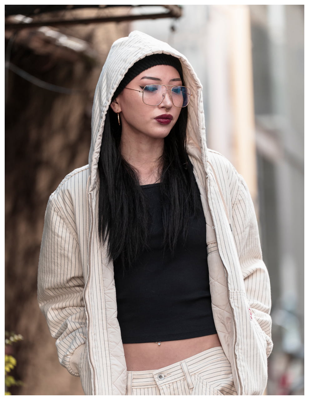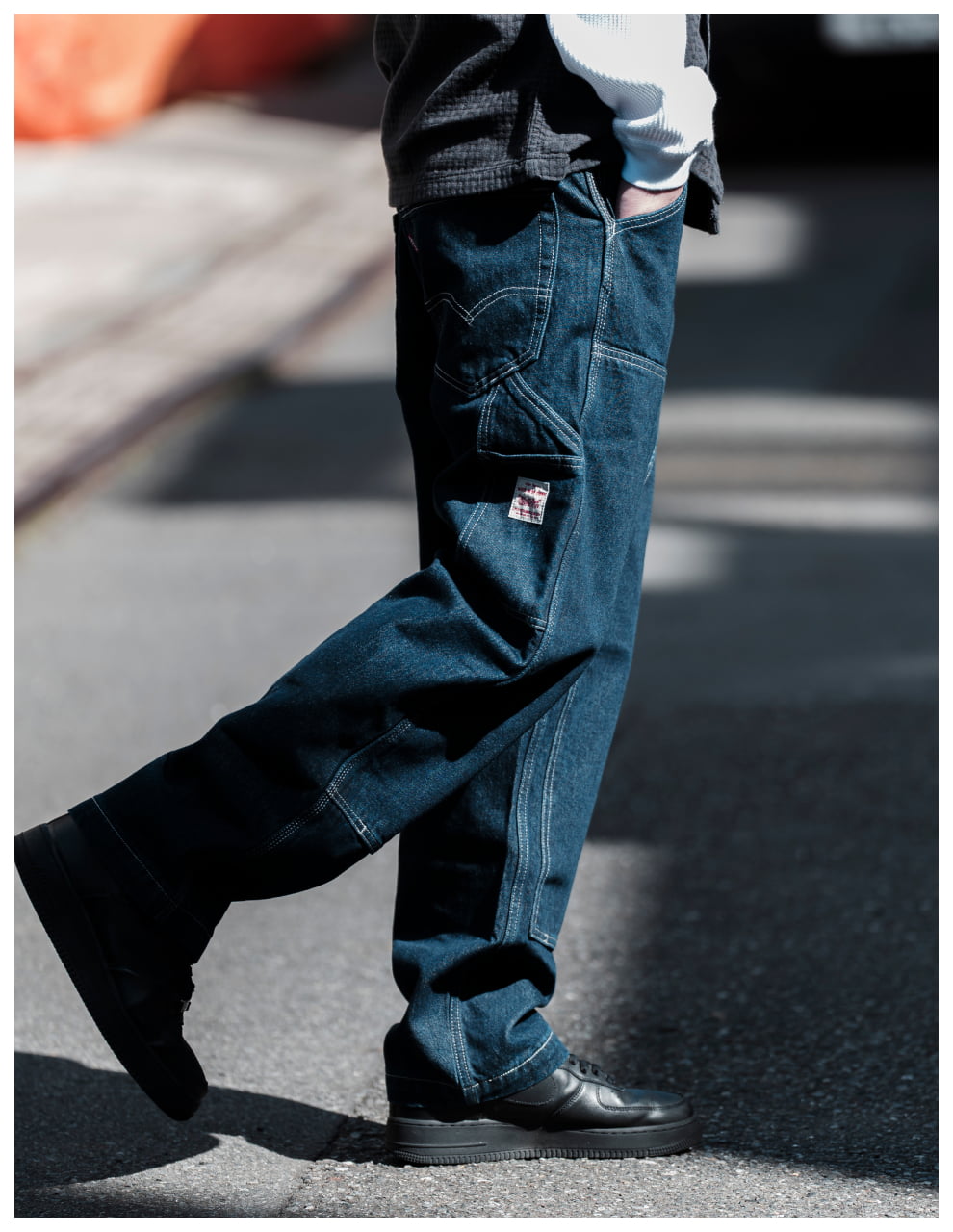 ライトトーンのWORKWEARのセットアップが、無骨な街並みの中で柔らかく存在感を放つスタイル。素材のニュアンスが表情をつくり、都会的な余裕を感じる一着に。