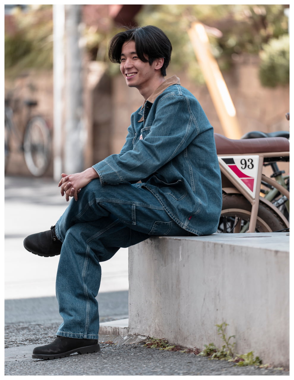 デニムのセットアップを穏やかにまとめたスタイル。やわらかな素材感が際立ち、リラックスしたムードで楽しめるワークルックに。