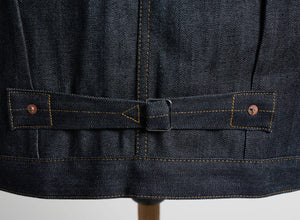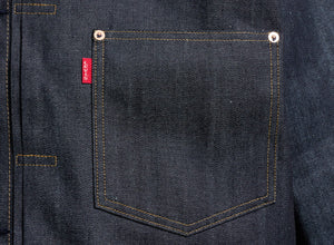 襟の内側に入ったタグに記される通り、生地も縫製も日本製による今回の復刻。13.3ozの生地を使用しており、ヴィンテージのような風合いを再現できるよう設計された赤耳セルビッジデニムです。