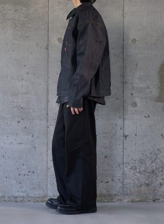 第二次世界大戦期(19421946年)における米国政府の物資・物価統制の影響を強く受けた、通称「大戦モデル」。ポケットはフラップを省略、フロントボタンも1つ減らし4つに変更されています。各パーツもメーカー自体が制約を受けていたためシンプルなものに変更されており、軍需品の資源確保の為の金属・糸・布の使用量の削減や、物価の安定の為に様々な制限の中で生まれた仕様であり、当時のLevi’sが直面していた制約をそのまま体現しています。本復刻モデルは2枚袖のバージョンとなります。XXL(46)サイズはTバック仕様となっており、その特徴的な見た目がファンを魅了しています。