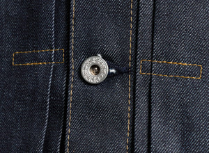衣料品用のパーツメーカーは銅が使用禁止になり、金属ボタンの種類自体にも規制が入ったためそれによって、社名の刻印がないリースボタン(月桂樹ボタン)や上部に穴の空いたボタン(ドーナツボタン)のみしか供給されなくなりました。本復刻モデルでは月桂樹ボタンを採用しています。