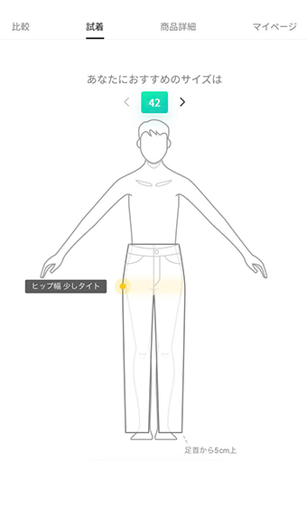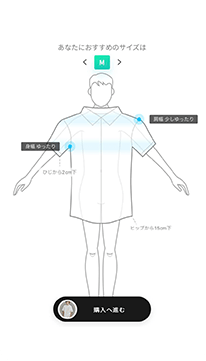 ご自身の身長等の情報をVIRTU-SIZEに登録すると試着した時のサイズ感がイラストでわかります。