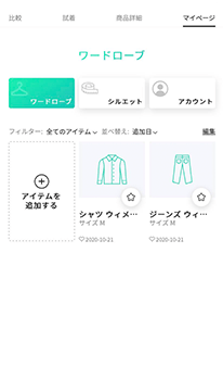 VIRTUSIZEへアカウント登録をすると、ワードローブに今までに採寸したアイテムが登録できるので簡単に比較ができます。