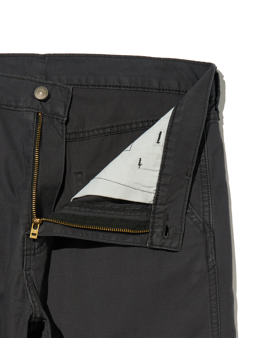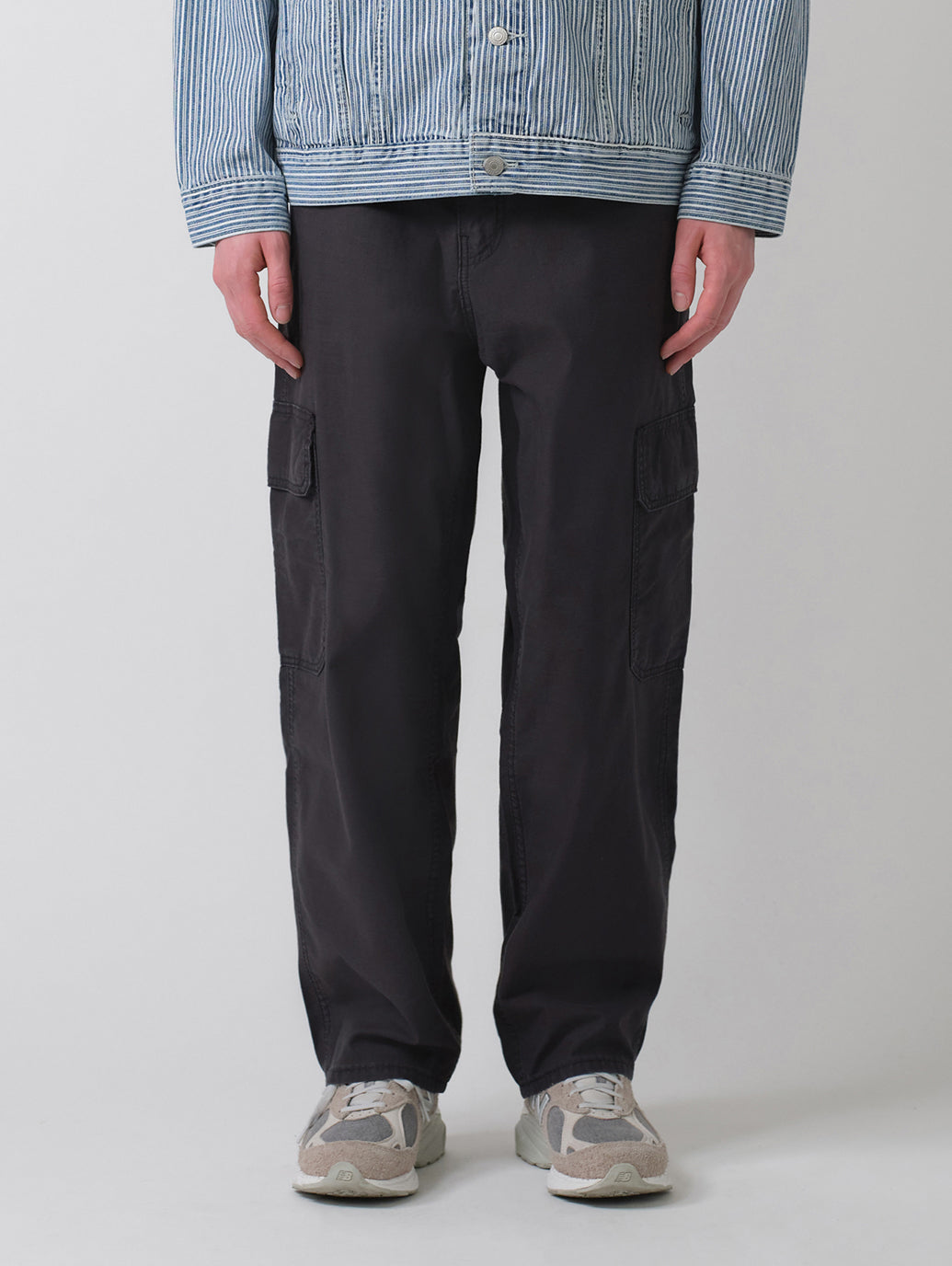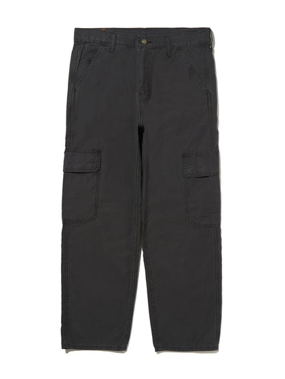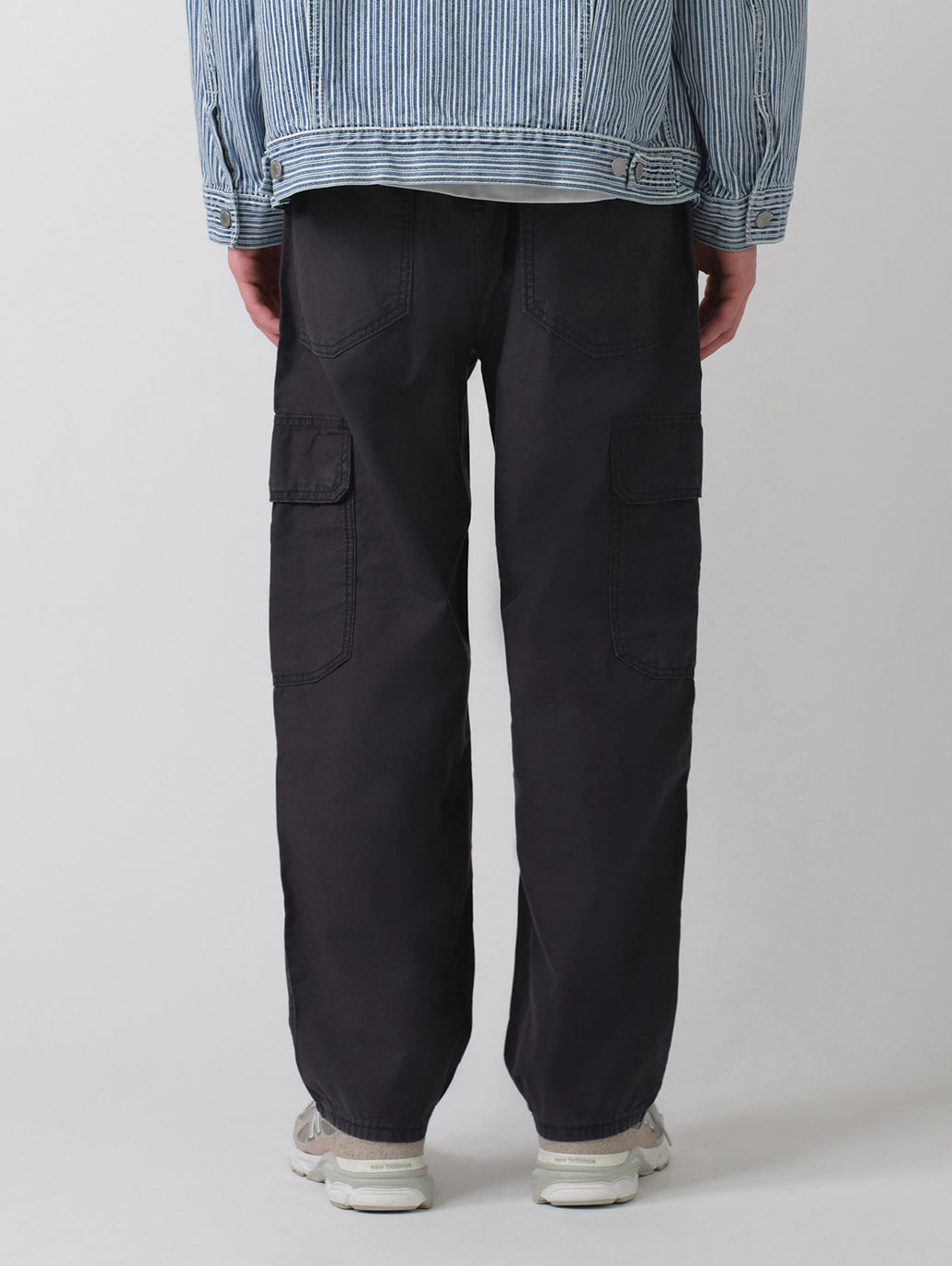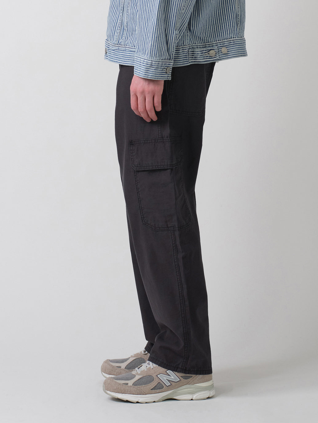 近年の90'sのリバイバルとしてその名の通りルーズでゆったりとしたストレートシルエットにワークテイストを落とし込んだパンツです。耐久性のある綿100%のブラックユーズドカラーの生地、通常の5ポケットに加え2つのカーゴポケットが配されているのが特徴です。ファッションアイテムとしてのみならず作業着としても活躍する一本です。