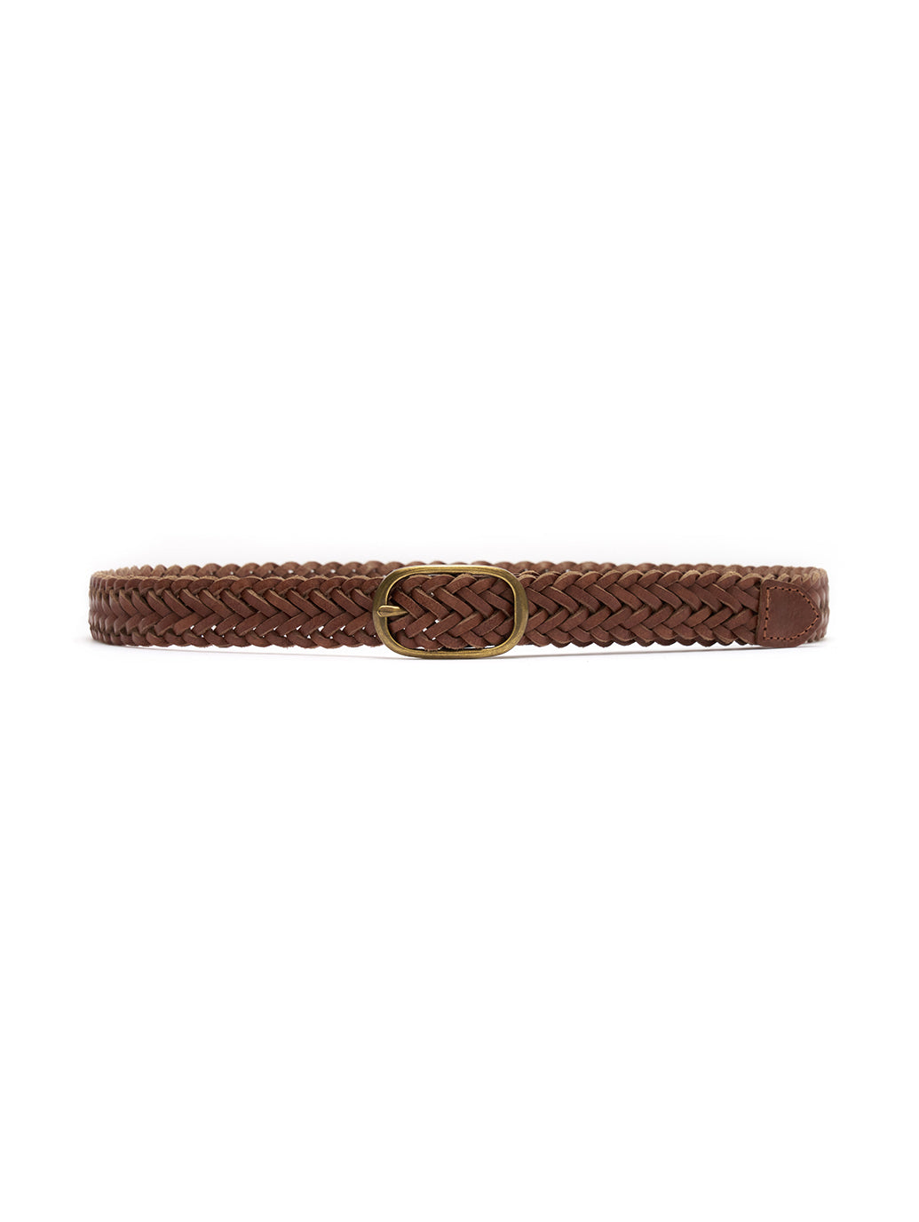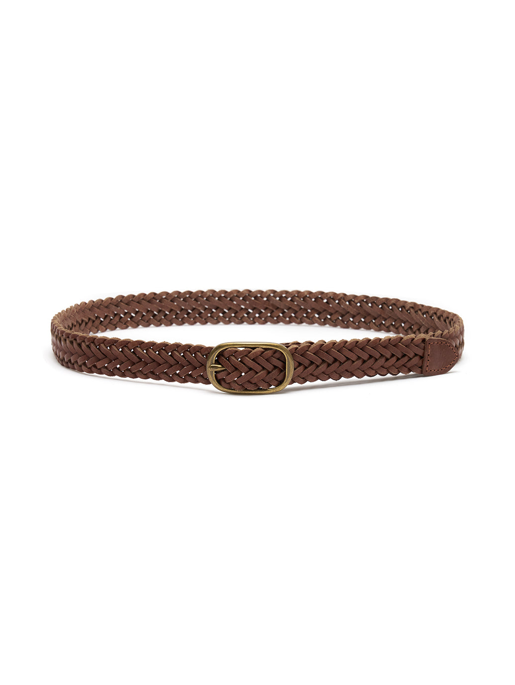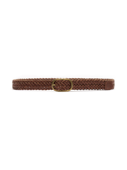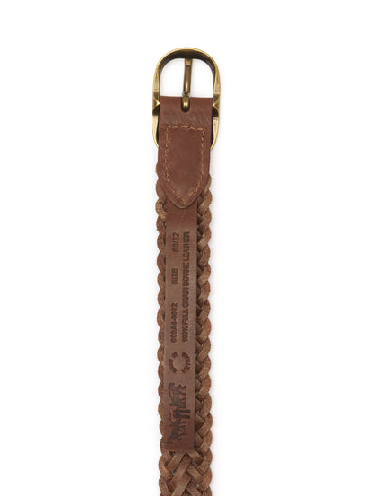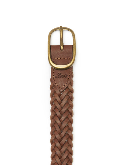 フルグレインレザーで作られたダークブラウンカラーのベルト。編込みタイプ、ゴールドのバックルでスタイリッシュなデザインです。ウエスト調整もしやすくシンプルな着こなしのアクセントとしても活躍するアイテムです。