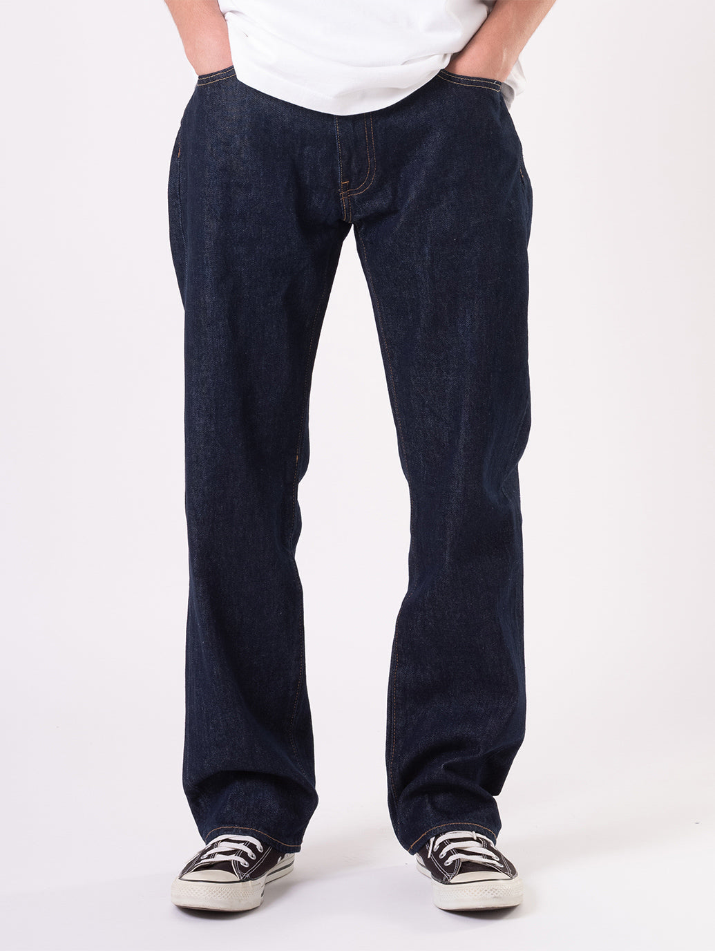 リラックス感のあるゆったりとしたストレートシルエットのパンツ。耐久性に優れた綿100%の生地、定番のリンスカラーが特徴です。幅広いスタイリングに合わせやすいのは勿論、経年変化を楽しみながら穿ける一本です。