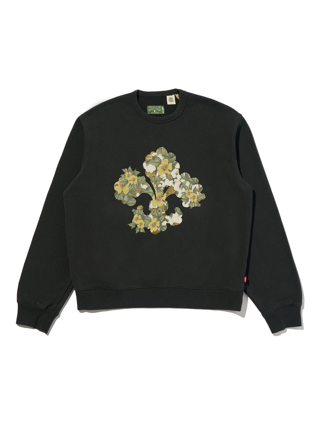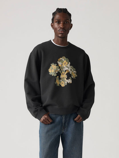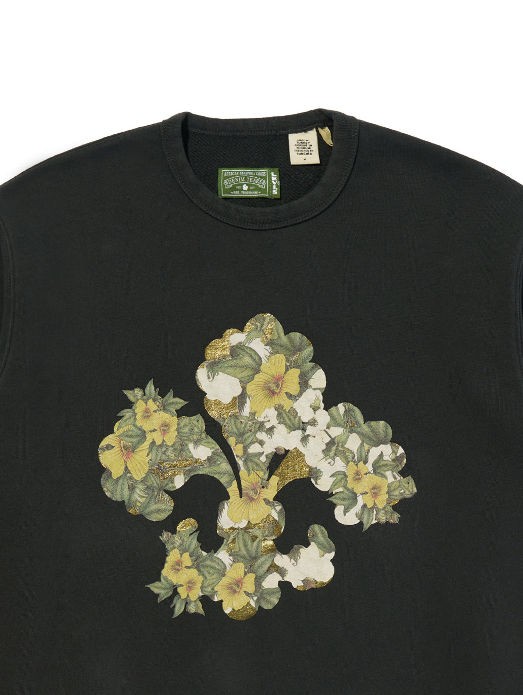このクルーネックスウェットシャツは、ウォッシュ加工を施したブラックのベースと、ユニークなコットン製のフルールドリスのアートワークが特徴です。