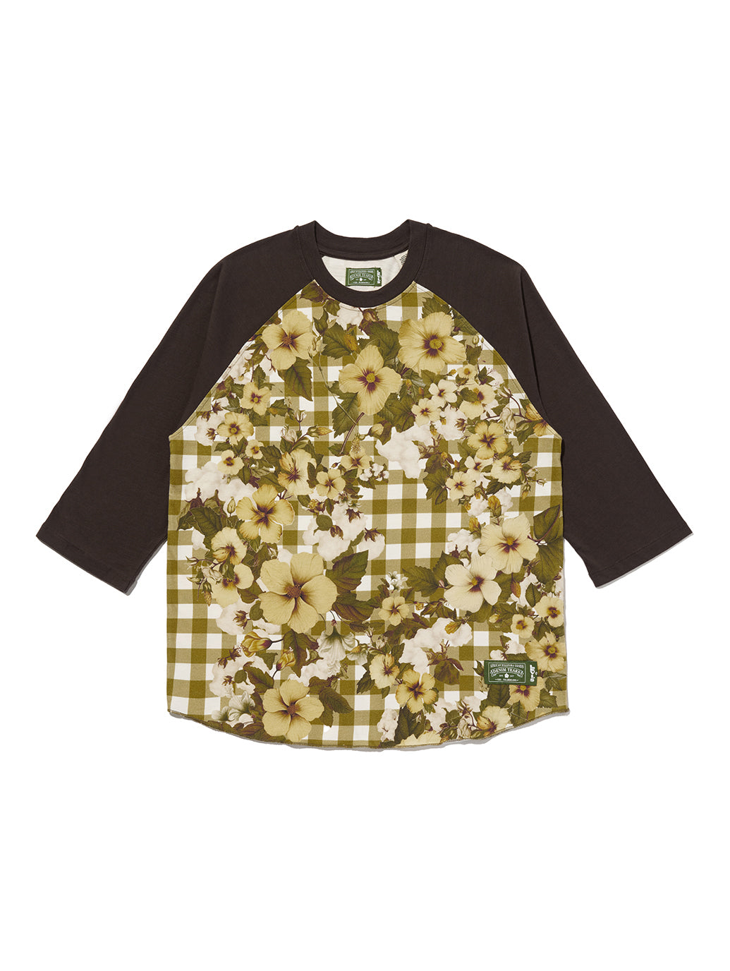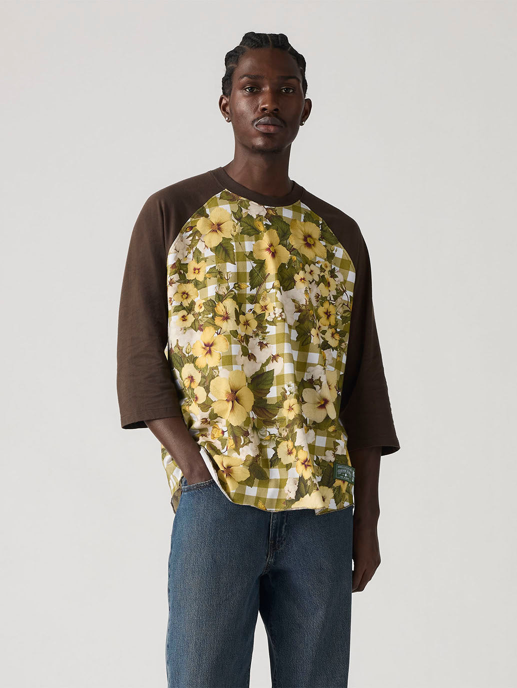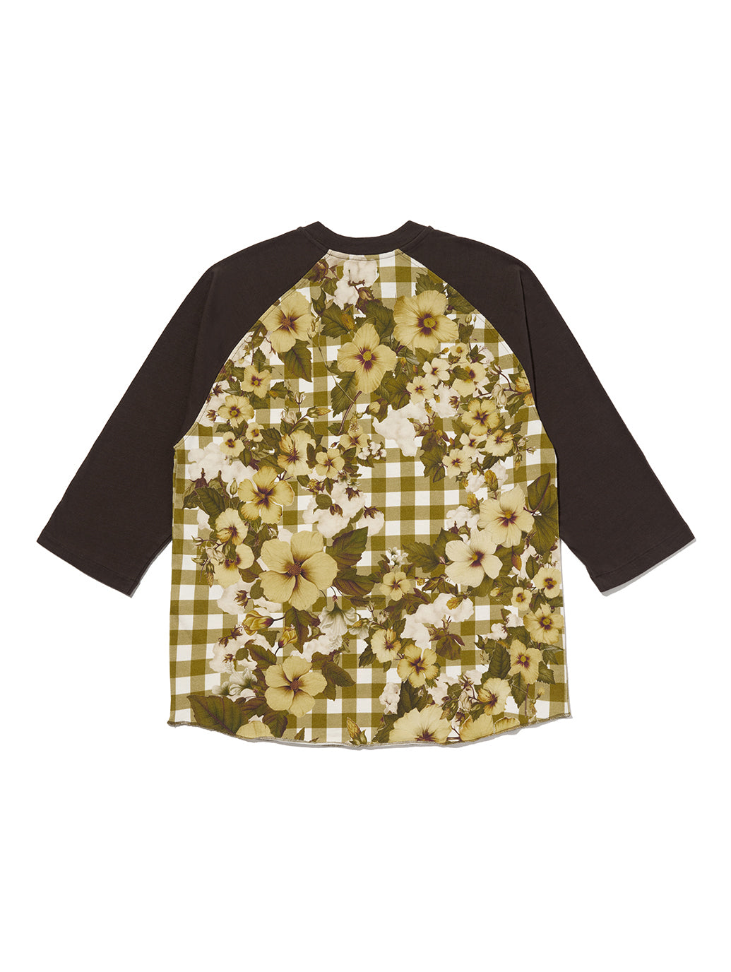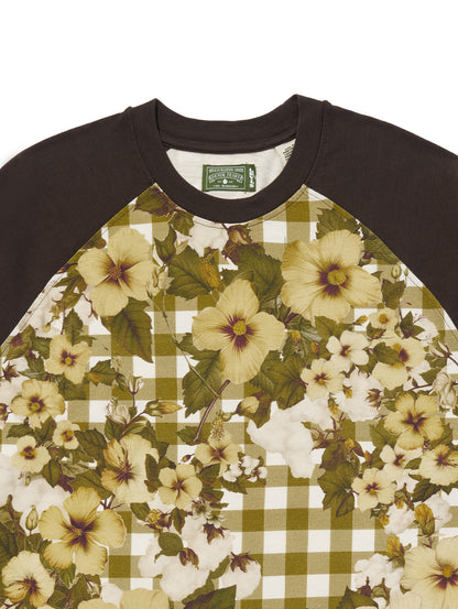 この限定版ベースボールTシャツは、家族の集まりや共同のお祝いを体現する南部のテーブルクロスのパターンからインスピレーションを得た、花柄のギンガムプリントとダークグリーンの袖を組み合わせています。