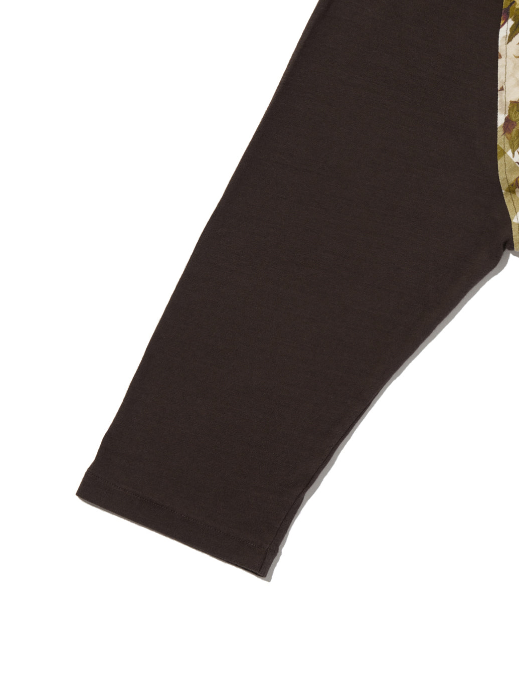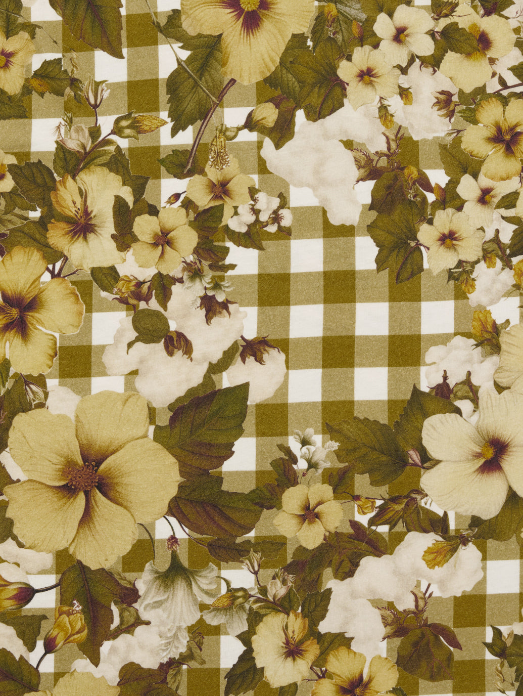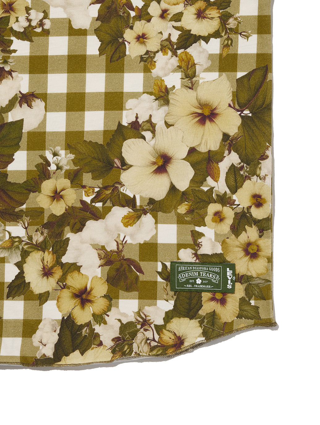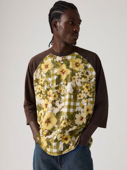 この限定版ベースボールTシャツは、家族の集まりや共同のお祝いを体現する南部のテーブルクロスのパターンからインスピレーションを得た、花柄のギンガムプリントとダークグリーンの袖を組み合わせています。