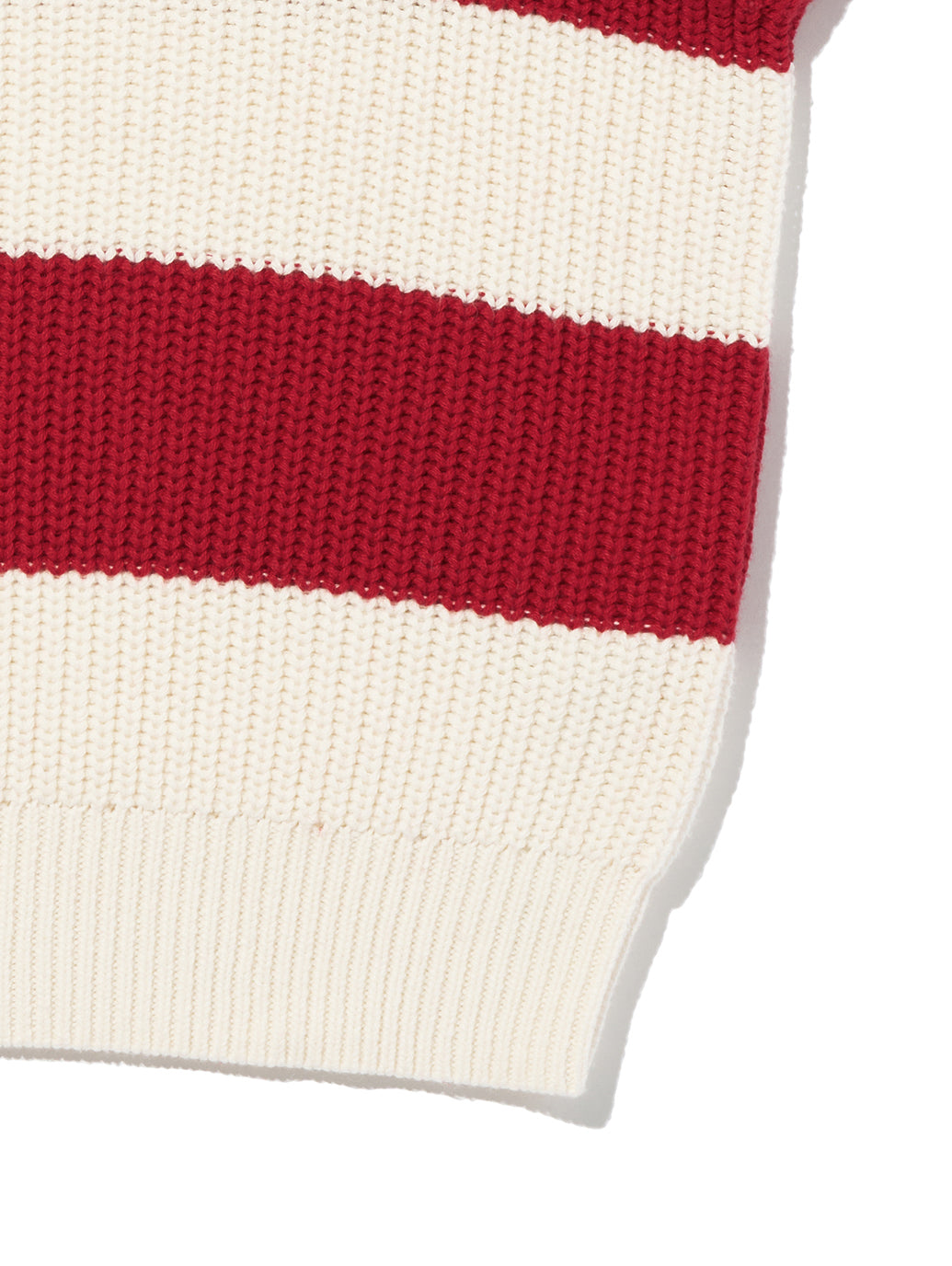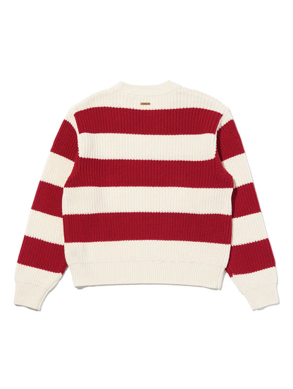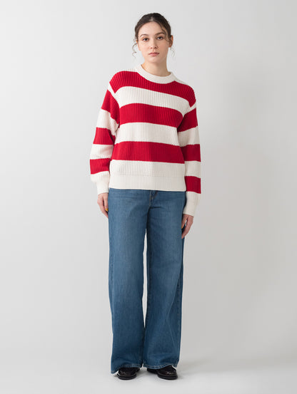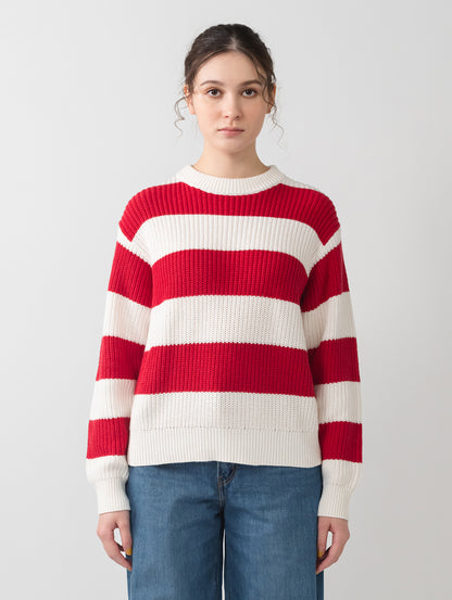 どんなジーンズとも相性ピッタリなセーターがデザインされました。幅広いボーダーで柔らかい印象を与えてくれるクルーネックのリラックスフィットです。縁がリブ編みで汎用性の高い一枚です。