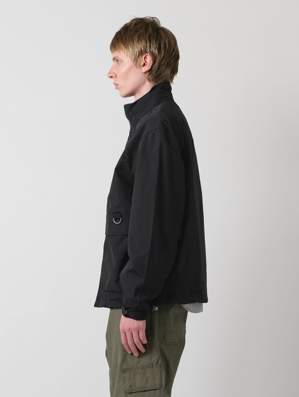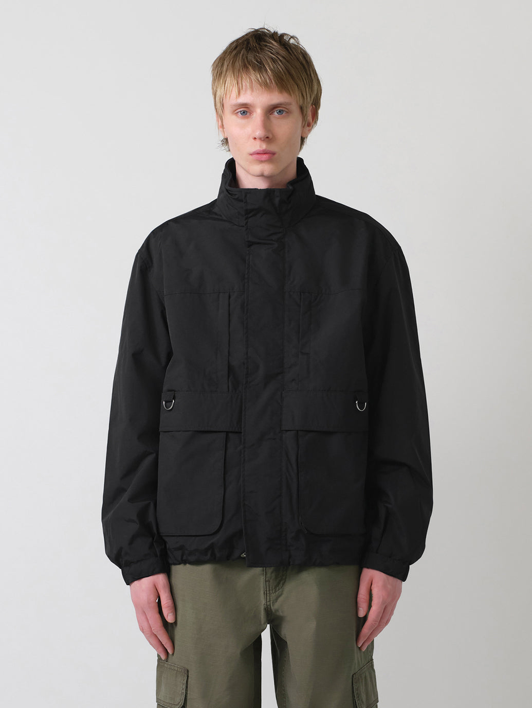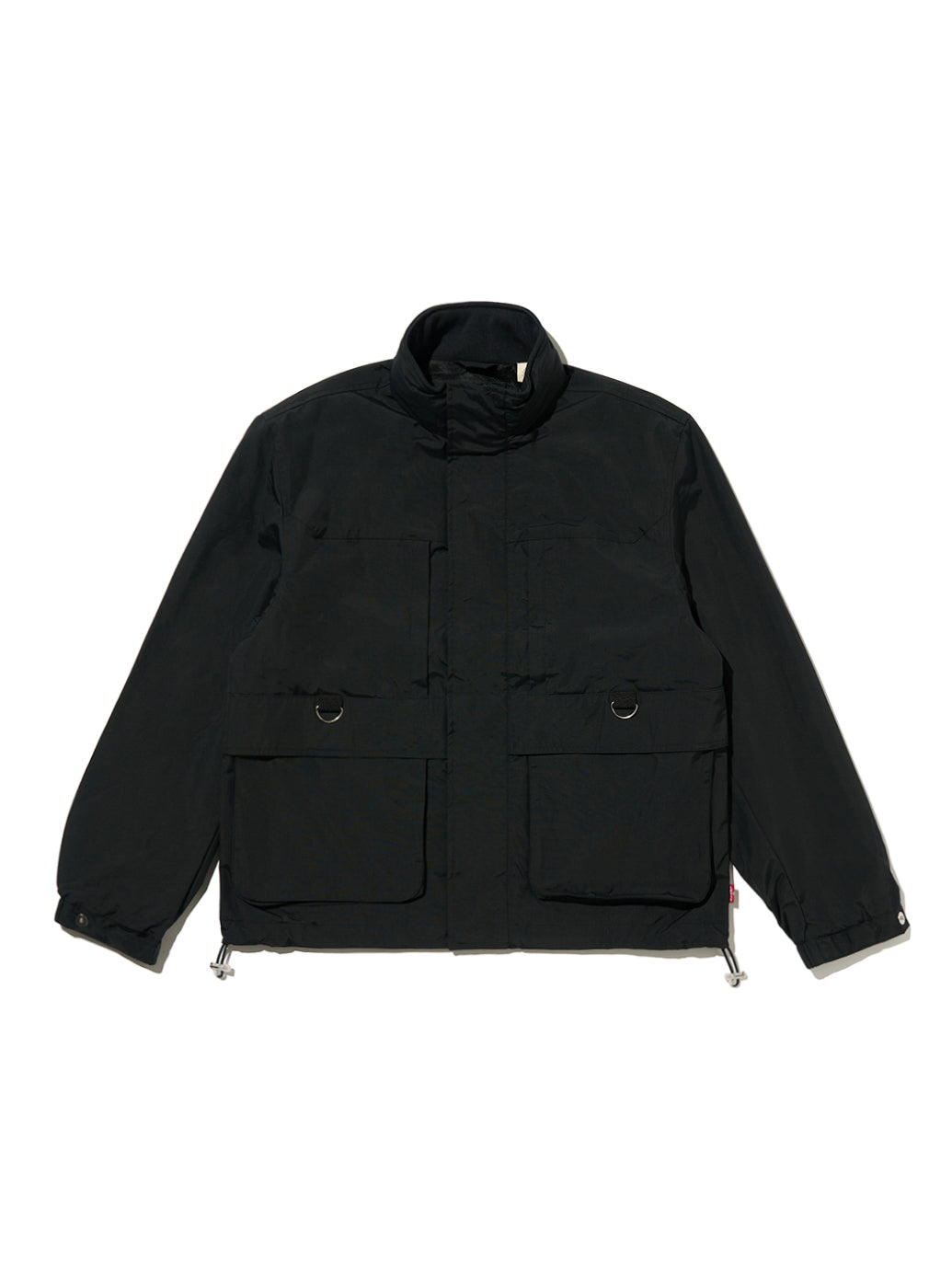 ナイロン生地のジップアップユーティリティジャケット。ブラックカラーのゆったりとしたボックスシルエットのボディ、フロントに配された4つのポケットが特徴です。裾部分はドローコード仕様でお好みでアジャストしてシルエットに変化を出すことも出来ます。幅広い季節、スタイリングで活躍する一着です。