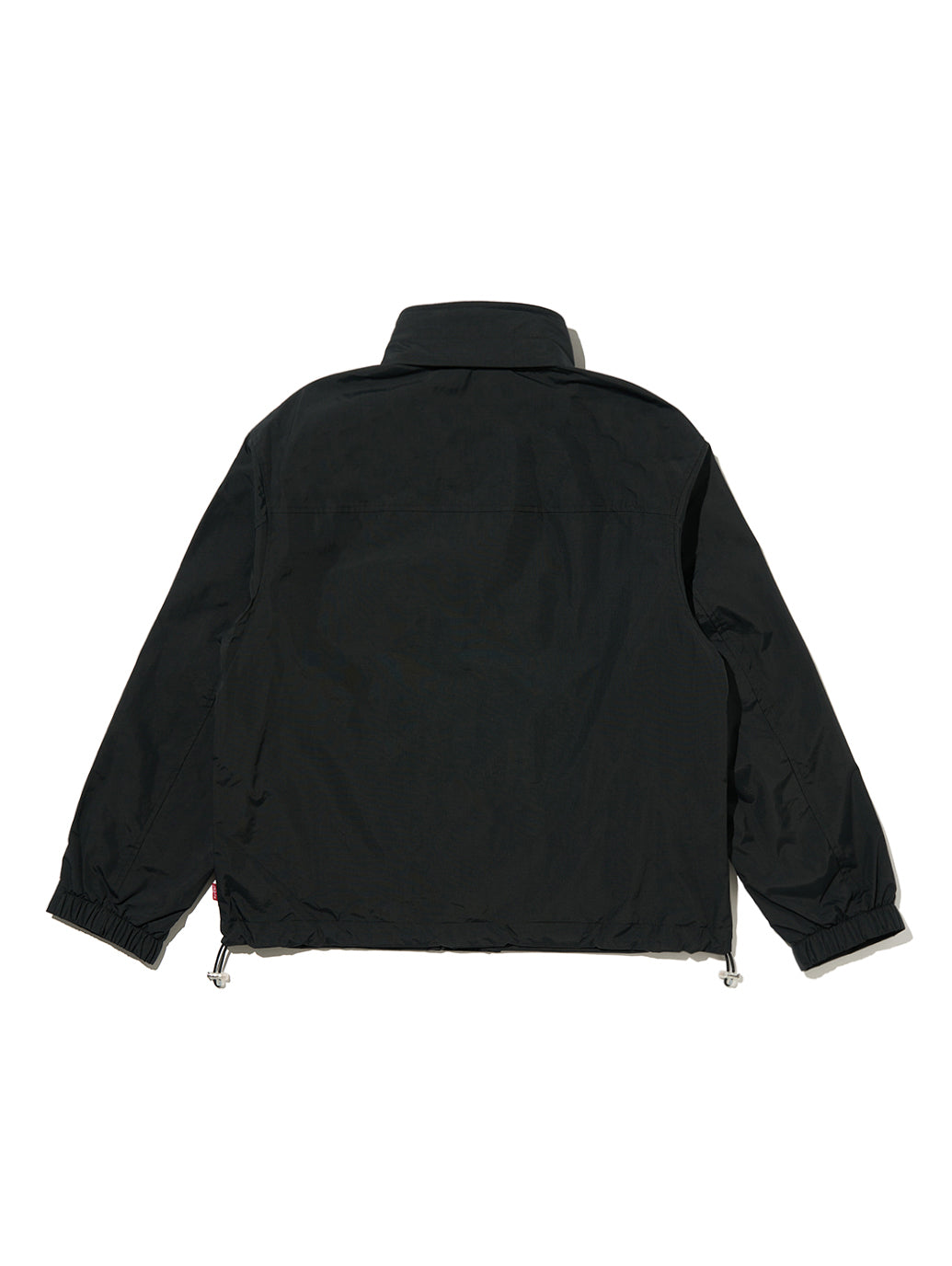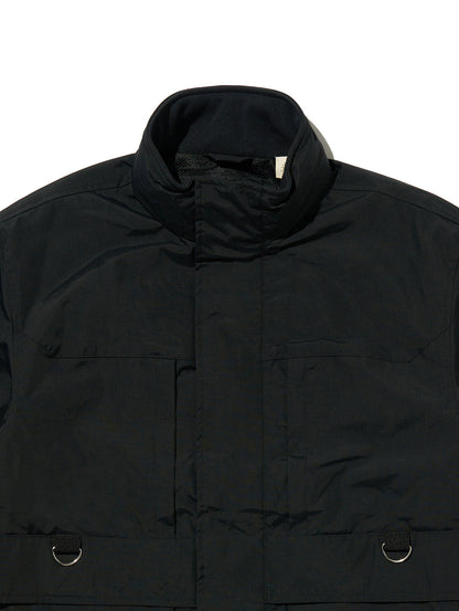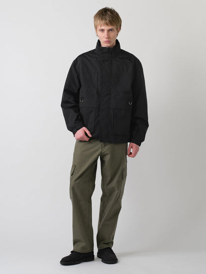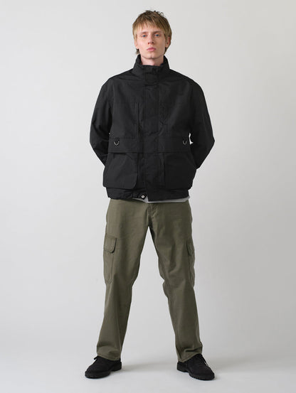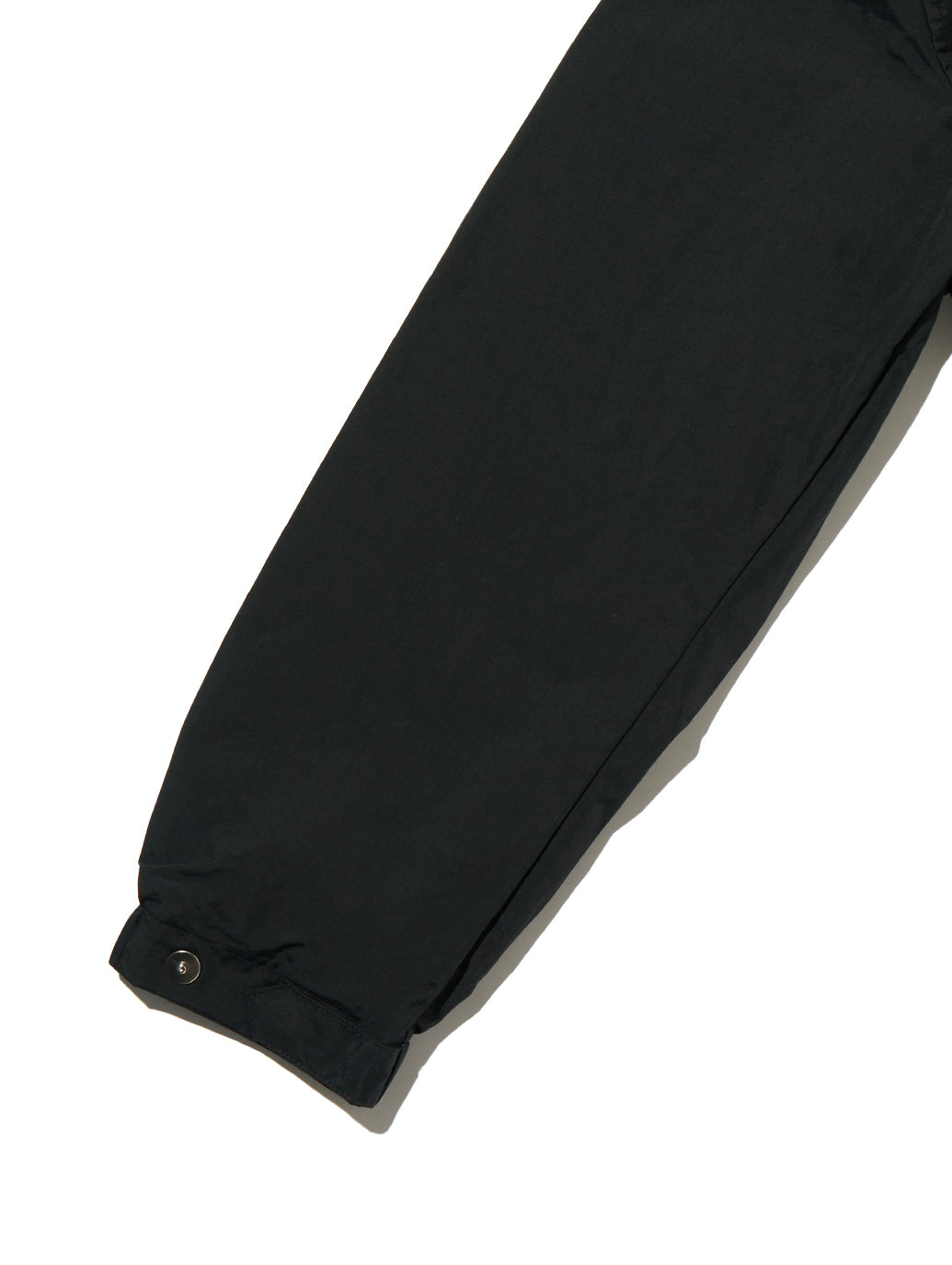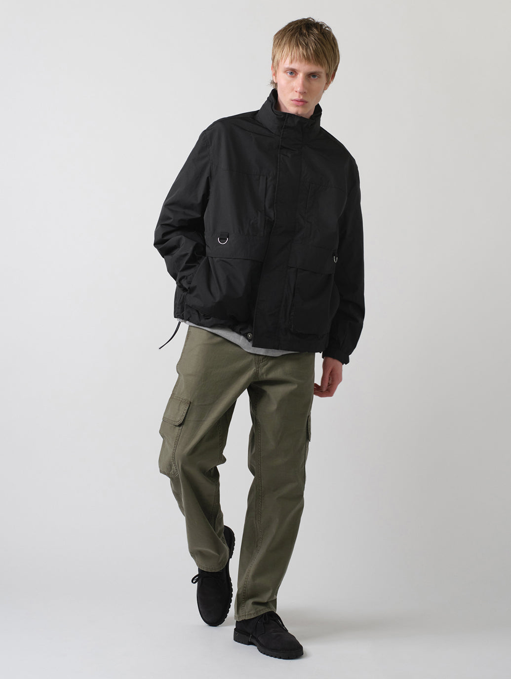 ナイロン生地のジップアップユーティリティジャケット。ブラックカラーのゆったりとしたボックスシルエットのボディ、フロントに配された4つのポケットが特徴です。裾部分はドローコード仕様でお好みでアジャストしてシルエットに変化を出すことも出来ます。幅広い季節、スタイリングで活躍する一着です。