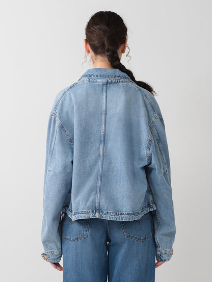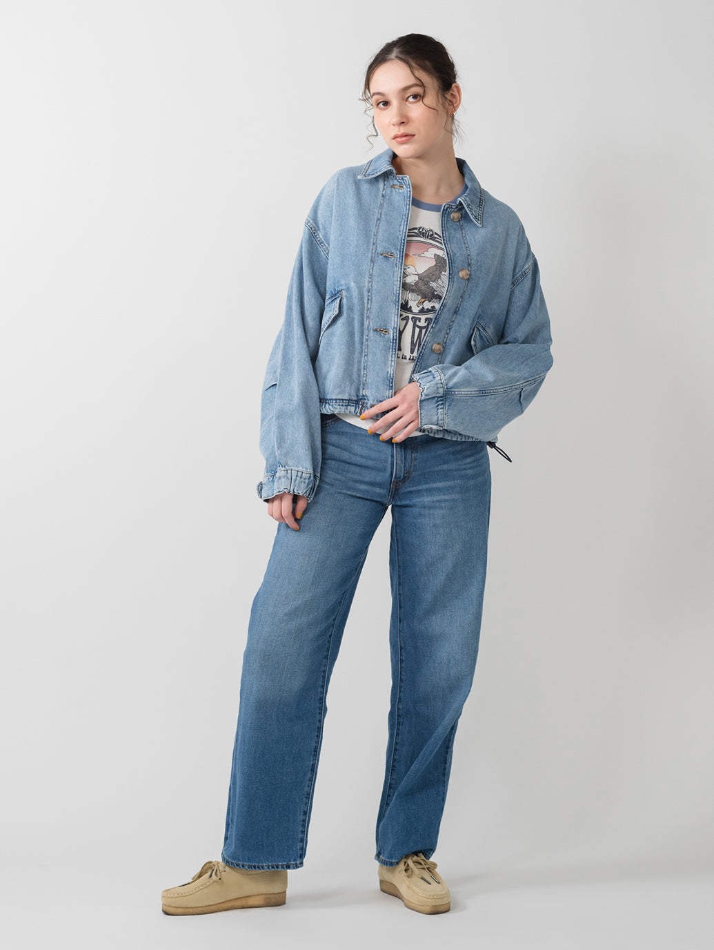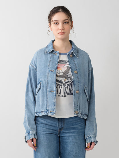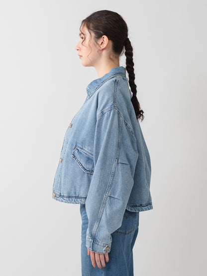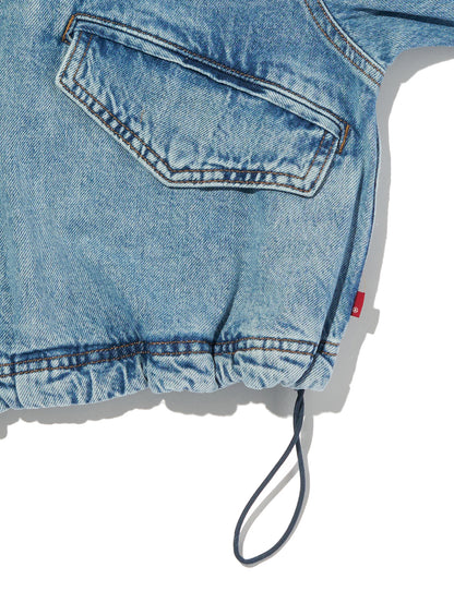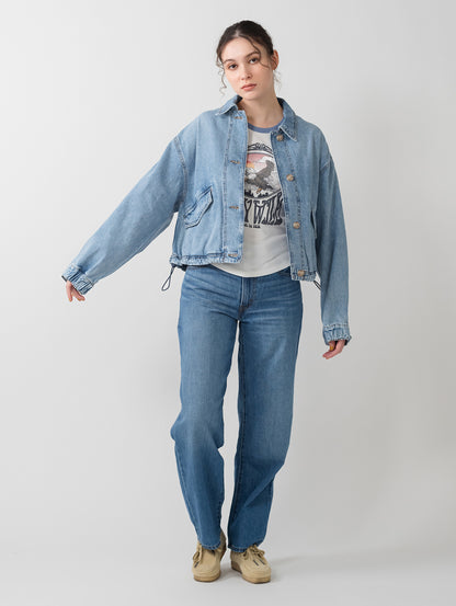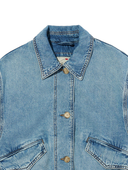 Levi'sのJanisユーティリティジャケットを、フロントボタンアップとリラックスフィット、両側ポケットで現代風にアップグレードしました。ライトインディゴカラーのLevi's®らしいデニム生地を使用したボディの裾部分はドローコード仕様になっています。絞りを効かせて短丈シルエットを更に強調することも出来、様々な着こなしに活躍する春先にお勧めの一着です。