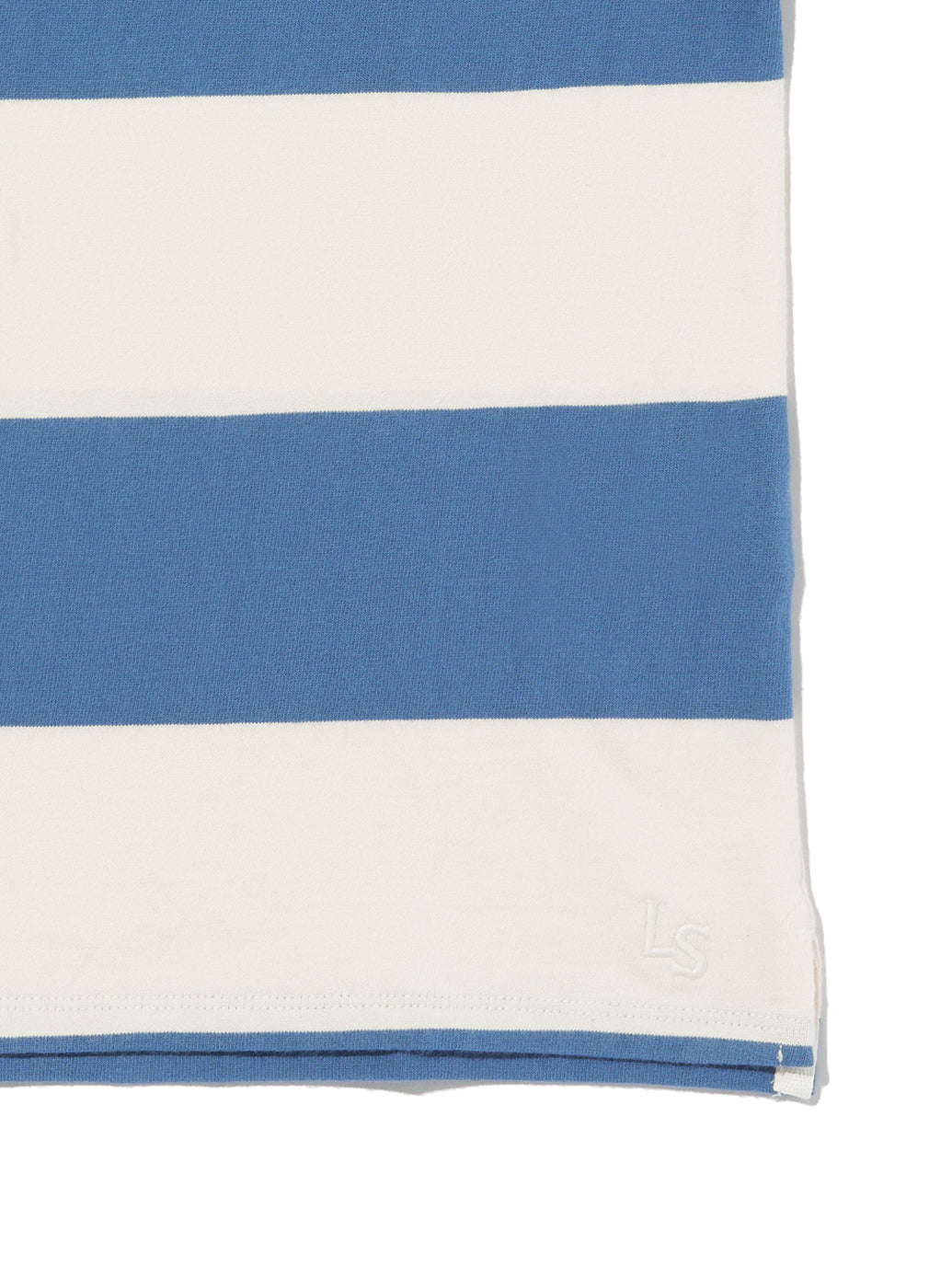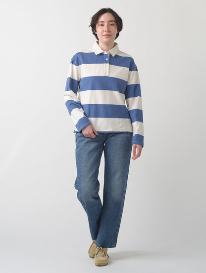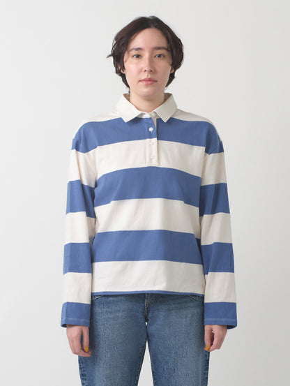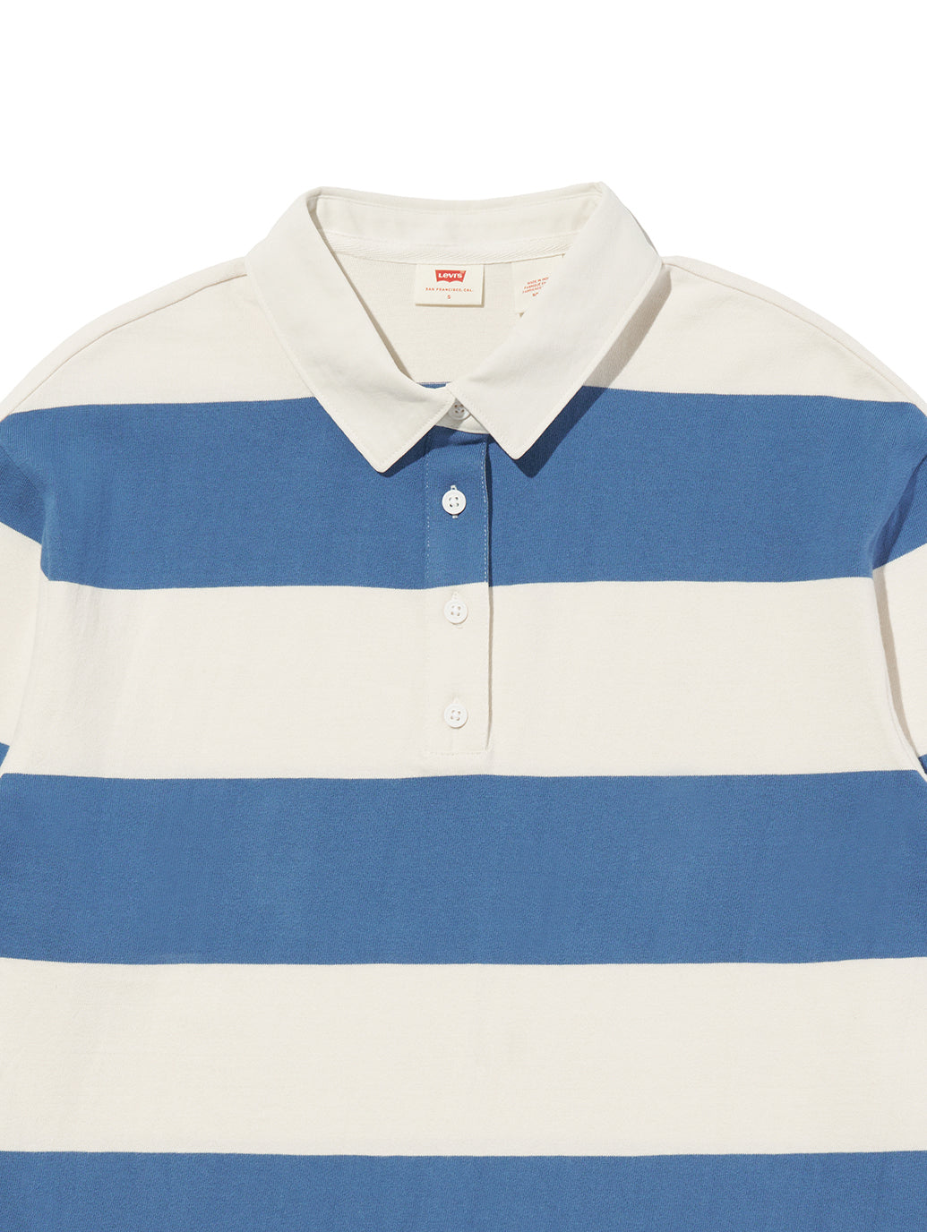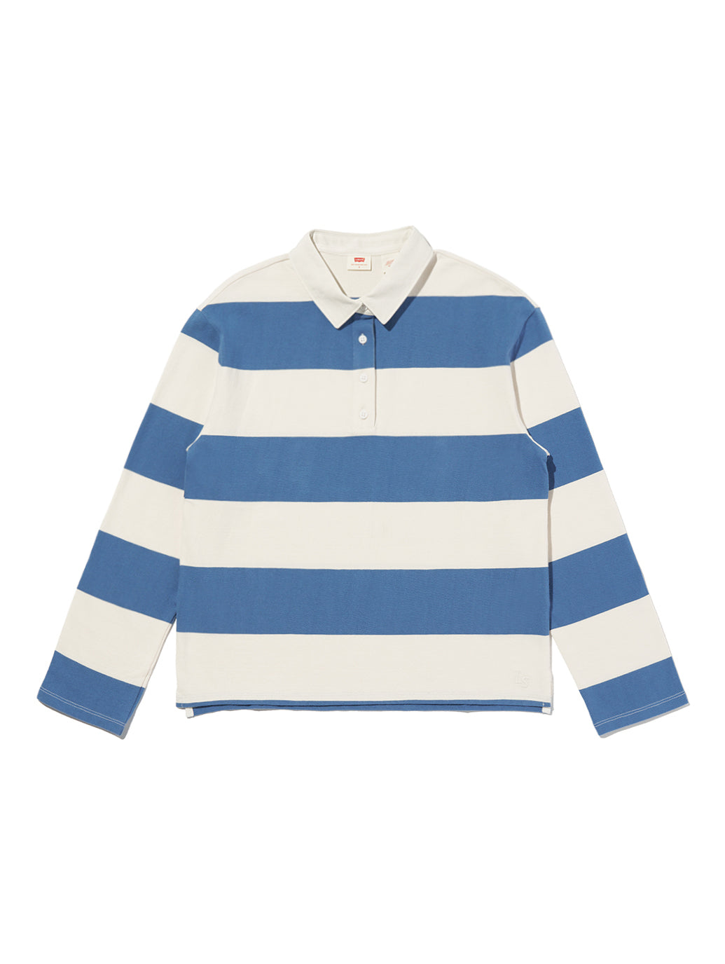 スポーティでありながらヴィンテージな美しさを持つLevi'sのラグビーシャツ。リラックスフィットのボタンアップカラー、少しウォッシュを施したネイビーとホワイトのクラシックストライプのデザインです。アウターのインナーとして、春先には一枚でも活躍する一着です。