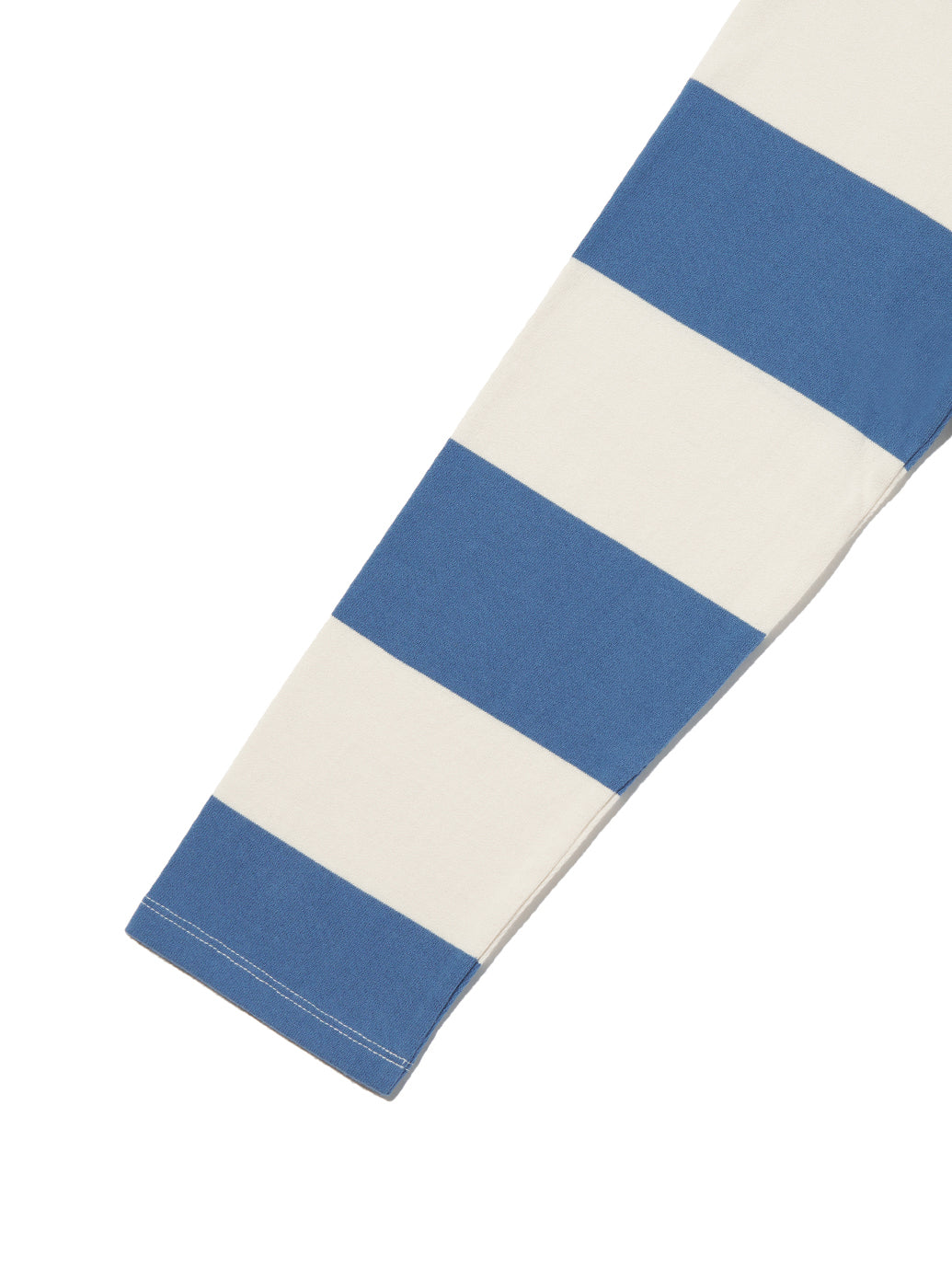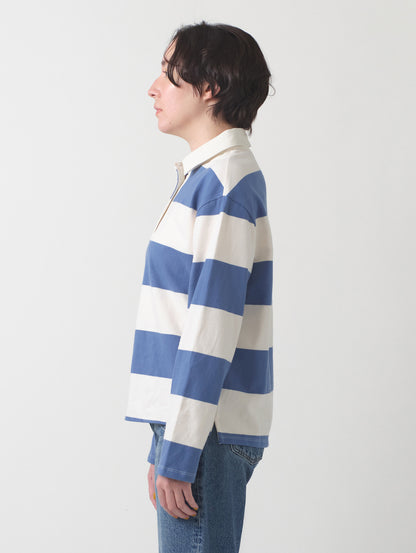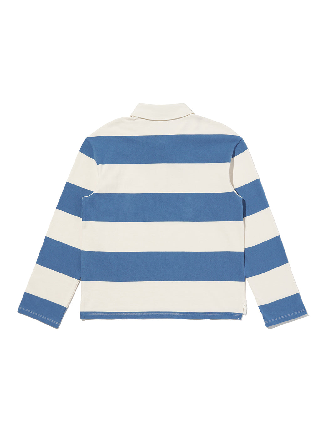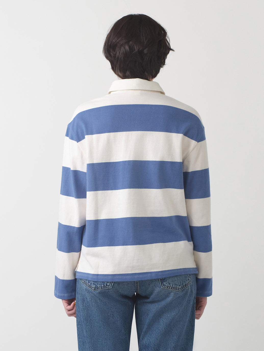 スポーティでありながらヴィンテージな美しさを持つLevi'sのラグビーシャツ。リラックスフィットのボタンアップカラー、少しウォッシュを施したネイビーとホワイトのクラシックストライプのデザインです。アウターのインナーとして、春先には一枚でも活躍する一着です。