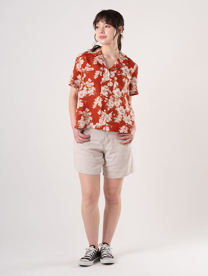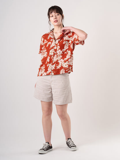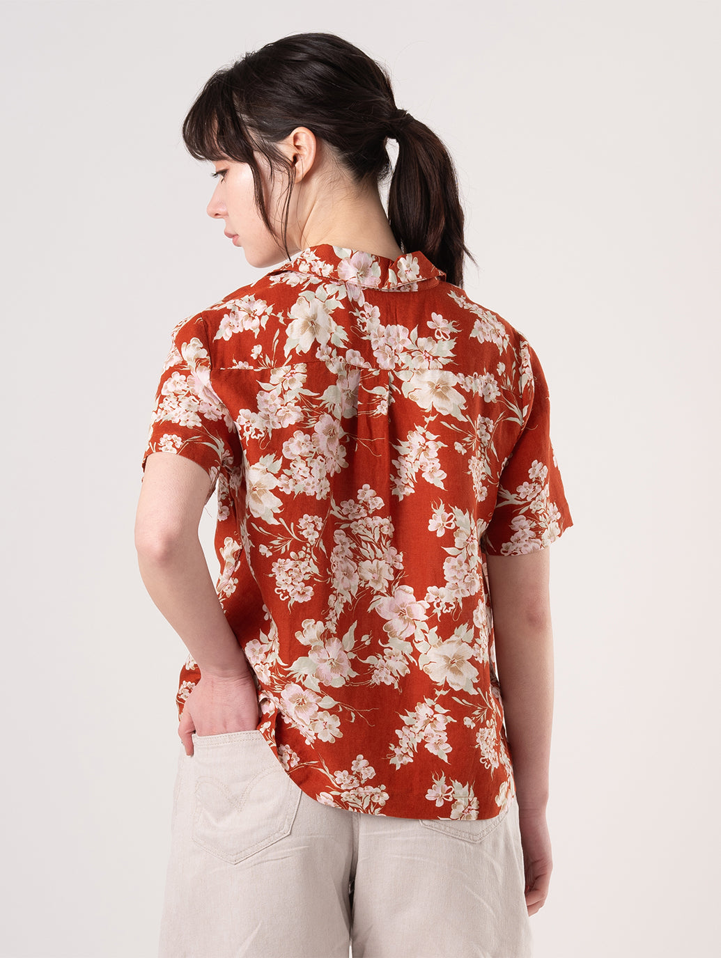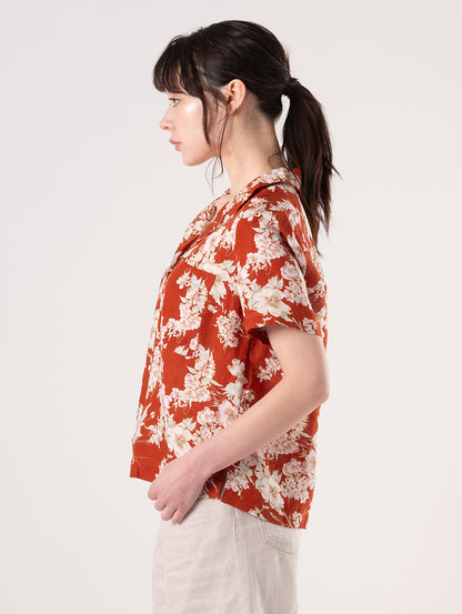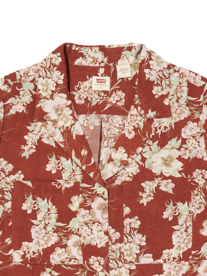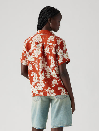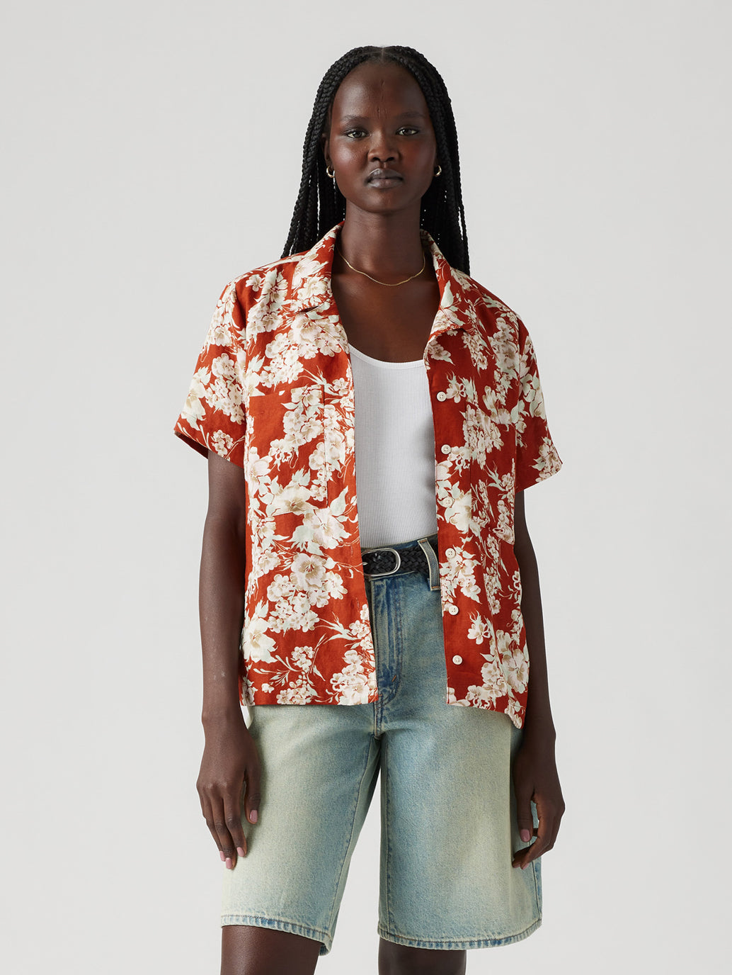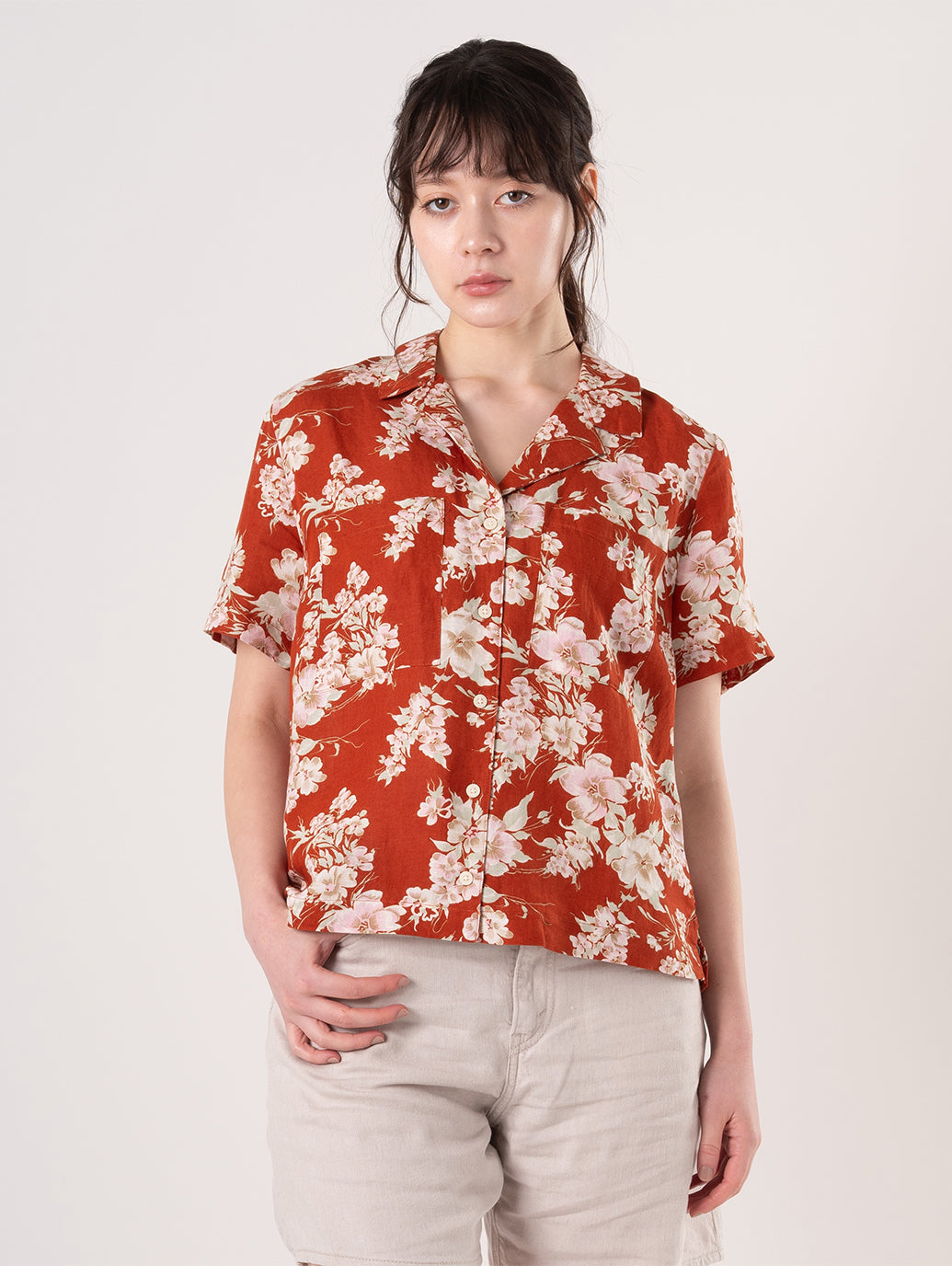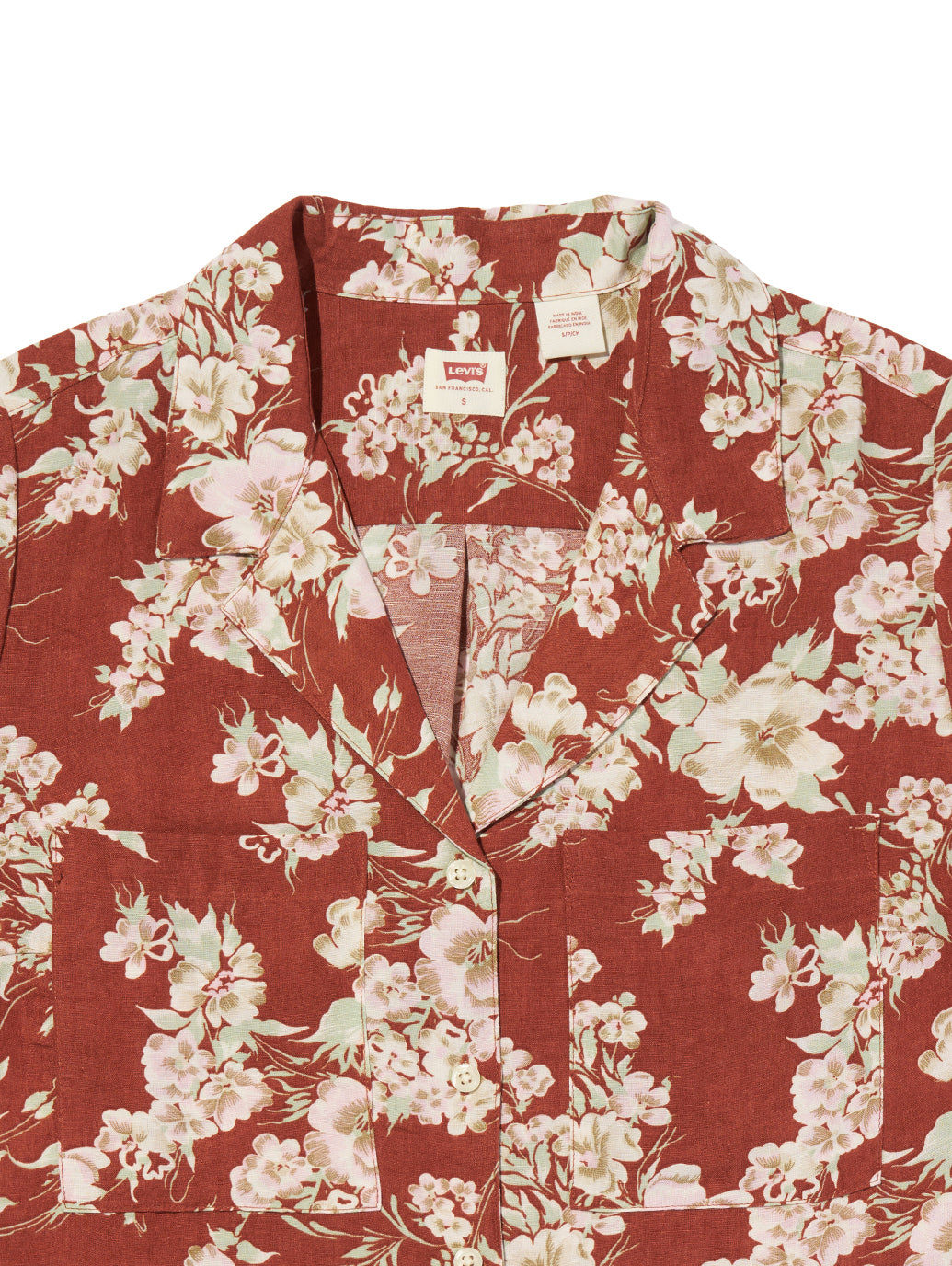 ボクシーでリラックスしたフィットでフロントボタンアップ仕様のシャツ。フロントには大きな2つのポケットを配し、開襟デザインも特徴です。総柄なので春先から夏のバケーションに活躍する一着です。