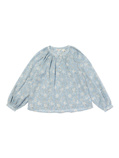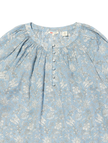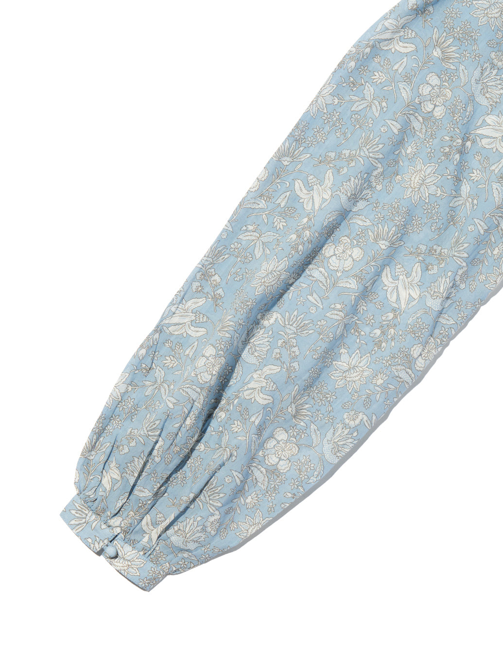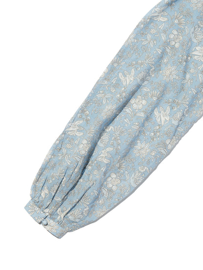 クルーネックで花柄のブルゾンスリーブのあるデザイン。ロマンティックなアイレットディテールを施しました。綿100%の生地、爽やかなホワイトカラーで春先から活躍間違いなしの一着です