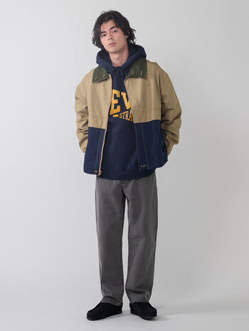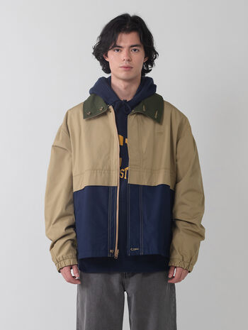 フルジップフロントのキャンバスジャケット。ベージュとネイビーのバイカラーのゆったりとしたボックスシルエットのボディ、フロントとバックにポケットを配したデザインです。リバーシブル仕様になっており、片面はオリーブカラーの単色なので、スタイリングに合わせて着まわせる重宝する一着です。