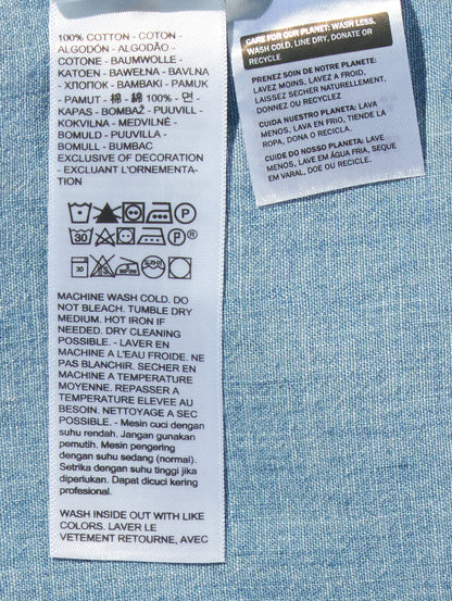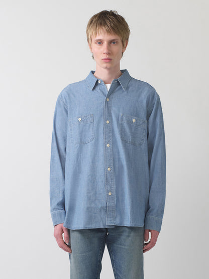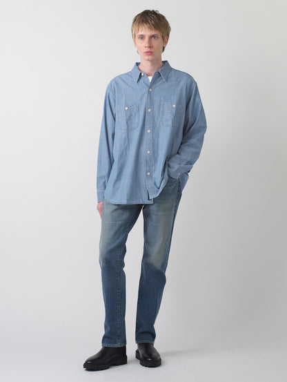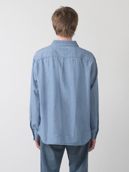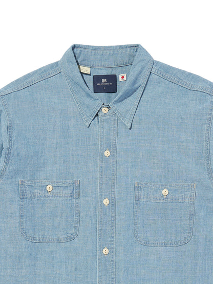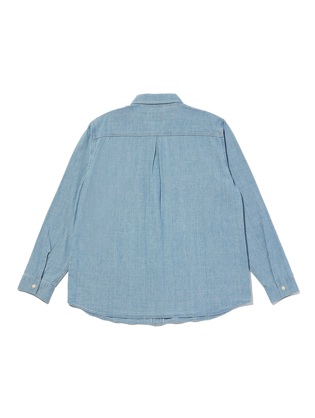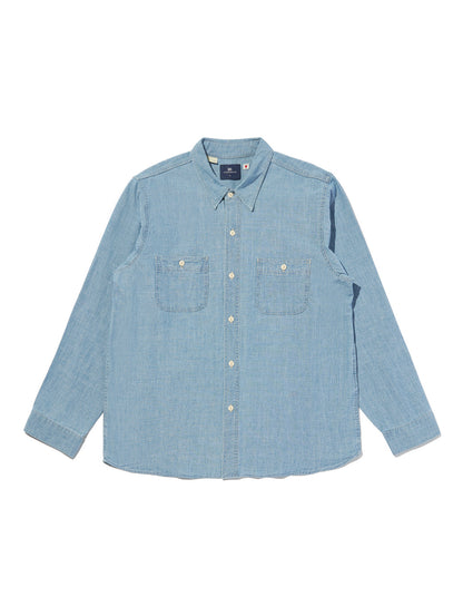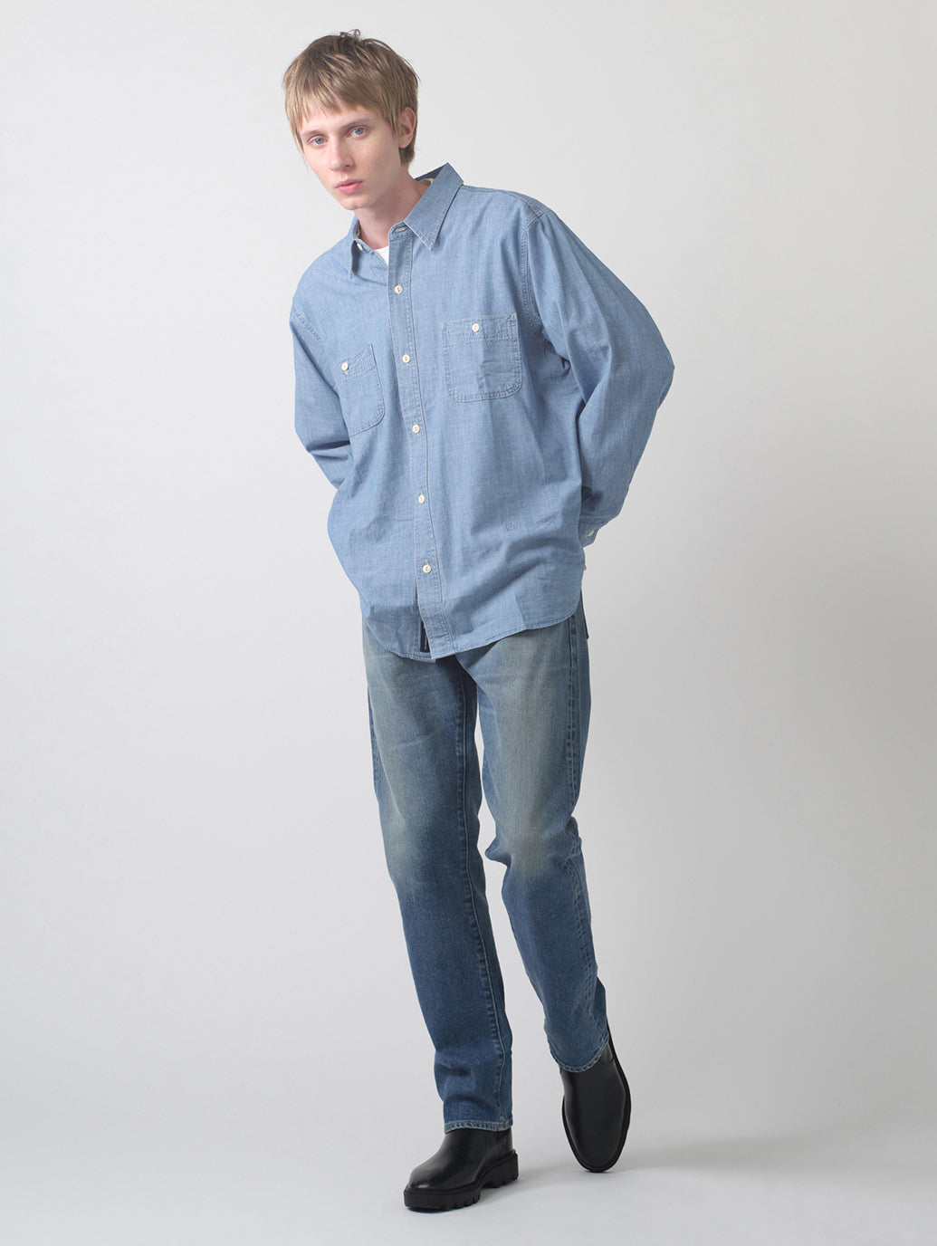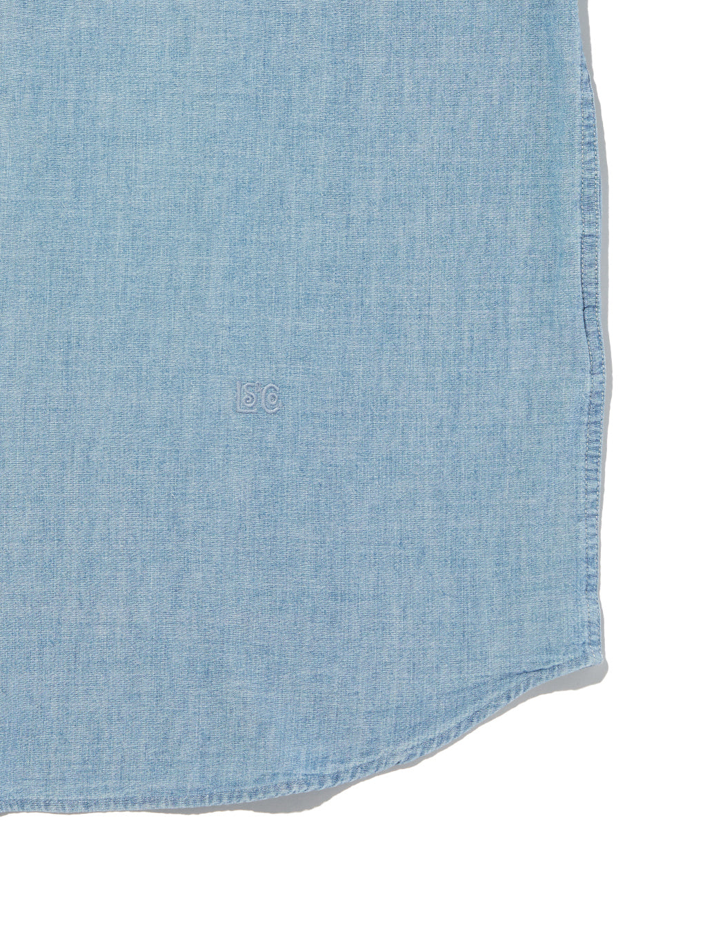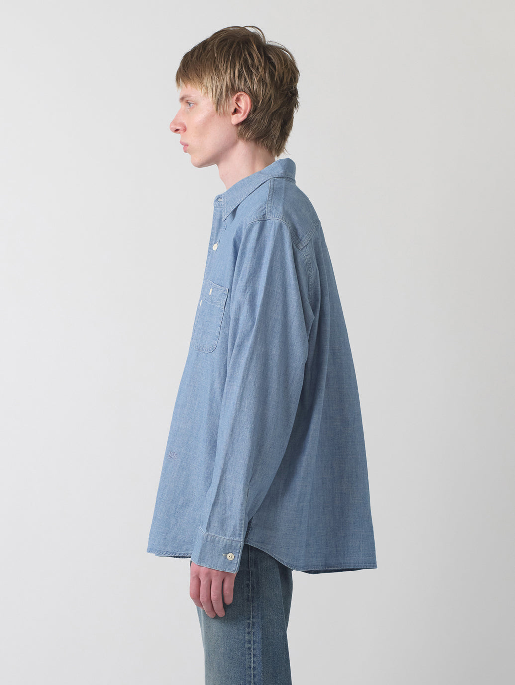 シャンブレー生地を使用したワークシャツ。クラシックなレギュラーフィットのボタンアップフロント仕様のボディには2つのポケットが配され、左の裾部分にさり気なく同色の当コレクションの刺繍ロゴをあしらったデザインです。シンプルでありながらもディティールに拘った一着です。