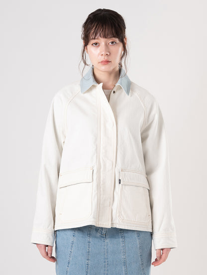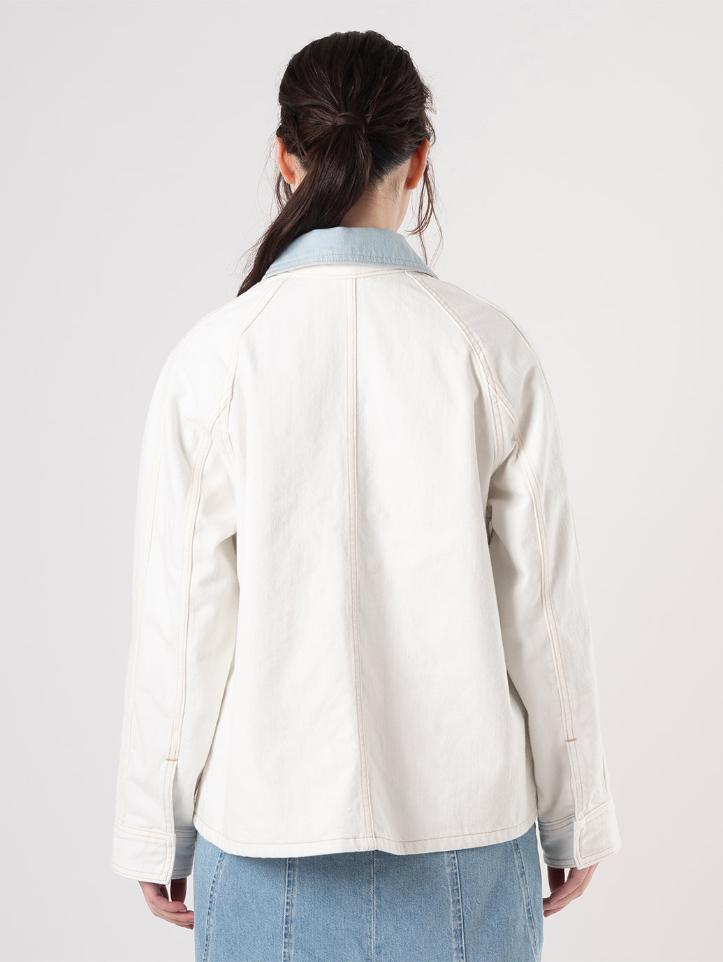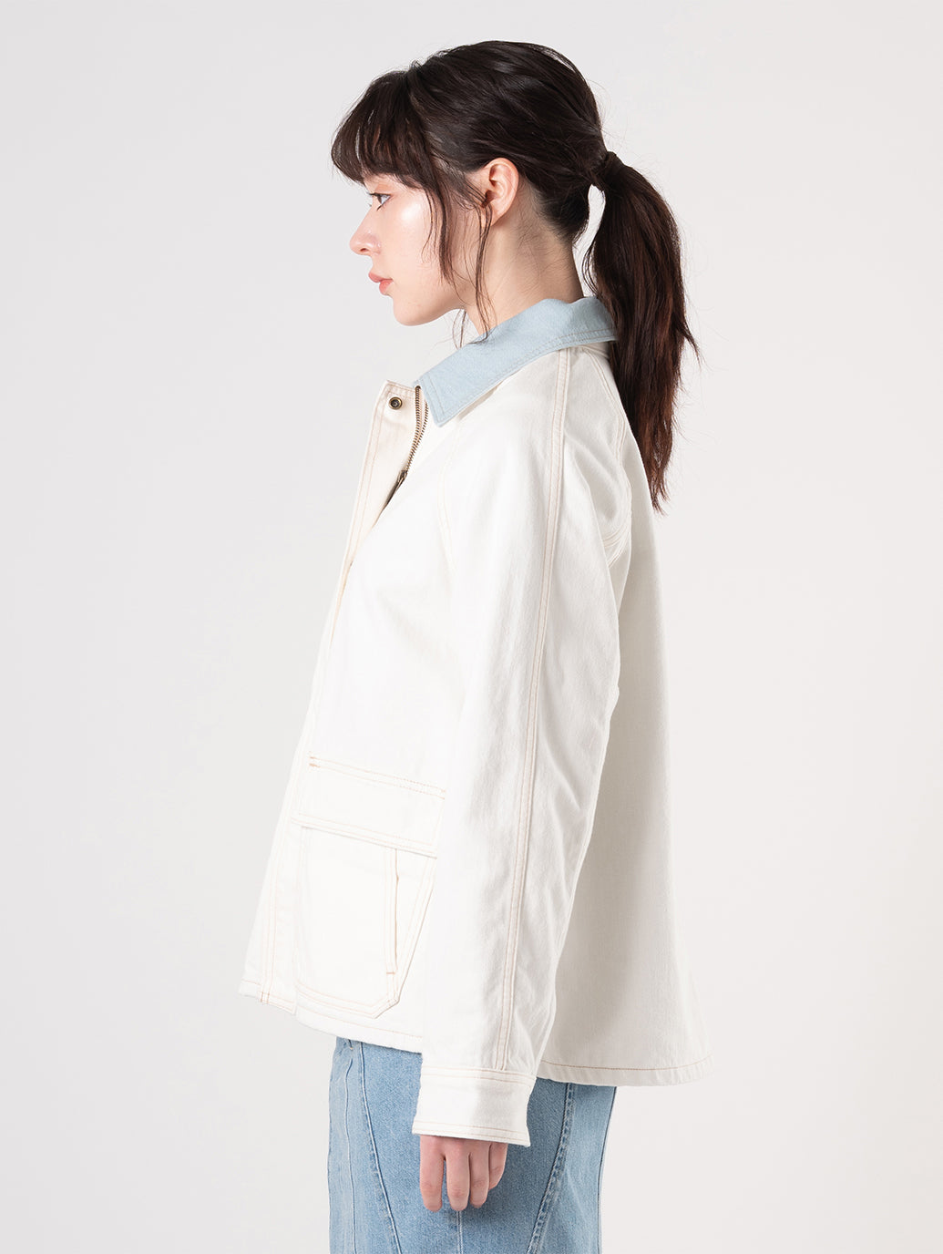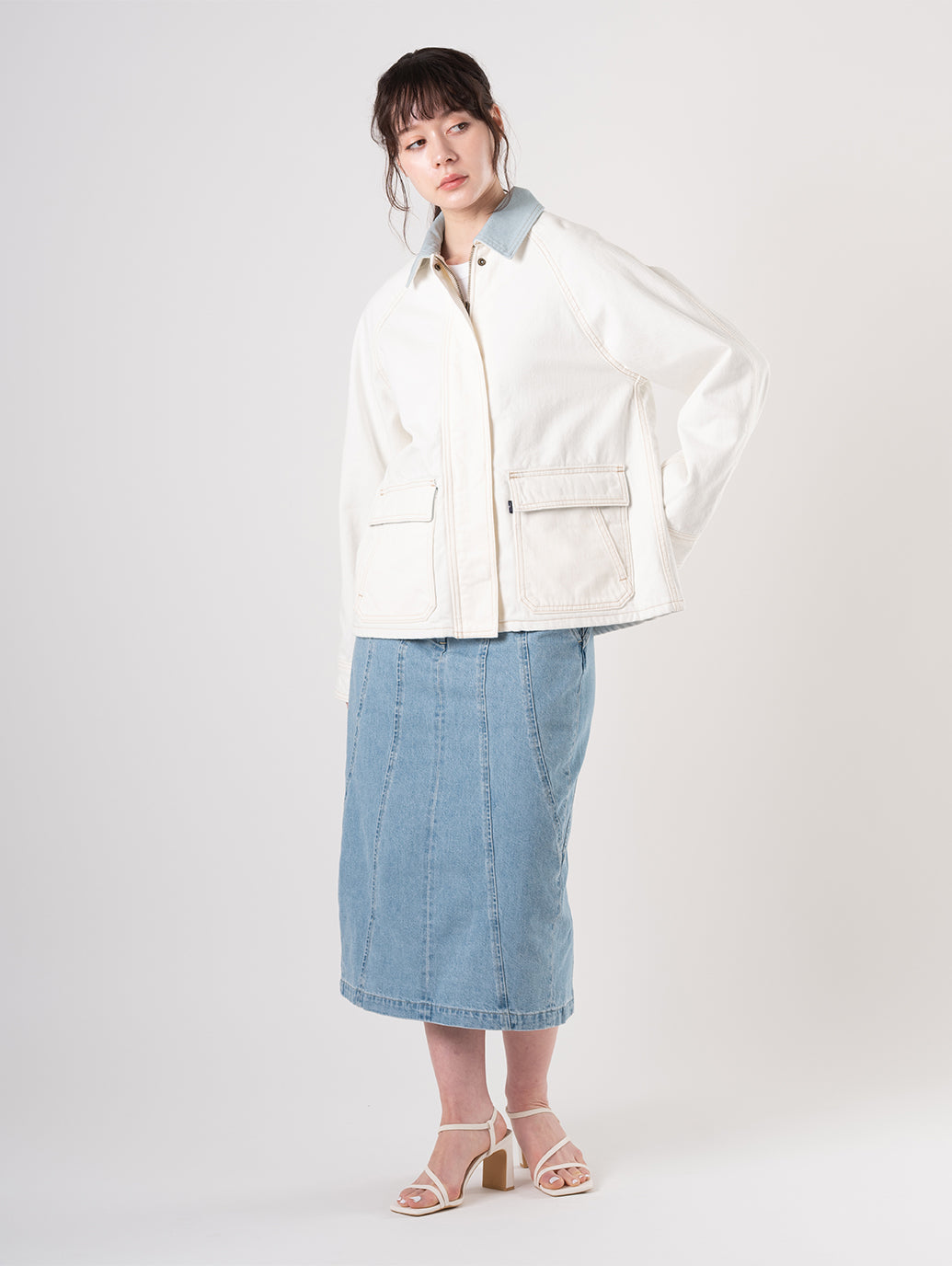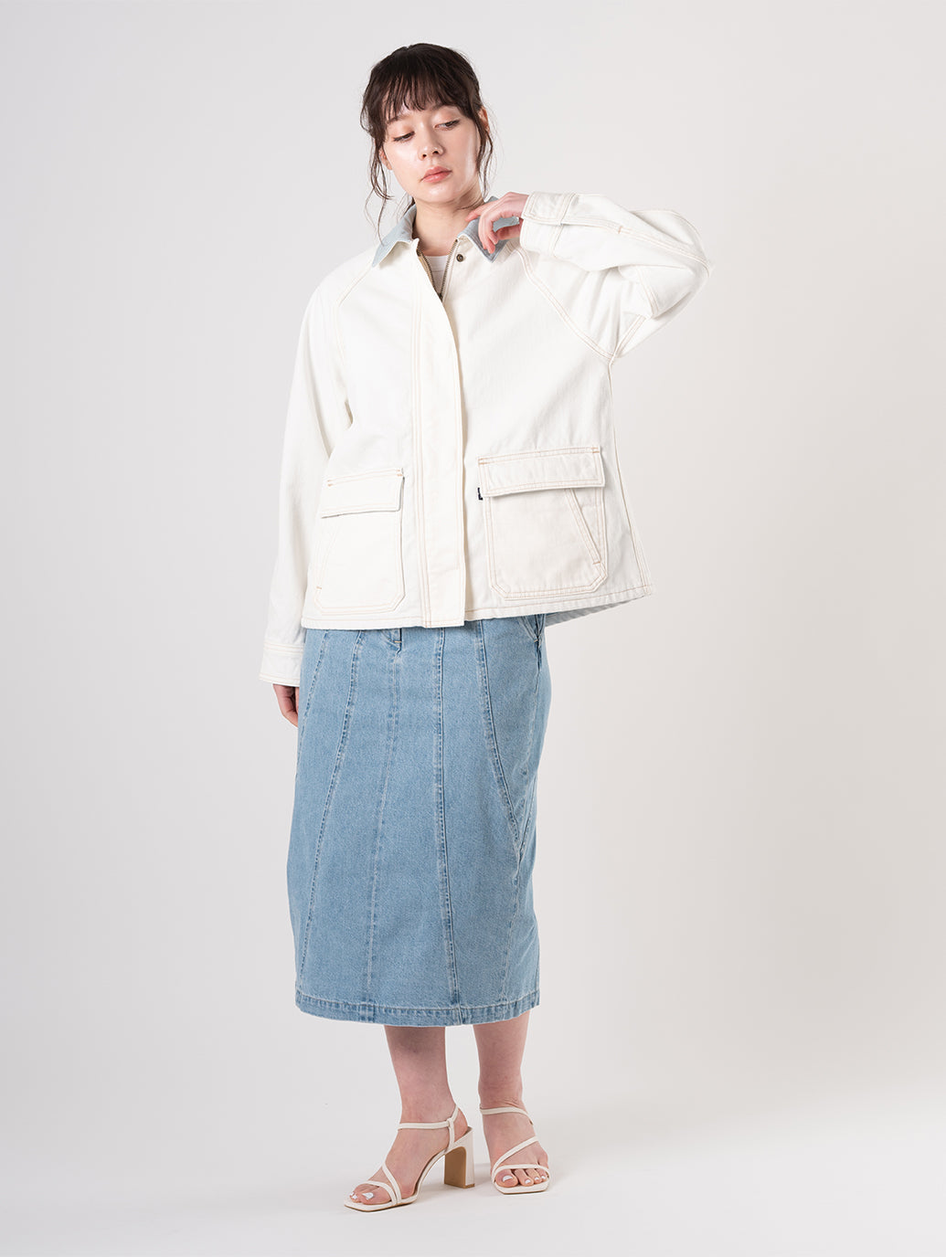 リラックスフィットにカットされ、隠しジッパーとスナップボタン、ソフトなシャンブレーの裏地、パッチポケットなどクラシックなワークウェアのディテールが特徴です。