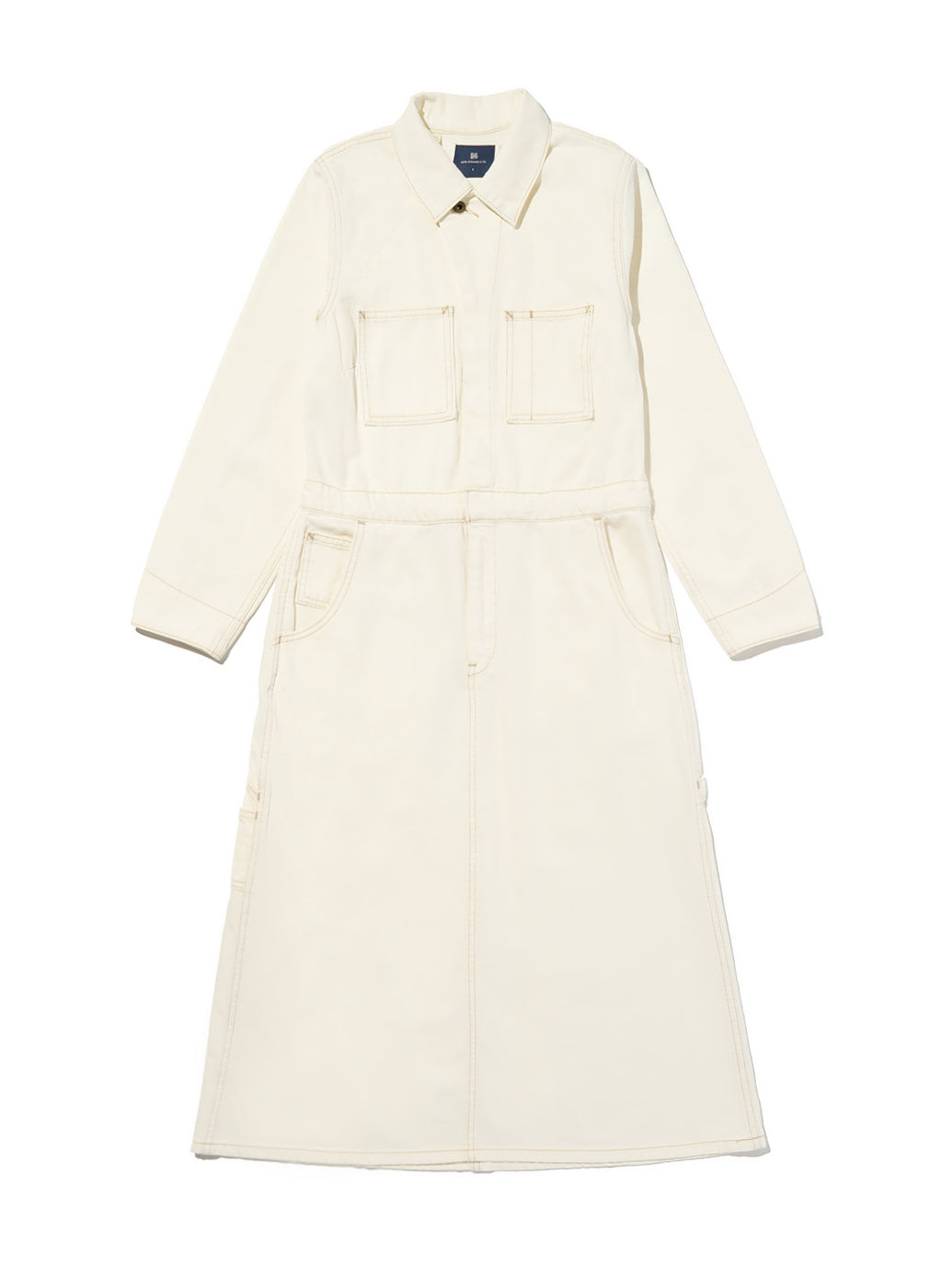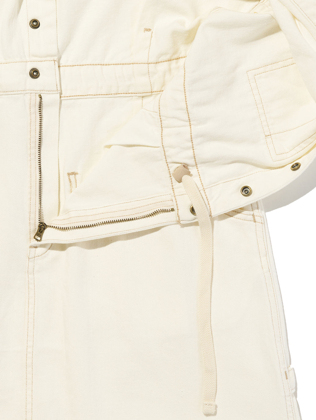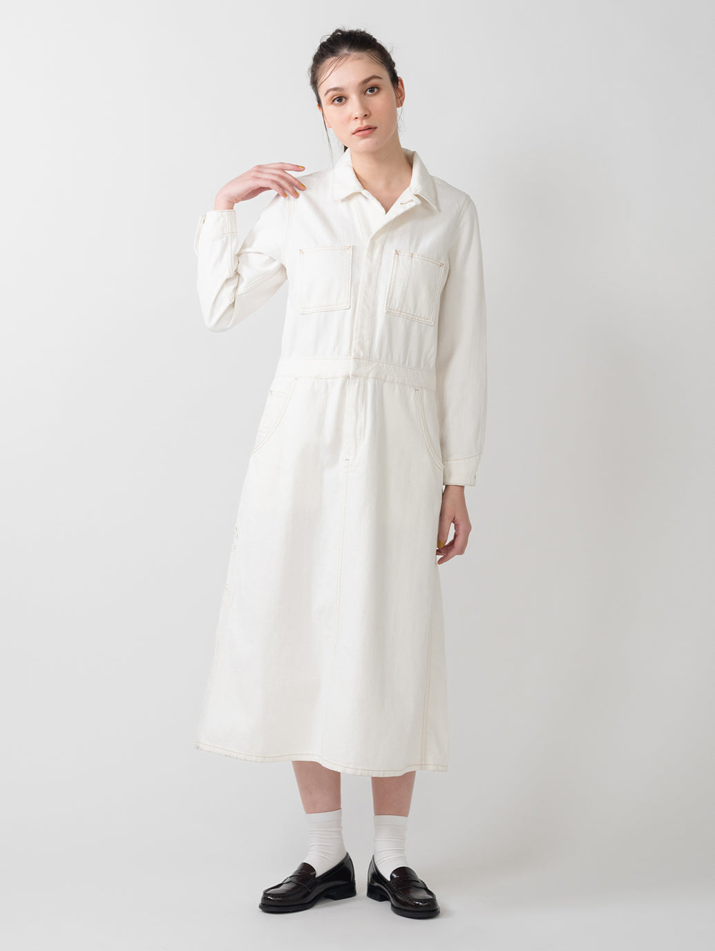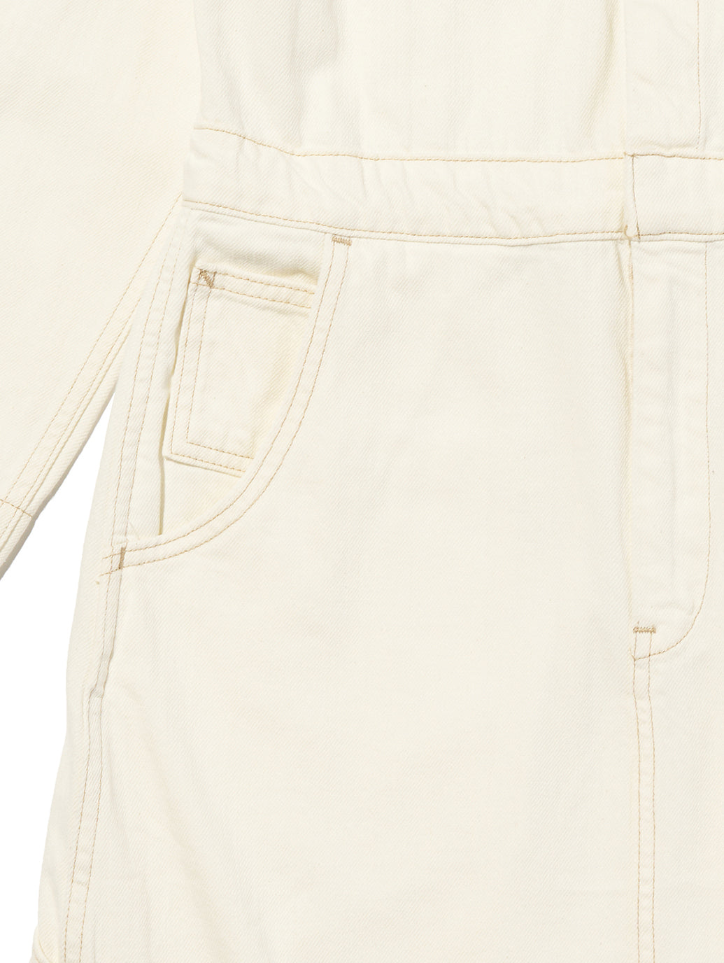 トレンド感の強いオールインワンがこのコレクションでもデザインされました。標準的なリラックスしたフィット感でカットされており、ドローストリングウエスト、マチ付きバック、ユーティリティポケットのようなワークウェアタッチが特徴です。