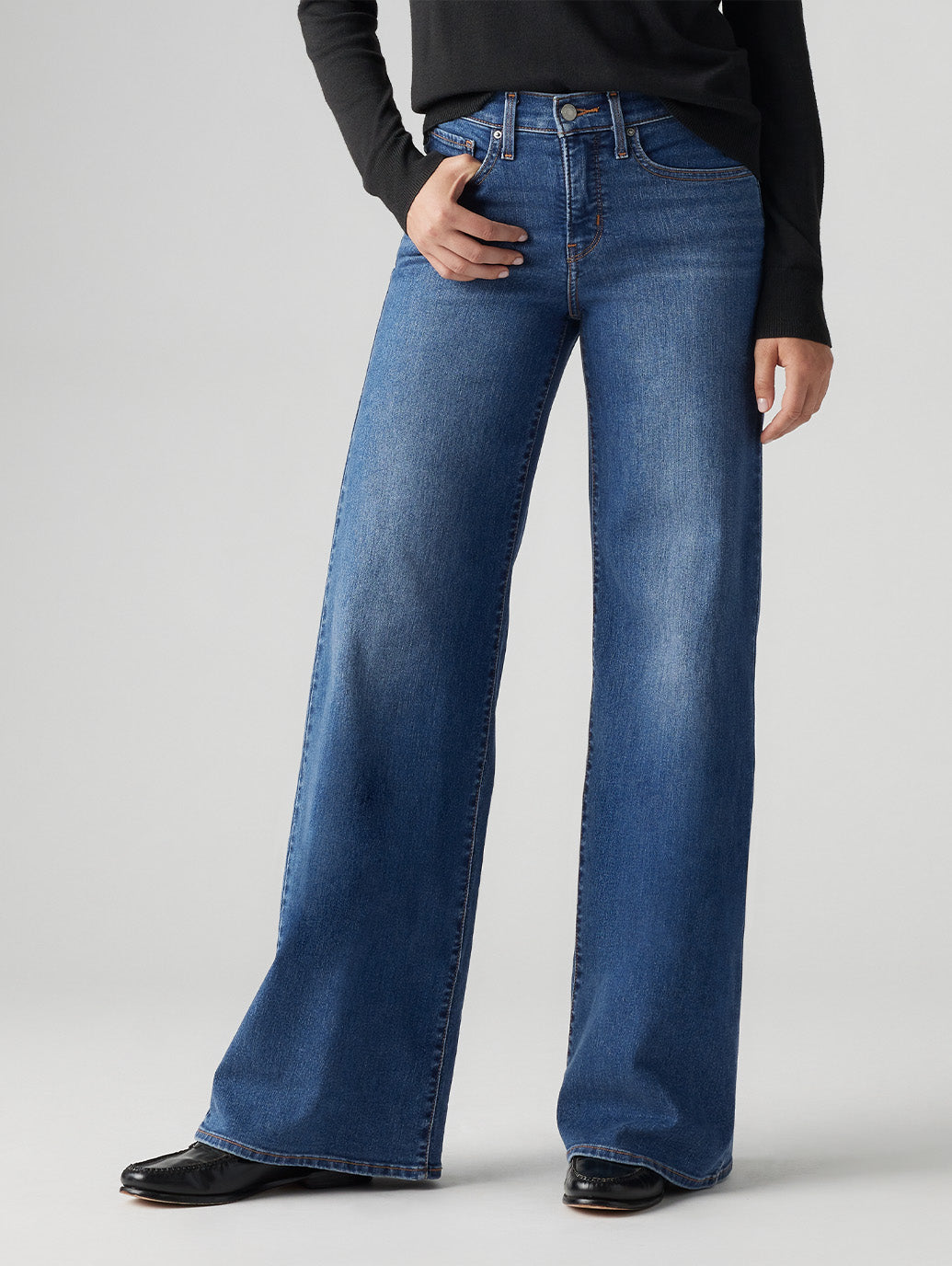 Levi'sのウィメンズ定番の300シリーズ。318 シェーピング ワイドレッグジーンズは、ウエスト周りの引き締める効果のあるフロントパネル設計になっており、ワイドレグとのメリハリがしっかり出やすく美脚効果のあるシルエットが魅力です。合わせやすのあるミディアムインディゴカラーで春先に活躍間違いなしの一本です。