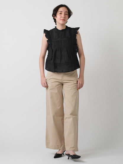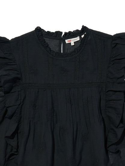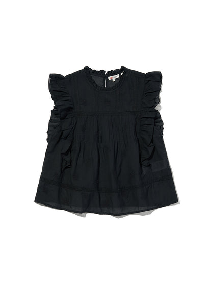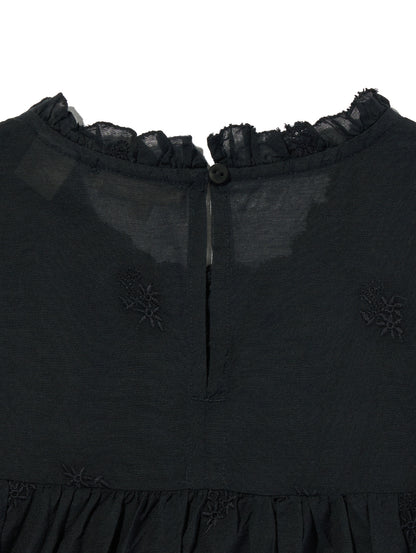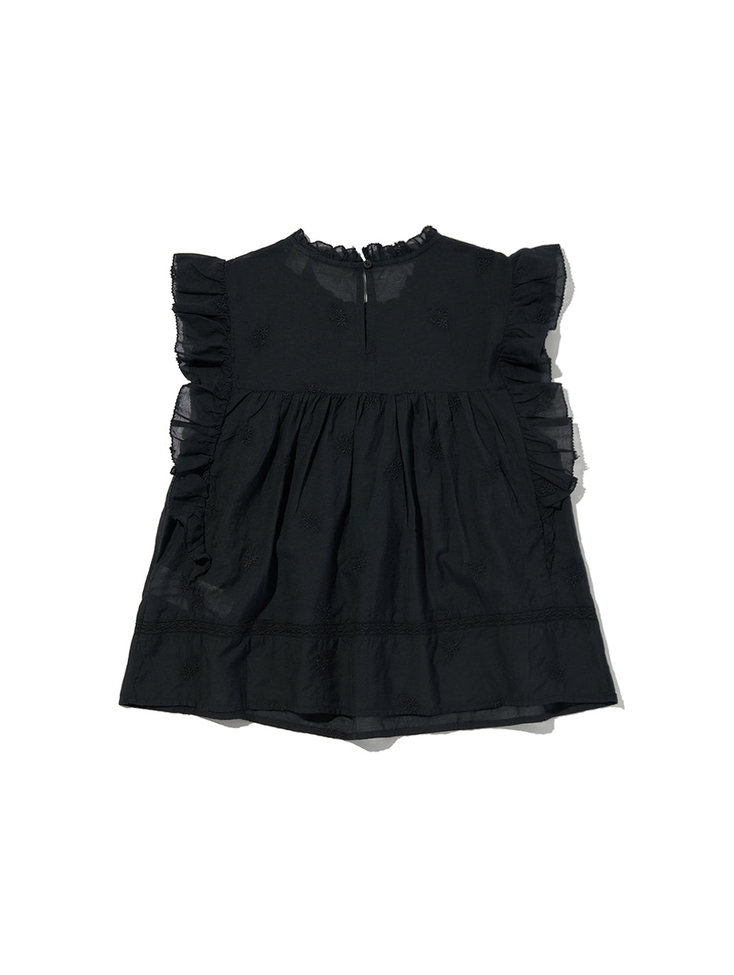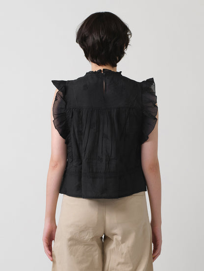 ふんわりとしたシルエットのブラックカラーのブラウス。フラッタースリーブと高いネックライン、同色のフローラルの刺繍を施して女性らしさをプラスしてくれます。綿にレーヨンを配合しており、ハリがありながらもドレープ感のある生地感で着心地も良好です。春先のスタリングのアクセントに重宝する一着です。