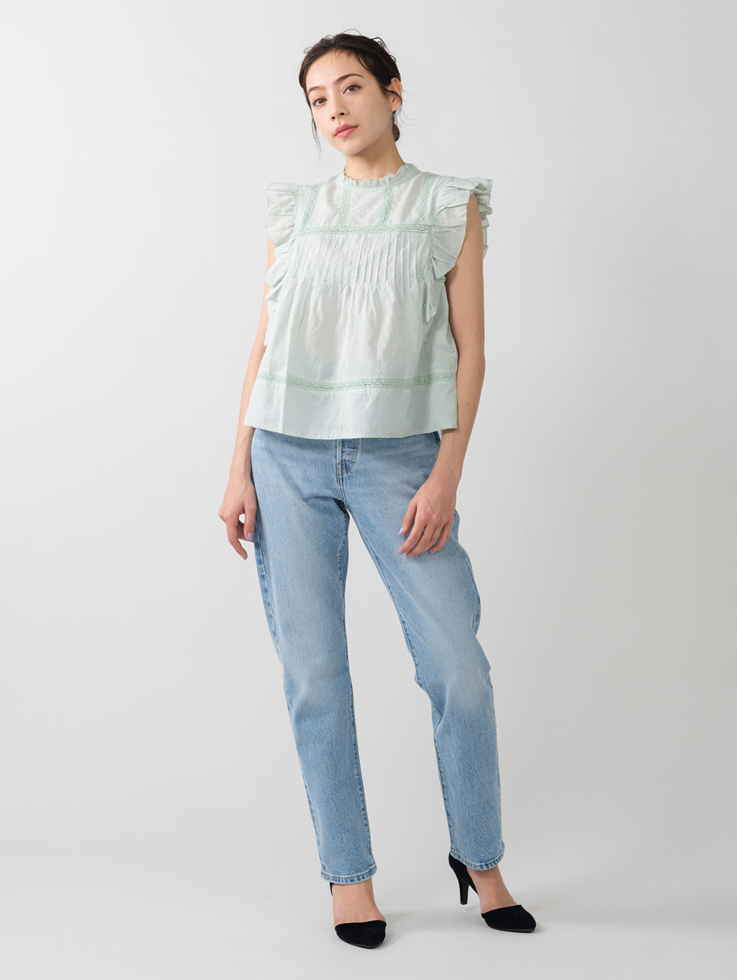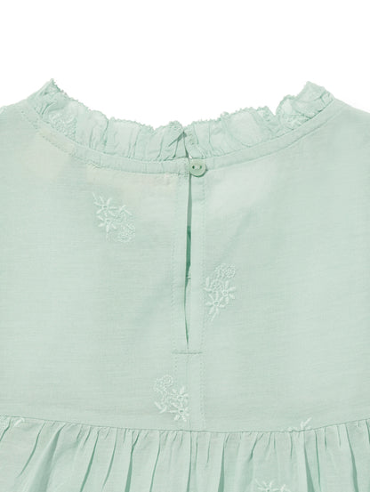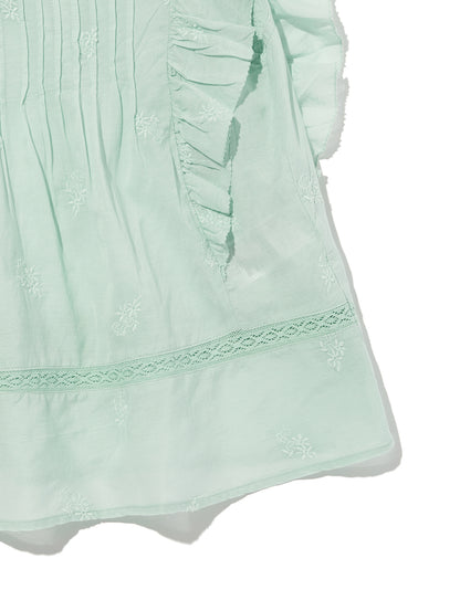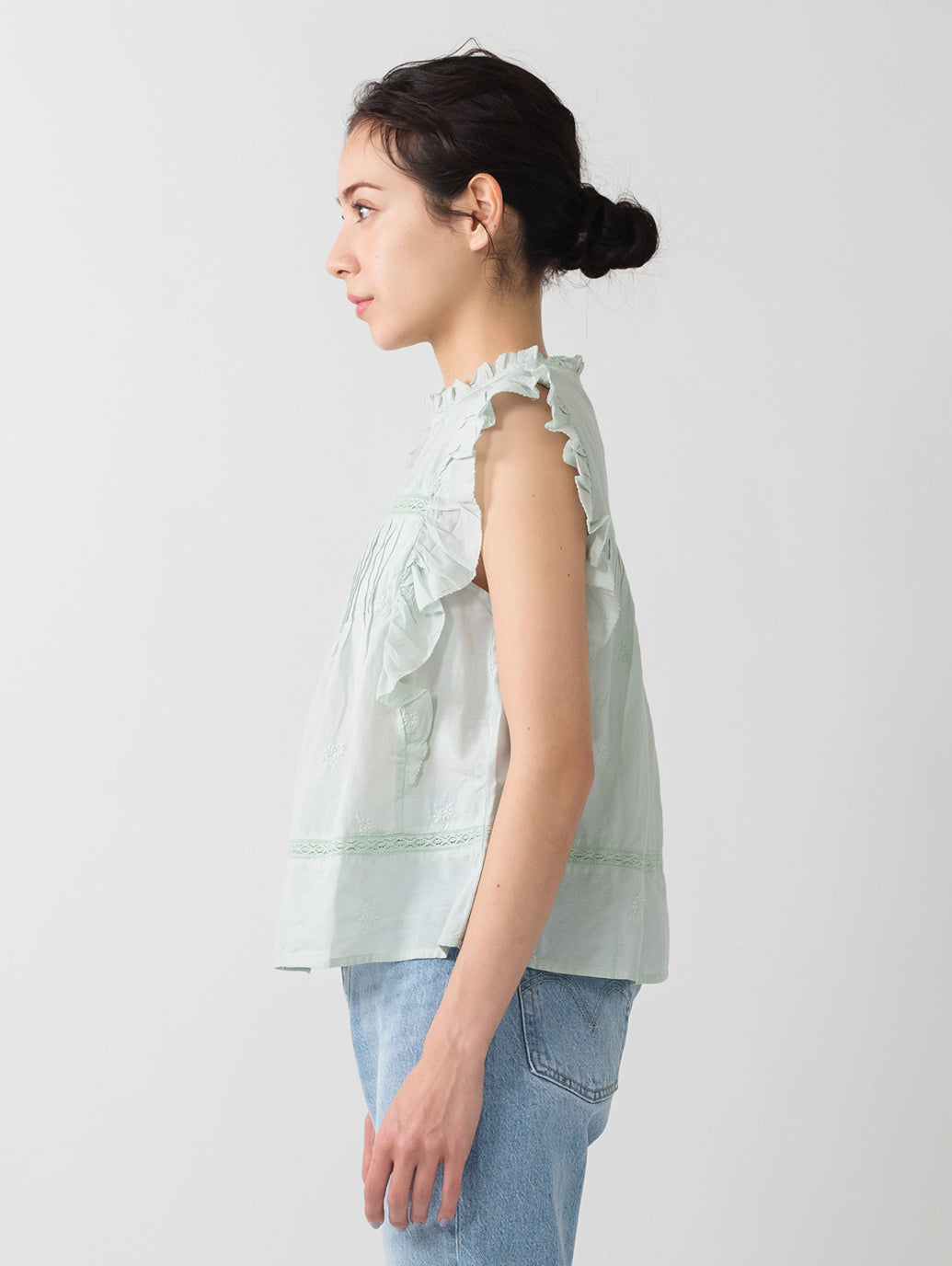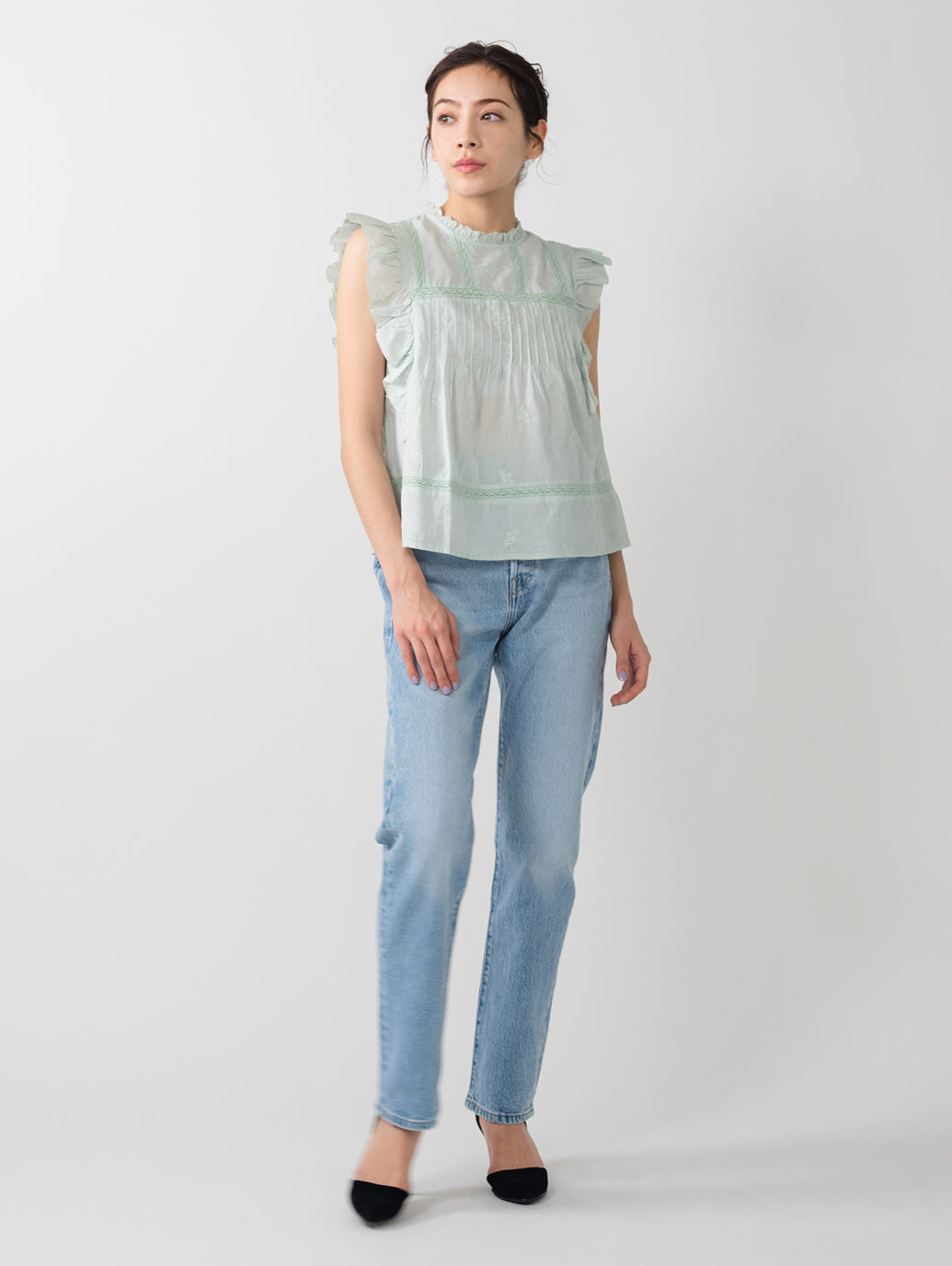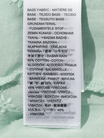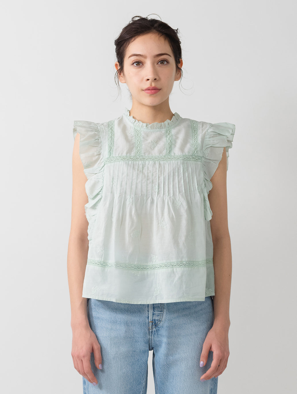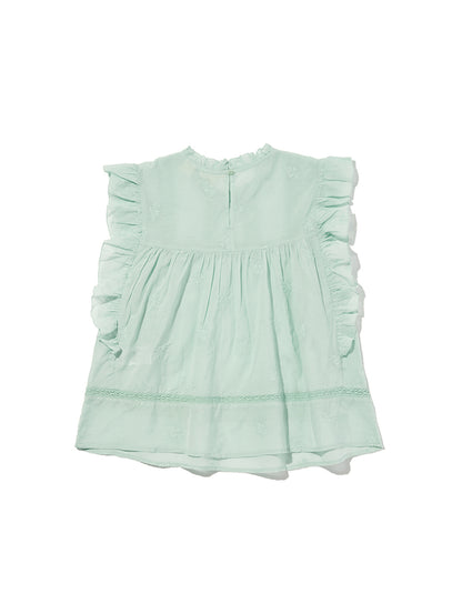 ふんわりとしたシルエットのパステルグリーンカラーのブラウス。フラッタースリーブと高いネックライン、同色のフローラルの刺繍を施して女性らしさをプラスしてくれます。綿にレーヨンを配合しており、ハリがありながらもドレープ感のある生地感で着心地も良好です。春先のスタリングのアクセントに重宝する一着です。