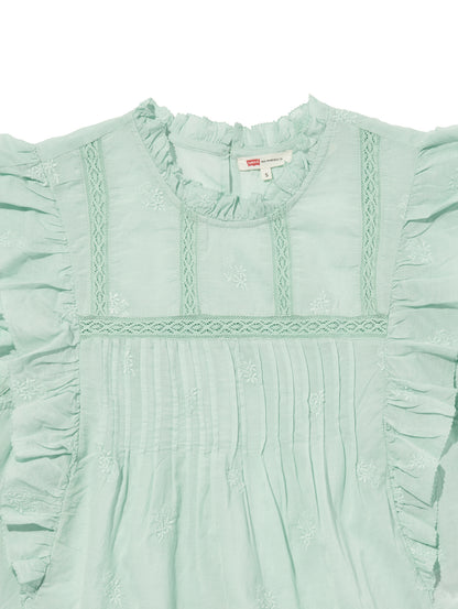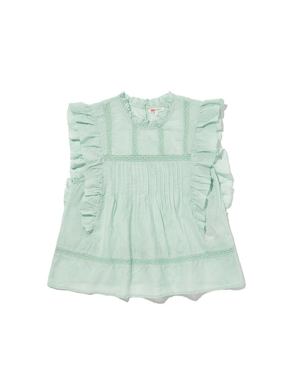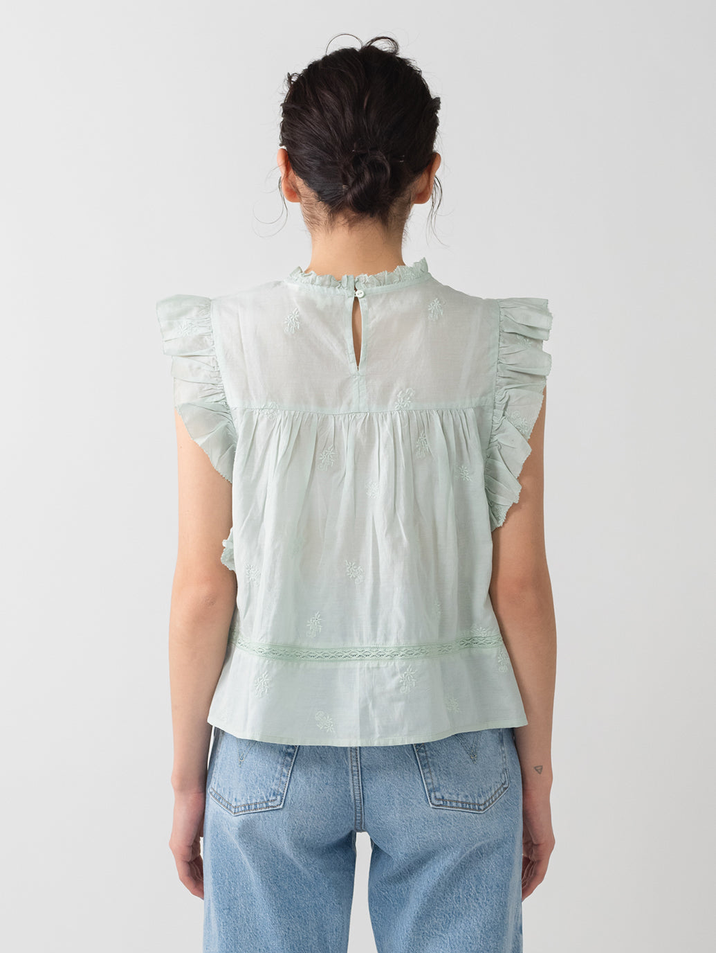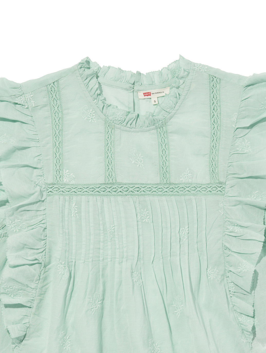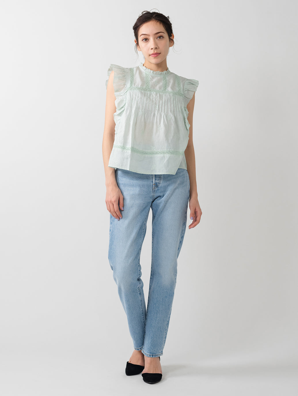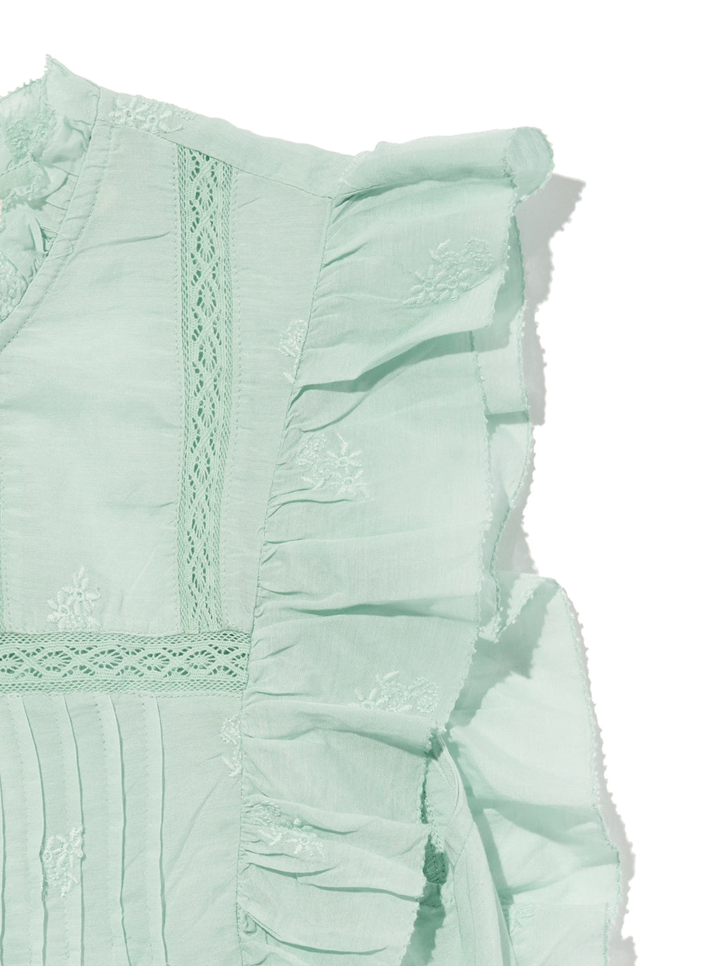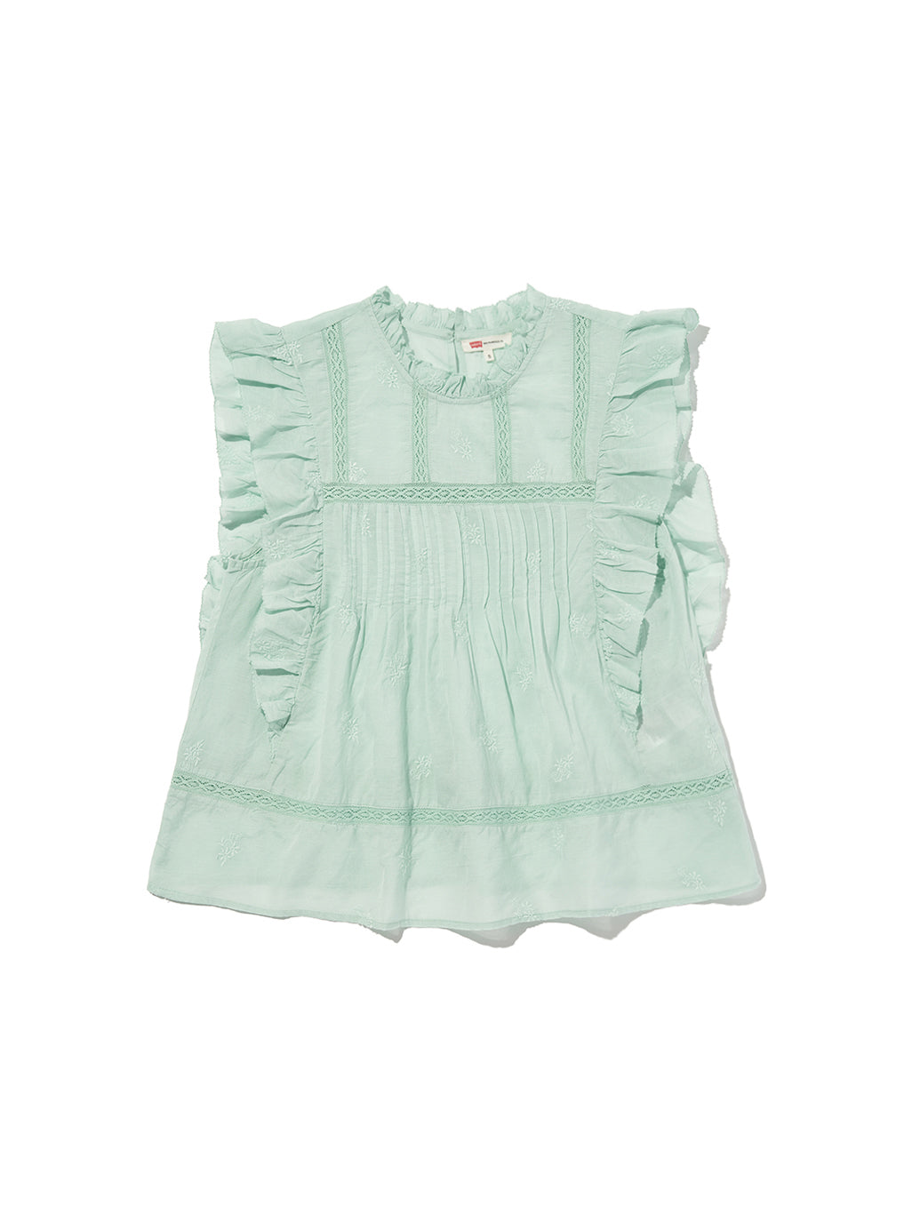ふんわりとしたシルエットのパステルグリーンカラーのブラウス。フラッタースリーブと高いネックライン、同色のフローラルの刺繍を施して女性らしさをプラスしてくれます。綿にレーヨンを配合しており、ハリがありながらもドレープ感のある生地感で着心地も良好です。春先のスタリングのアクセントに重宝する一着です。