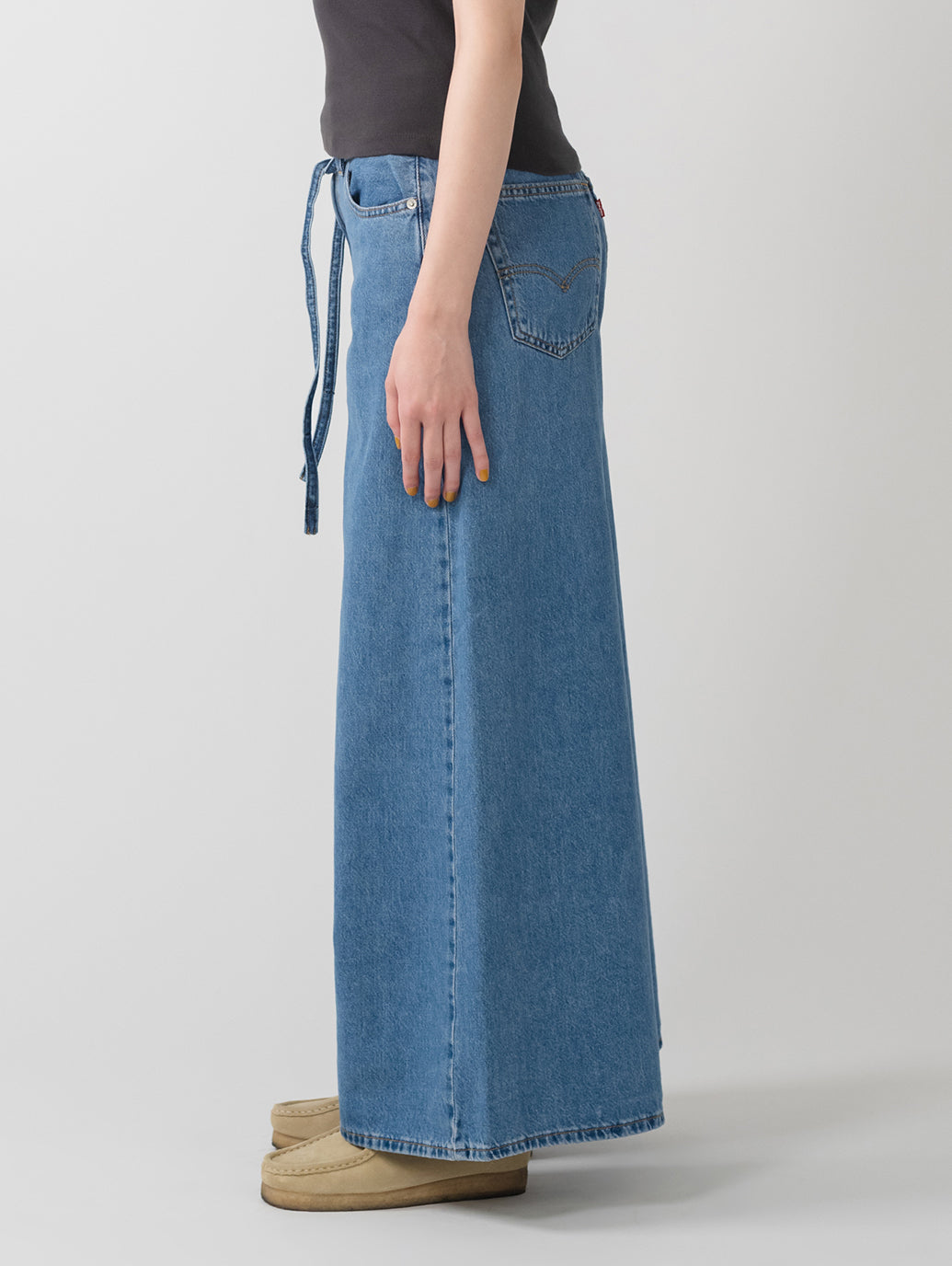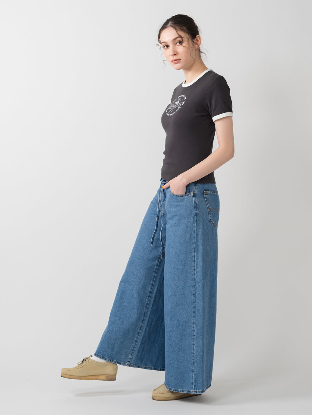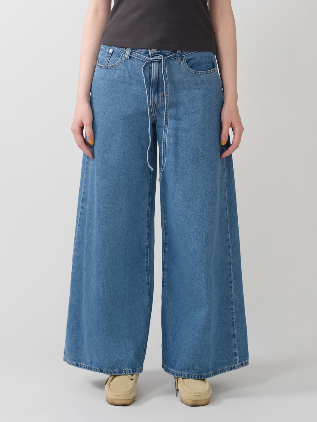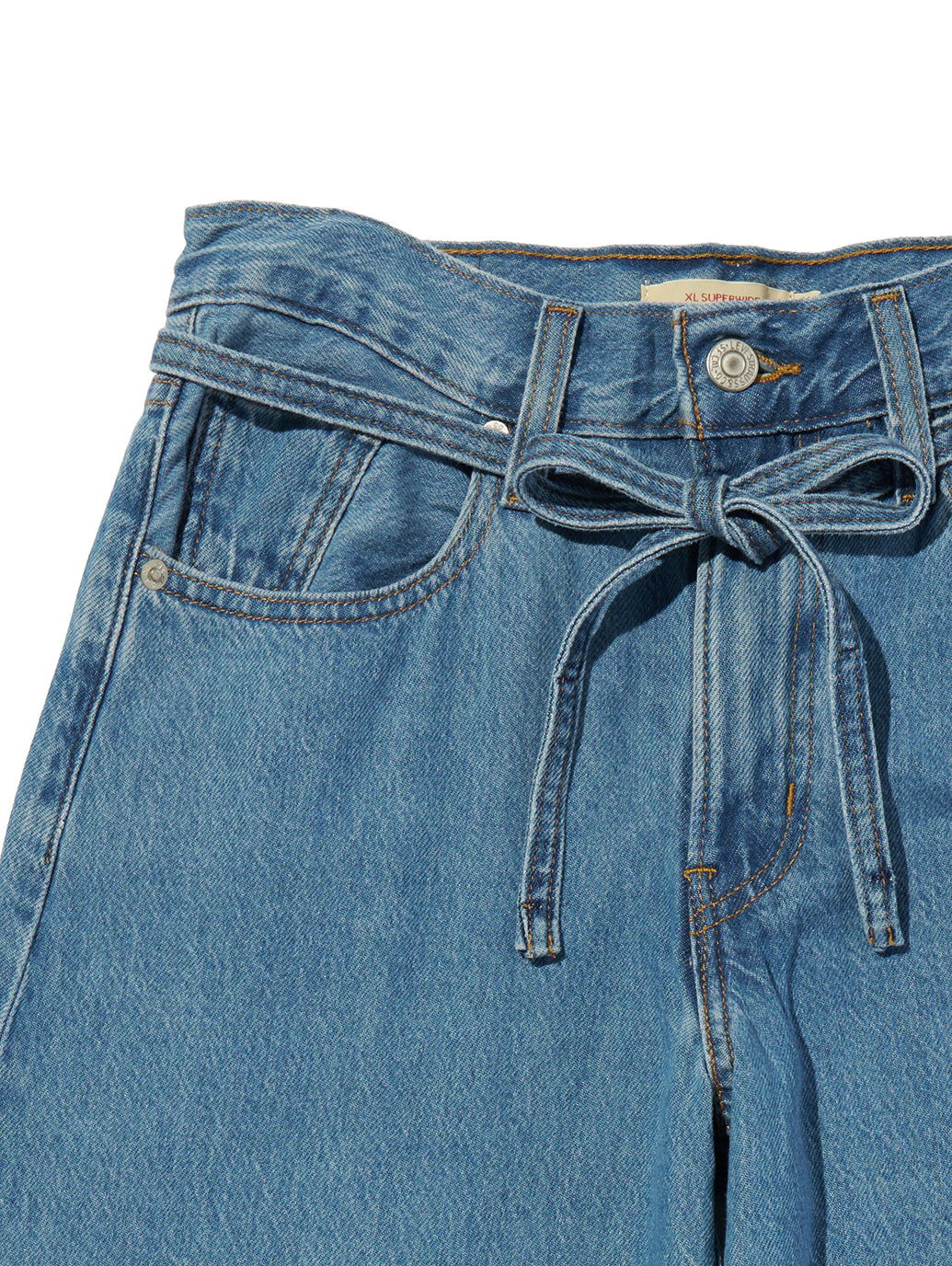 オーバーサイズのバギースタイルと特にワイドなレッグ、そして着やすいミッドライズを、XLスーパーワイドジーンズに取り入れました。さらに、調節可能なタイベルト仕様、ライトインディゴカラーなので、春先にぴったりで幅広い着こなしを楽しめる一本です。