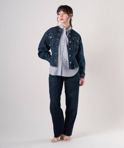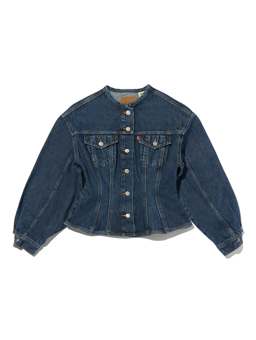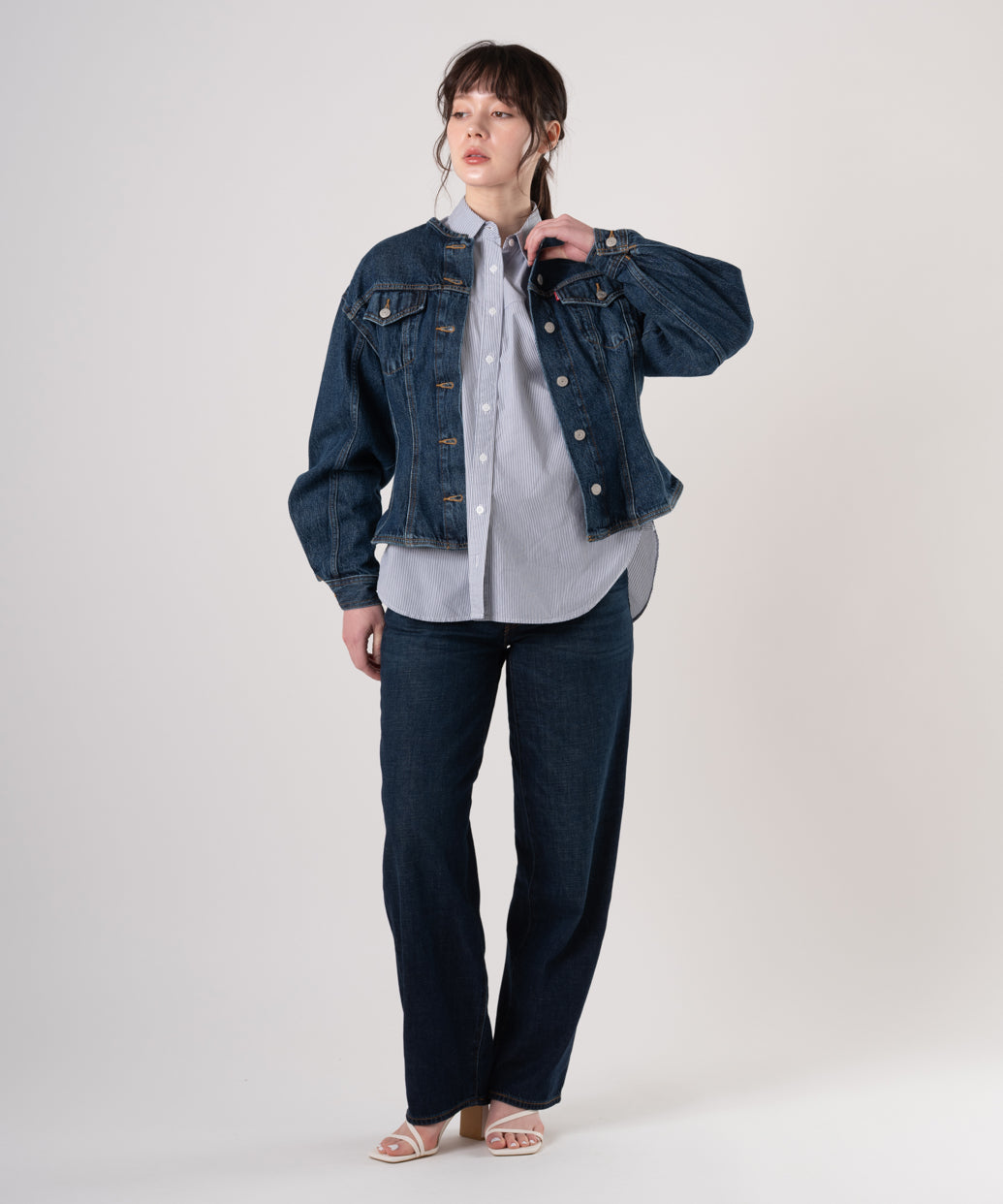 Levi's®の定番アイテムであるトラッカージャケット。ボディのベースは全体的にゆとりのあるシルエットであるものの、ウエストにかけて絞りを強めに効かせたシルエットにして女性らしいくびれラインを強調したデザインです。襟もノーカラー仕様にして、抜け感とメリハリを上手く落とし込んだ拘りの詰まった一着です。
