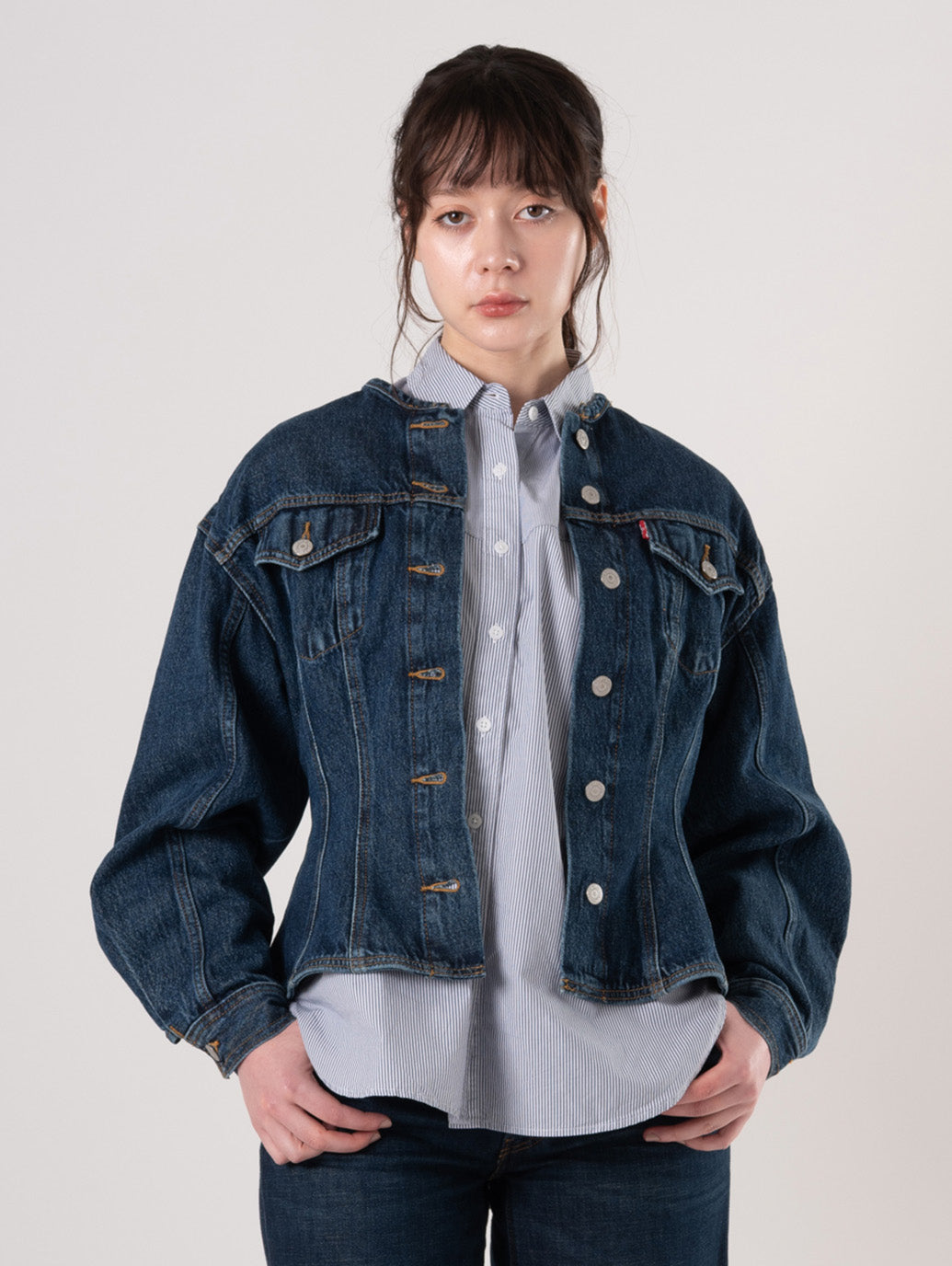 Levi's®の定番アイテムであるトラッカージャケット。ボディのベースは全体的にゆとりのあるシルエットであるものの、ウエストにかけて絞りを強めに効かせたシルエットにして女性らしいくびれラインを強調したデザインです。襟もノーカラー仕様にして、抜け感とメリハリを上手く落とし込んだ拘りの詰まった一着です。