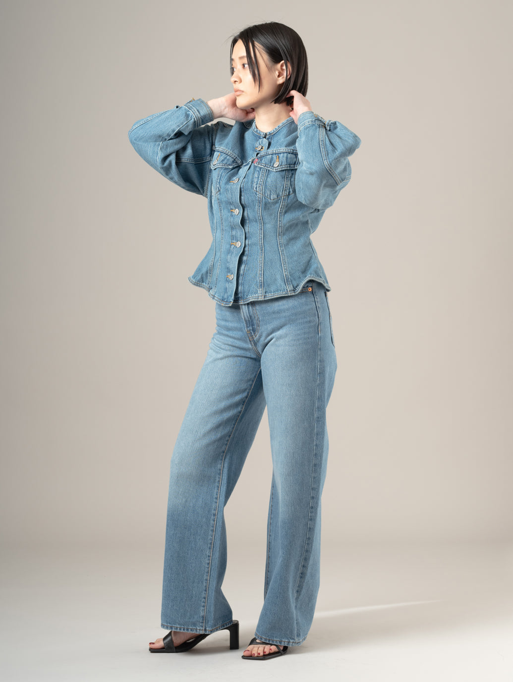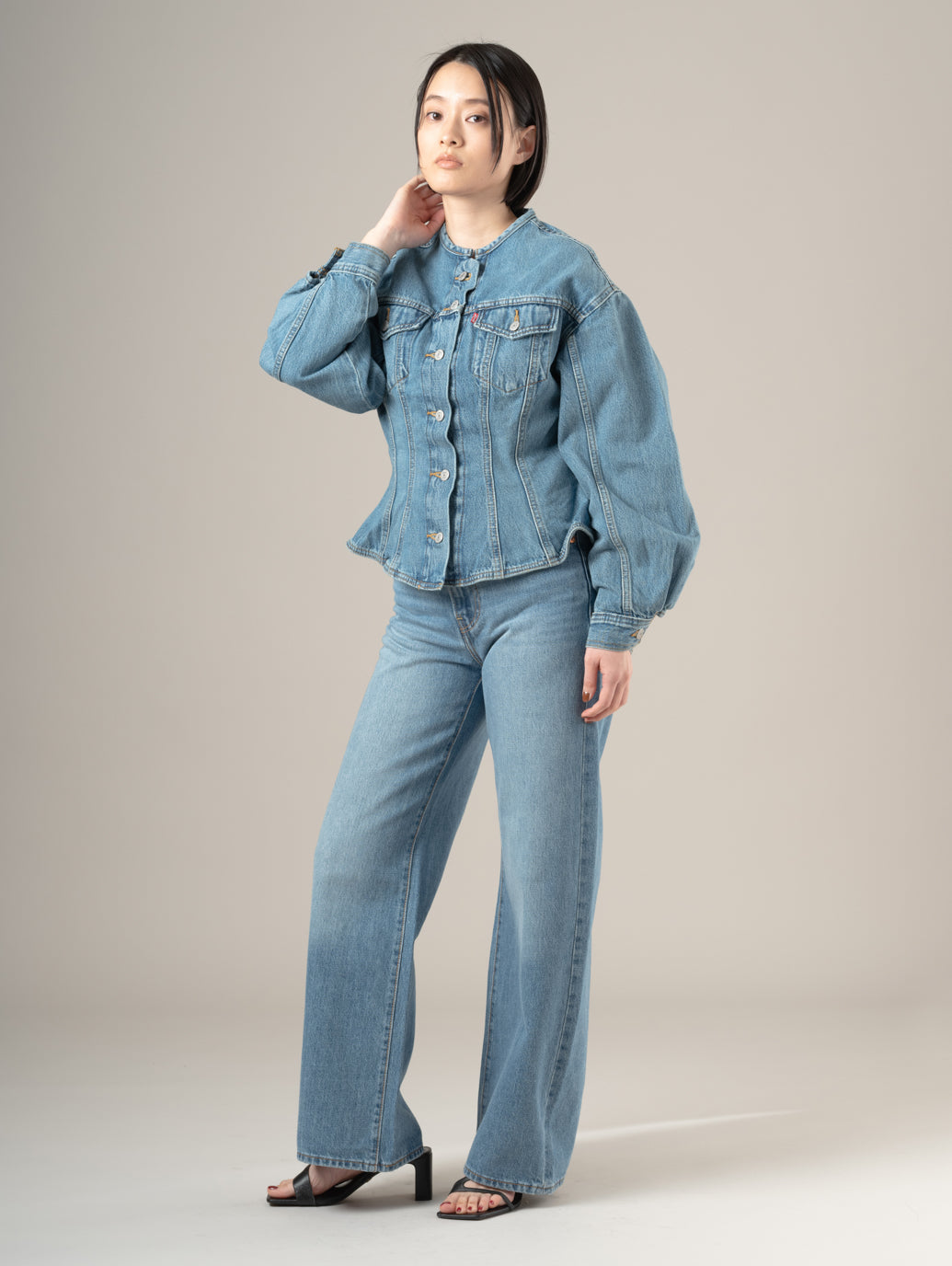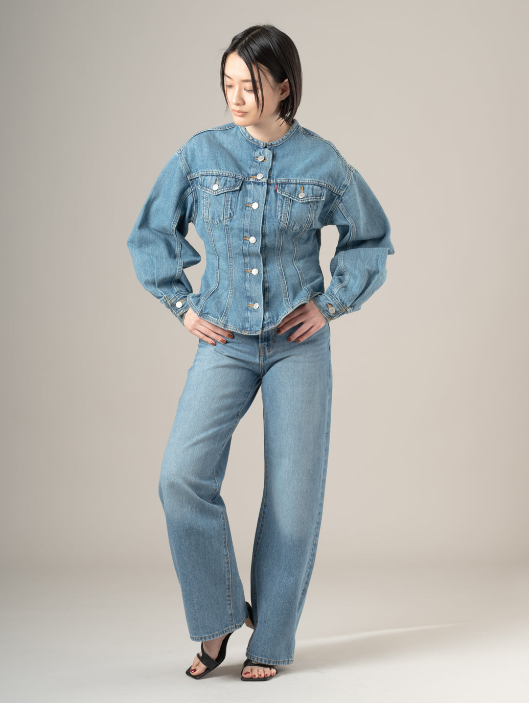 Levi's®の定番アイテムであるトラッカージャケット。ボディのベースは全体的にゆとりのあるシルエットであるものの、ウエストにかけて絞りを強めに効かせたシルエットにして女性らしいくびれラインを強調したデザインです。襟もノーカラー仕様にして、抜け感とメリハリを上手く落とし込んだ拘りの詰まった一着です。