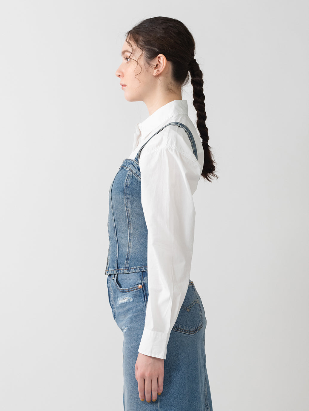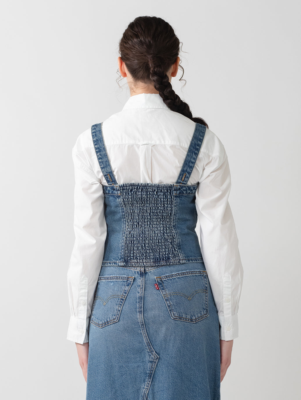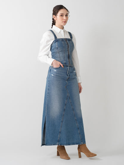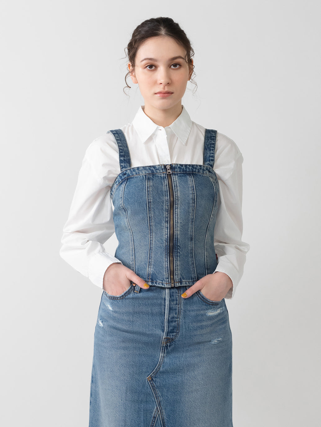 Levi'sらしくデニム生地を使用したスカルプドビスチェ。コルセット風のデザイン、フロントジップアップのスリムフィットが特徴で、春先にはシャツの上に合わせる着こなしもお勧めです。ストラップは取り外し可能でオールシーズン活躍するアイテムです。