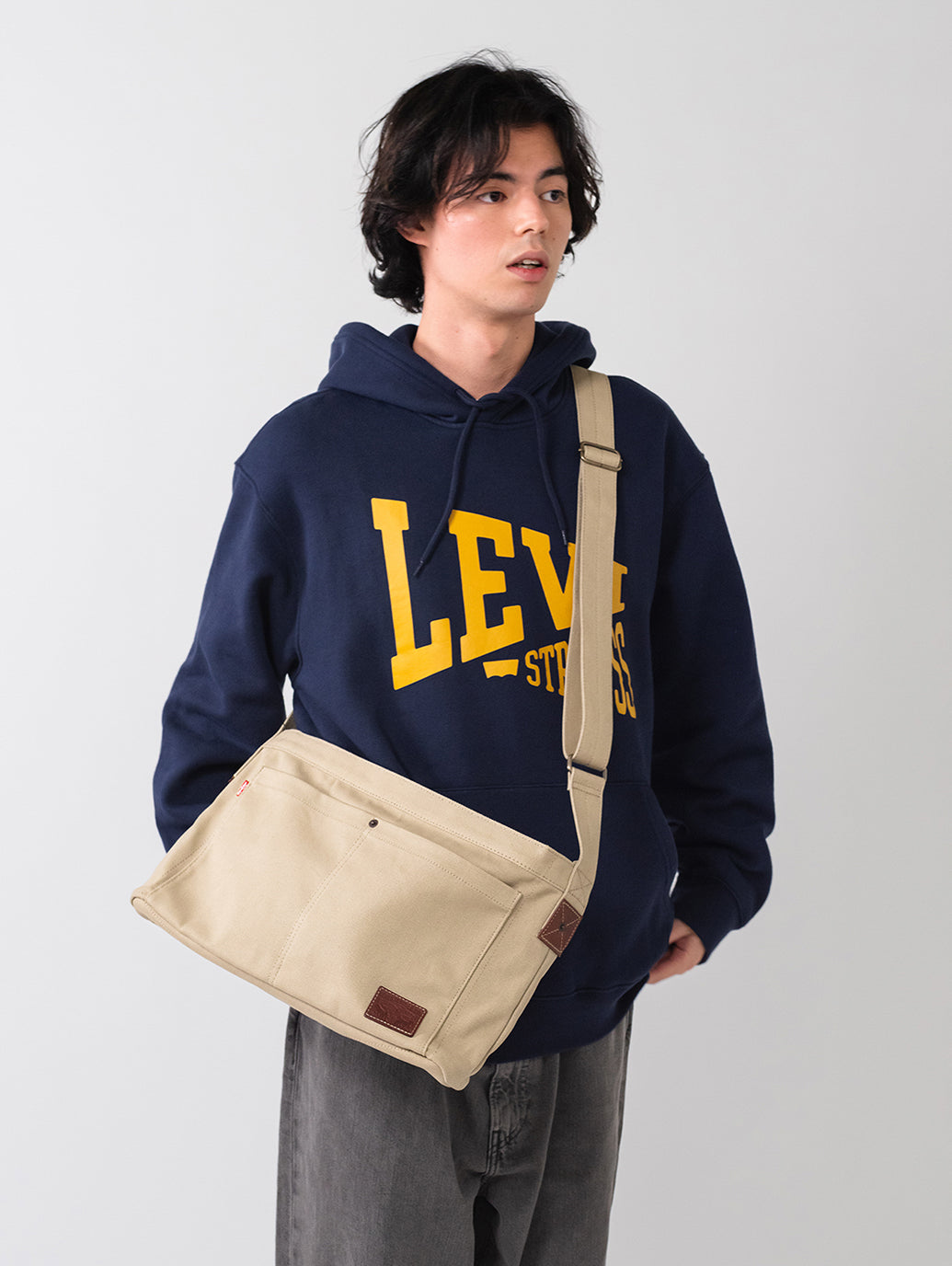 Levi’sらしく耐久性に優れたコットンキャンバスを使用したメッセンジャーバッグ。8.5Lの容量で広々とした内部、調節可能なストラップが特徴です。外側・内側ともにポケットを配し、小物を整理しやすくちょっとした旅行や外出にお勧めのアイテムです。