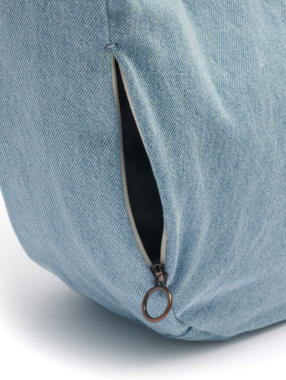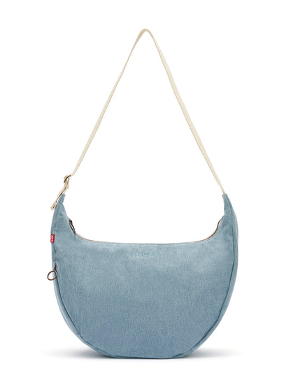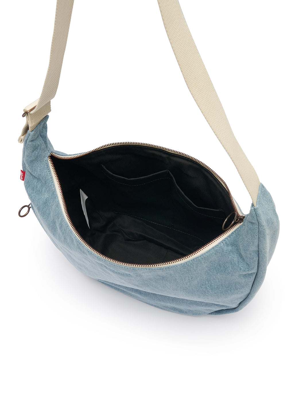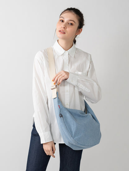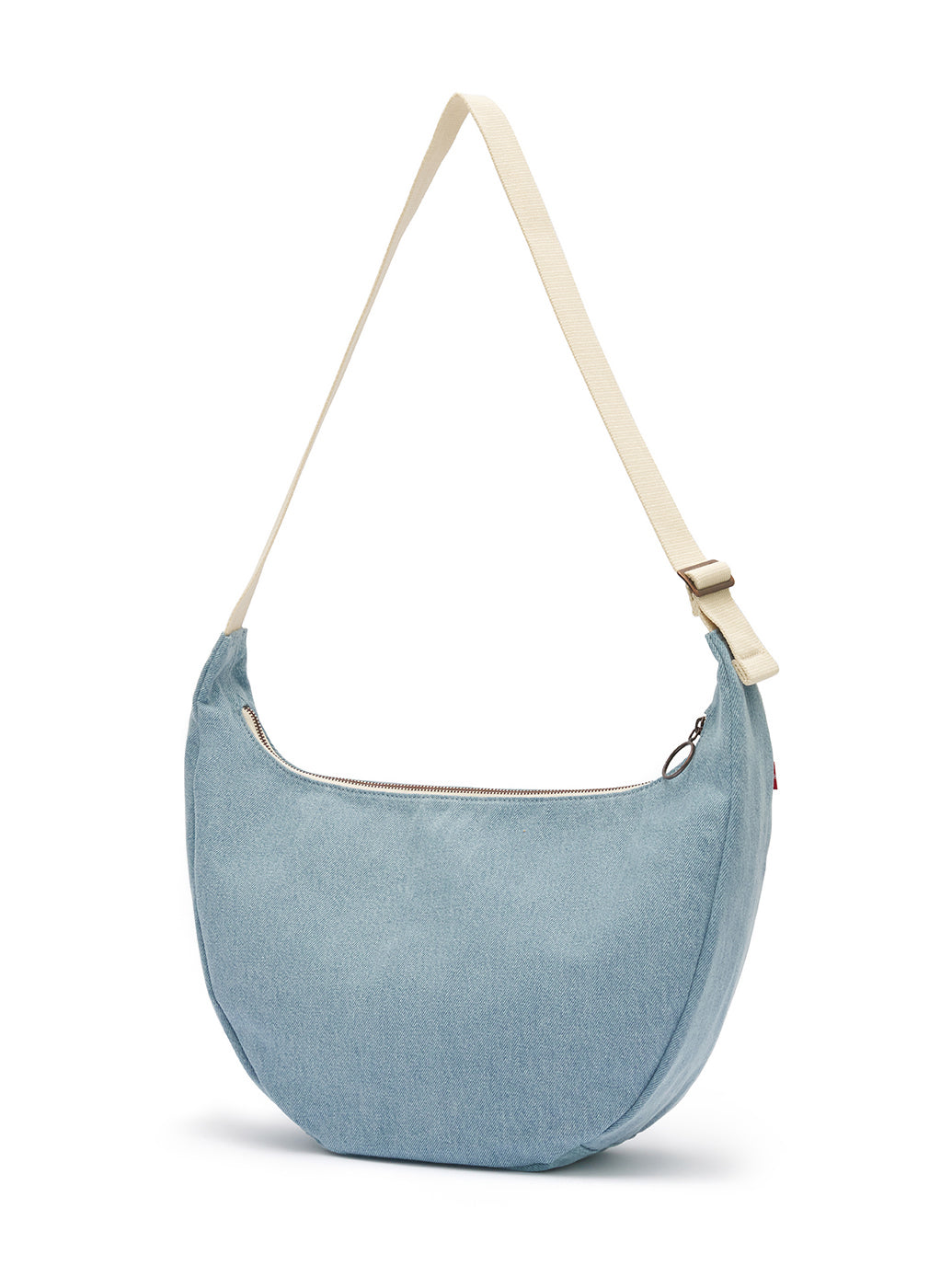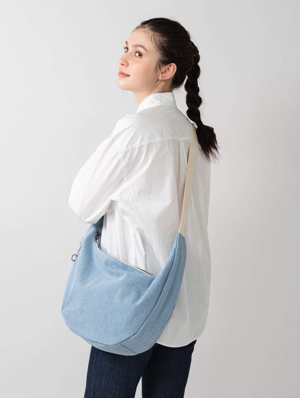 ライトインディゴカラーに同色の刺繍ロゴを配したデザインの・マークのショルダーバッグ。13Lの容量で必需品を十分に収納可能なサイズです。外側にもポケットを配しており小物をサラッと入れることも出来ます。どの季節にも持っていると便利なアイテムです。