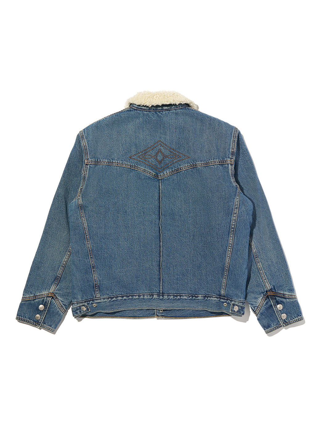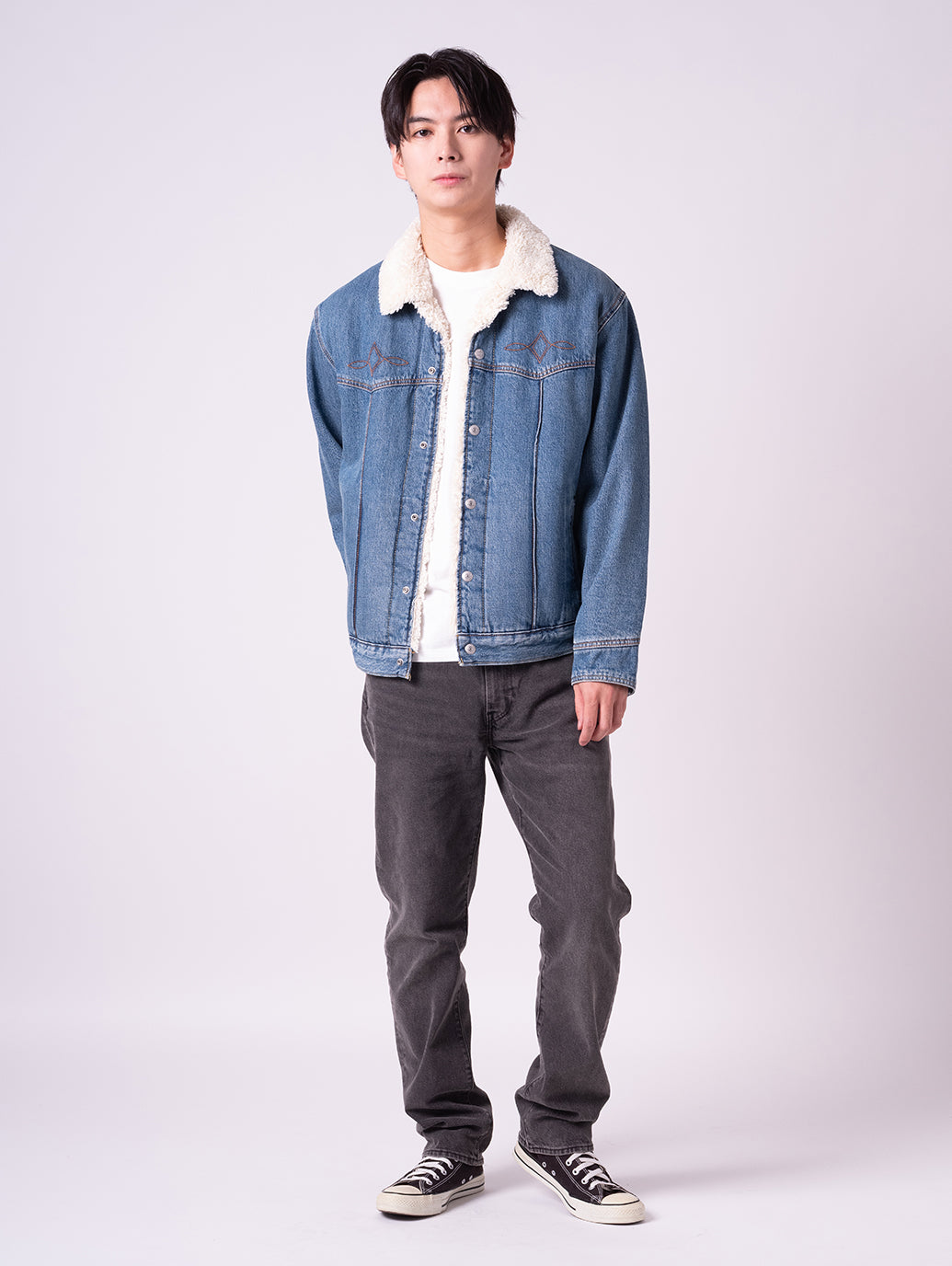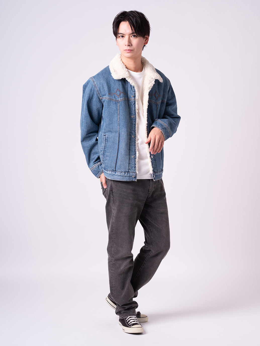 クラシックなデニムジャケットに、シーズンムードを添えたウエスタン シェルパージャケット。