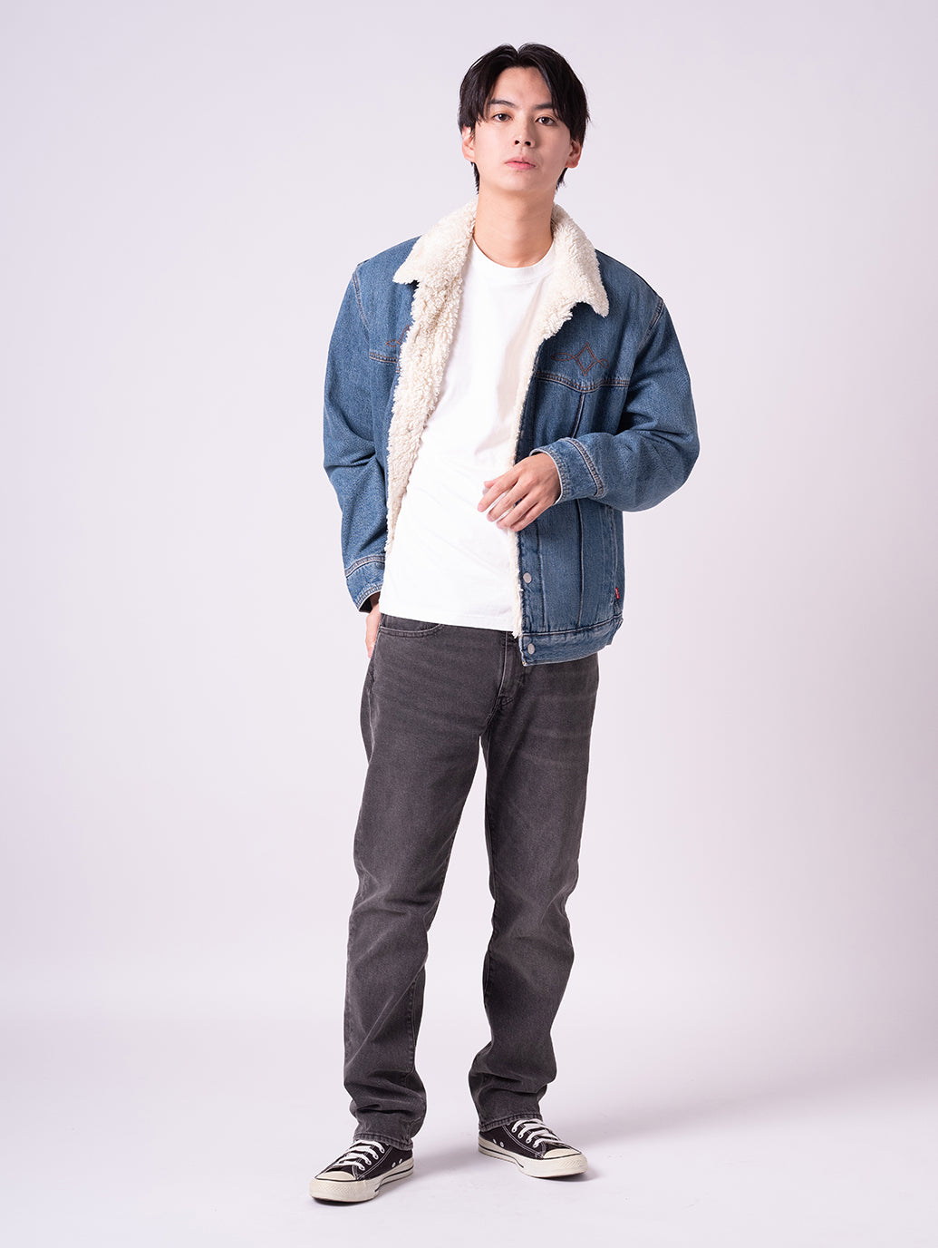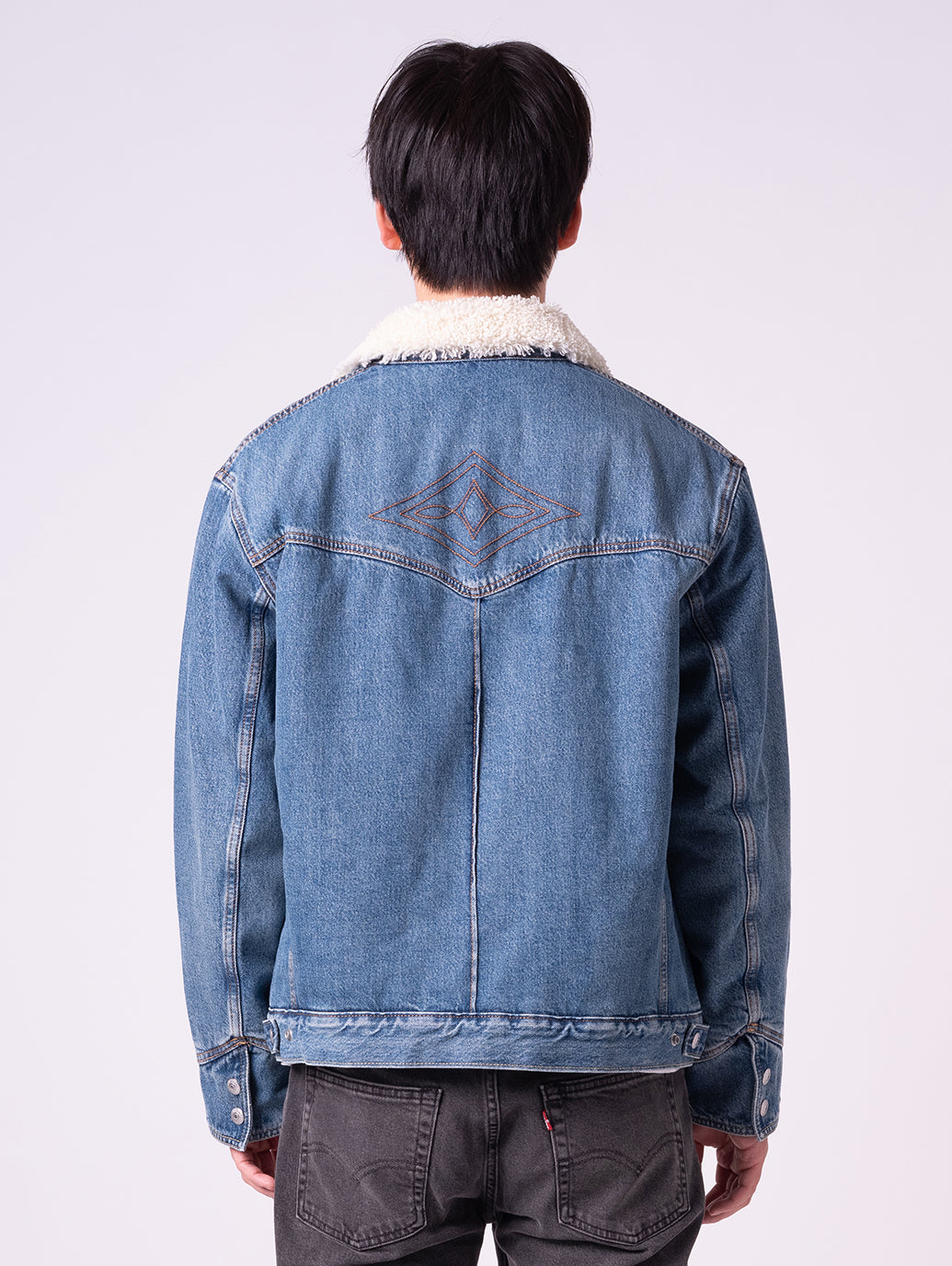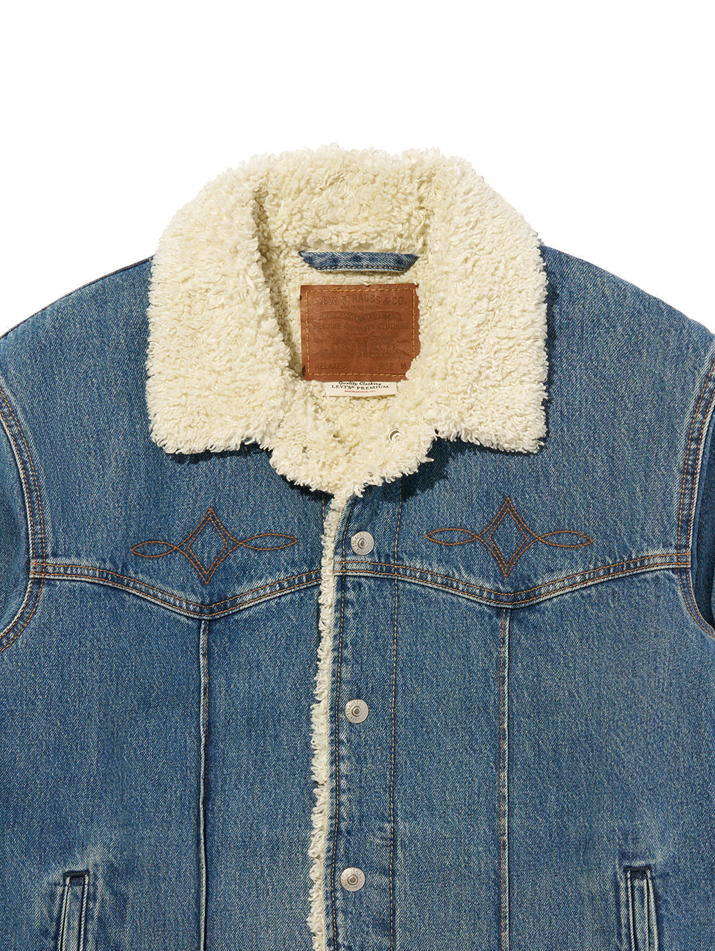 クラシックなデニムジャケットに、シーズンムードを添えたウエスタン シェルパージャケット。
