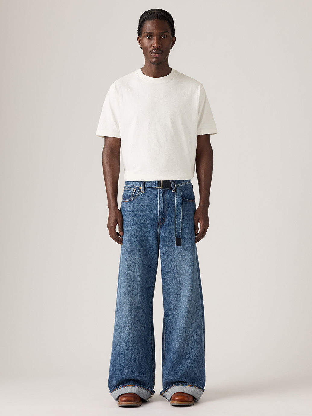 この限定版デニムパンツは、超ワイドでゆったりとしたシルエット、ミッドライズフィット、7ポケットデザインが特徴です。ウェルトポケットと、ブランドロゴ入りのリバーシブルベルトも付いています。